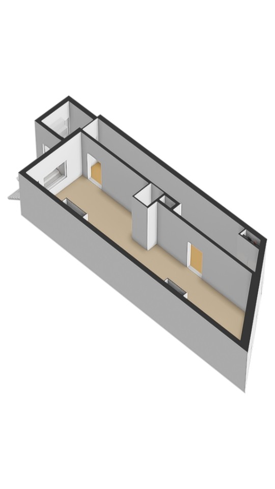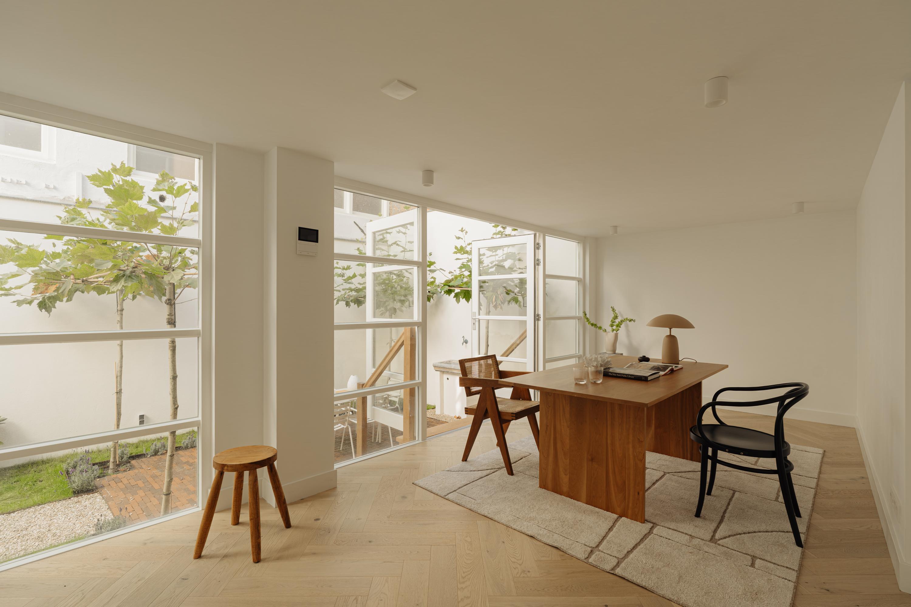 - Op de begane grond bevindt zich een open ruimte met hoge ramen en een warme houten vloer, ideaal als werkruimte, gastenverblijf of creatieve studio.