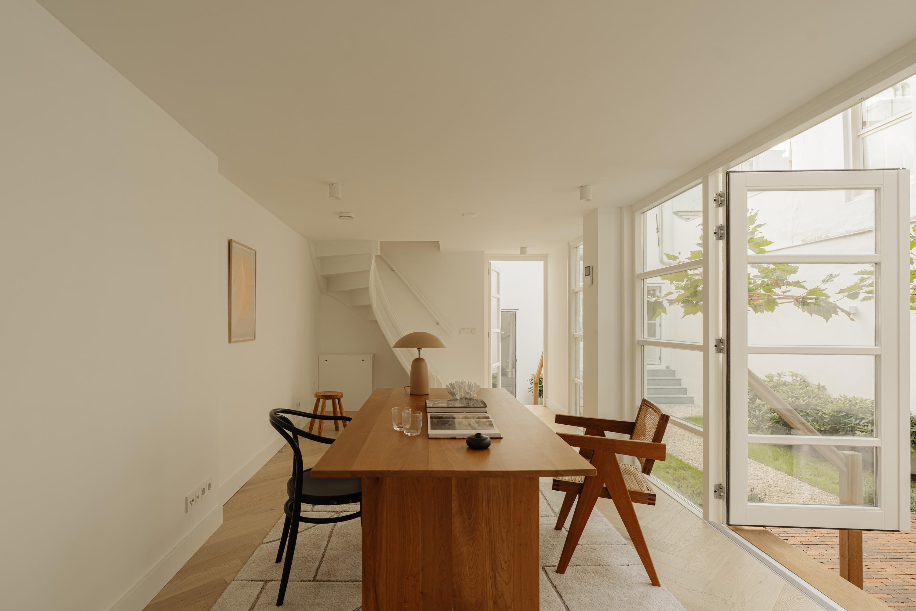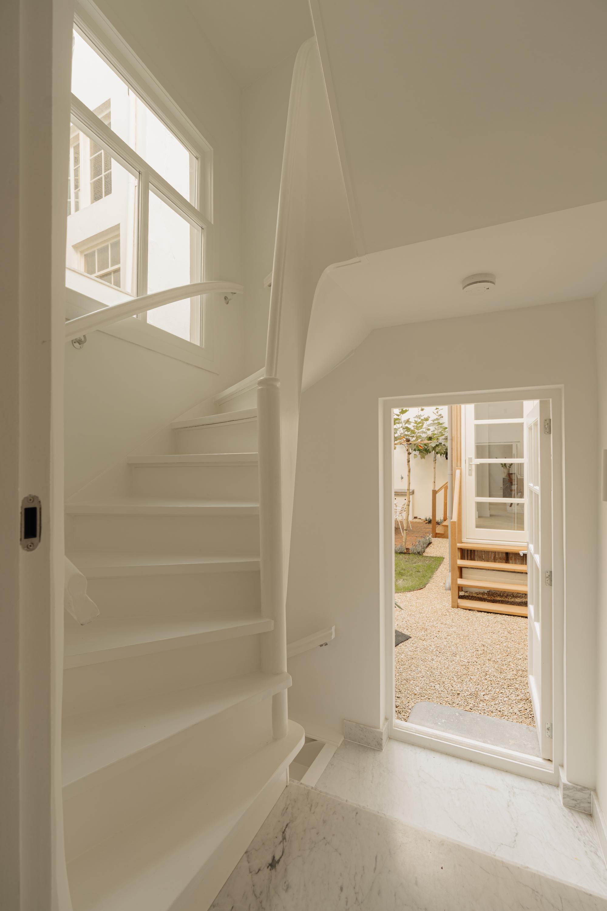 Aan de achterzijde van het pand bevindt zich een ruime, beschutte stadstuin — een oase van rust midden in het centrum van Amsterdam. De tuin is fraai aangelegd met natuurlijke materialen en groene accenten die perfect aansluiten bij de sfeer van het interieur.