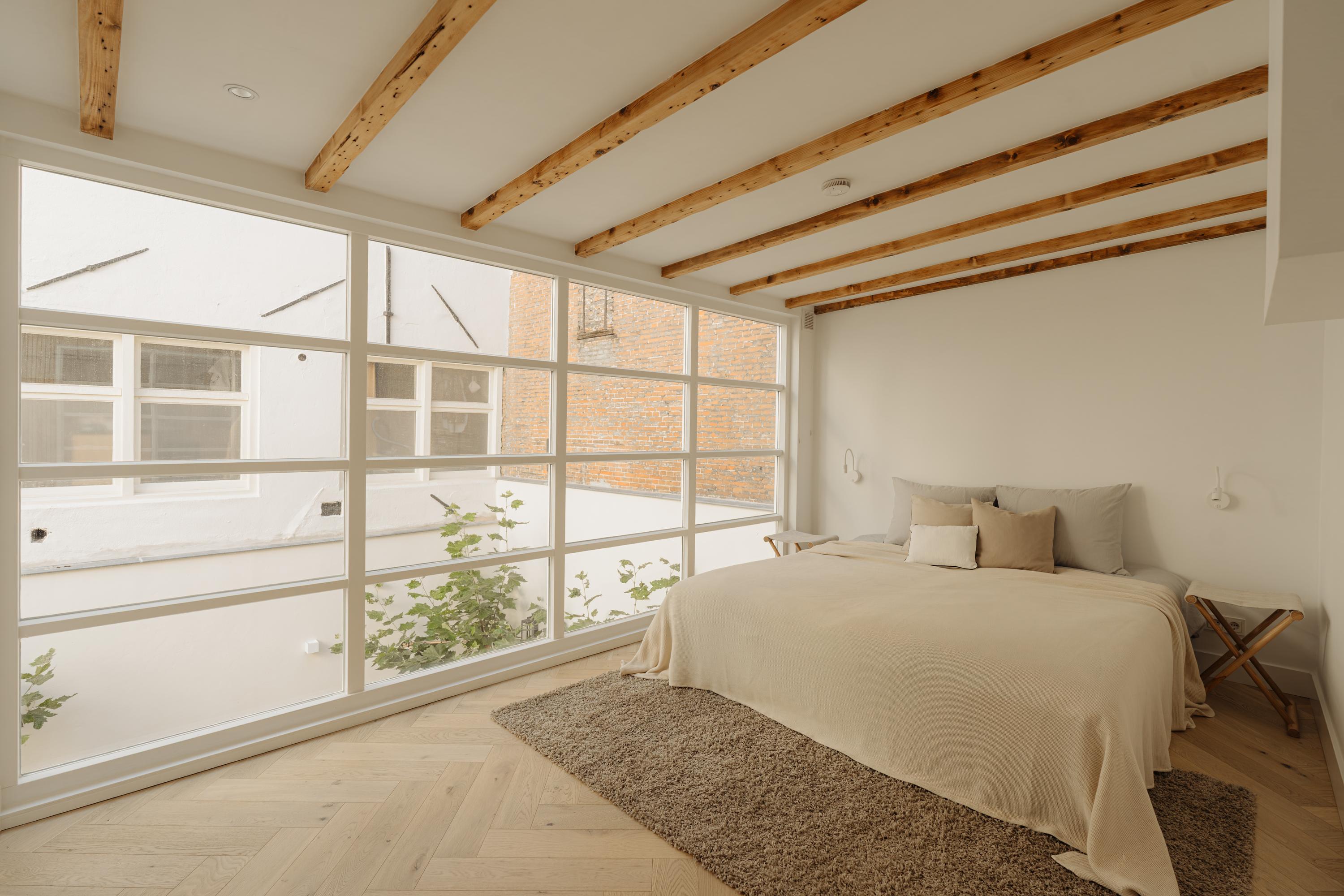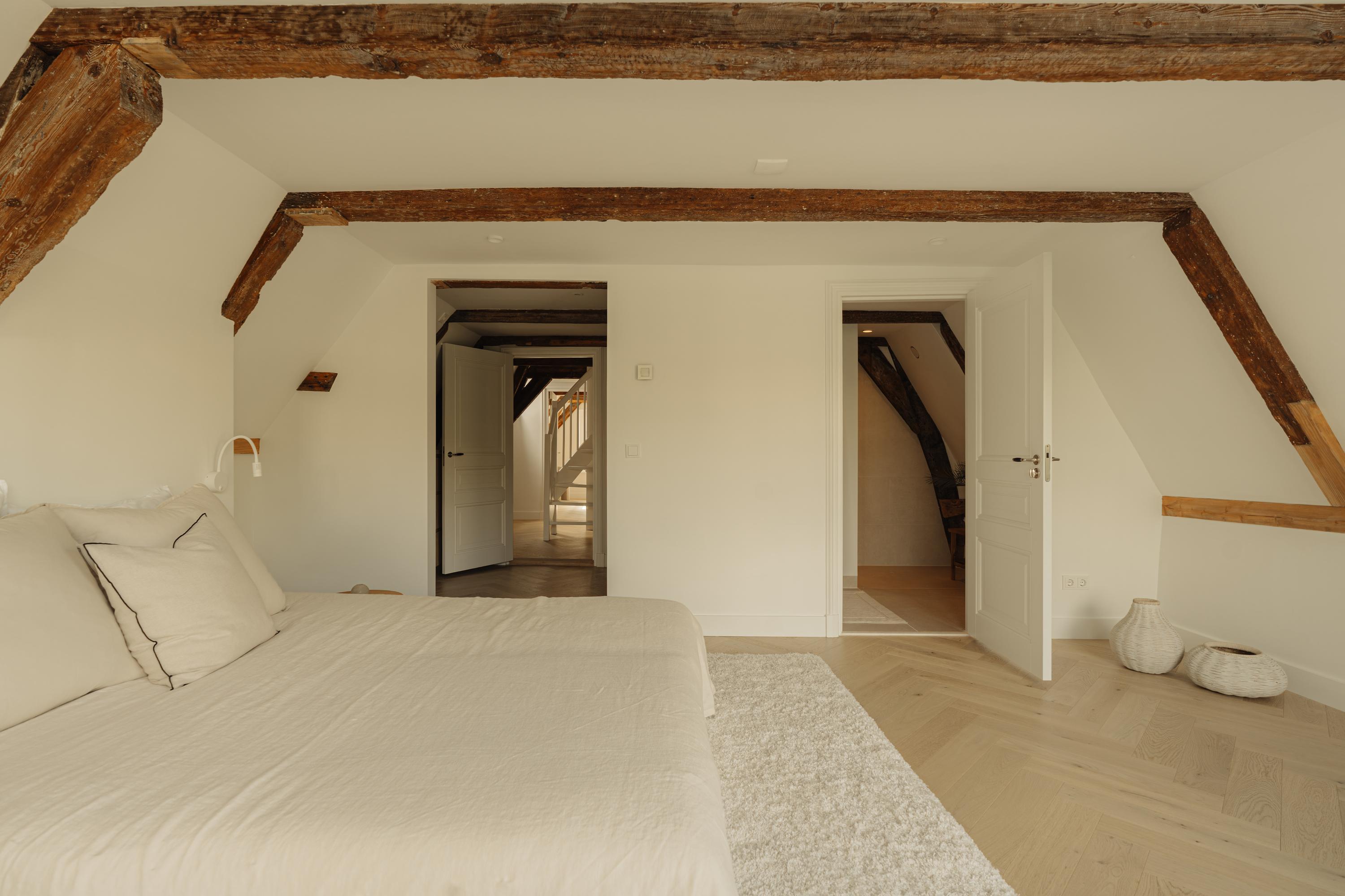 - Op de eerste verdieping een lichte slaapkamer met houten balken, grote raampartijen en een eigen badkamer met douche, wastafel en toilet.