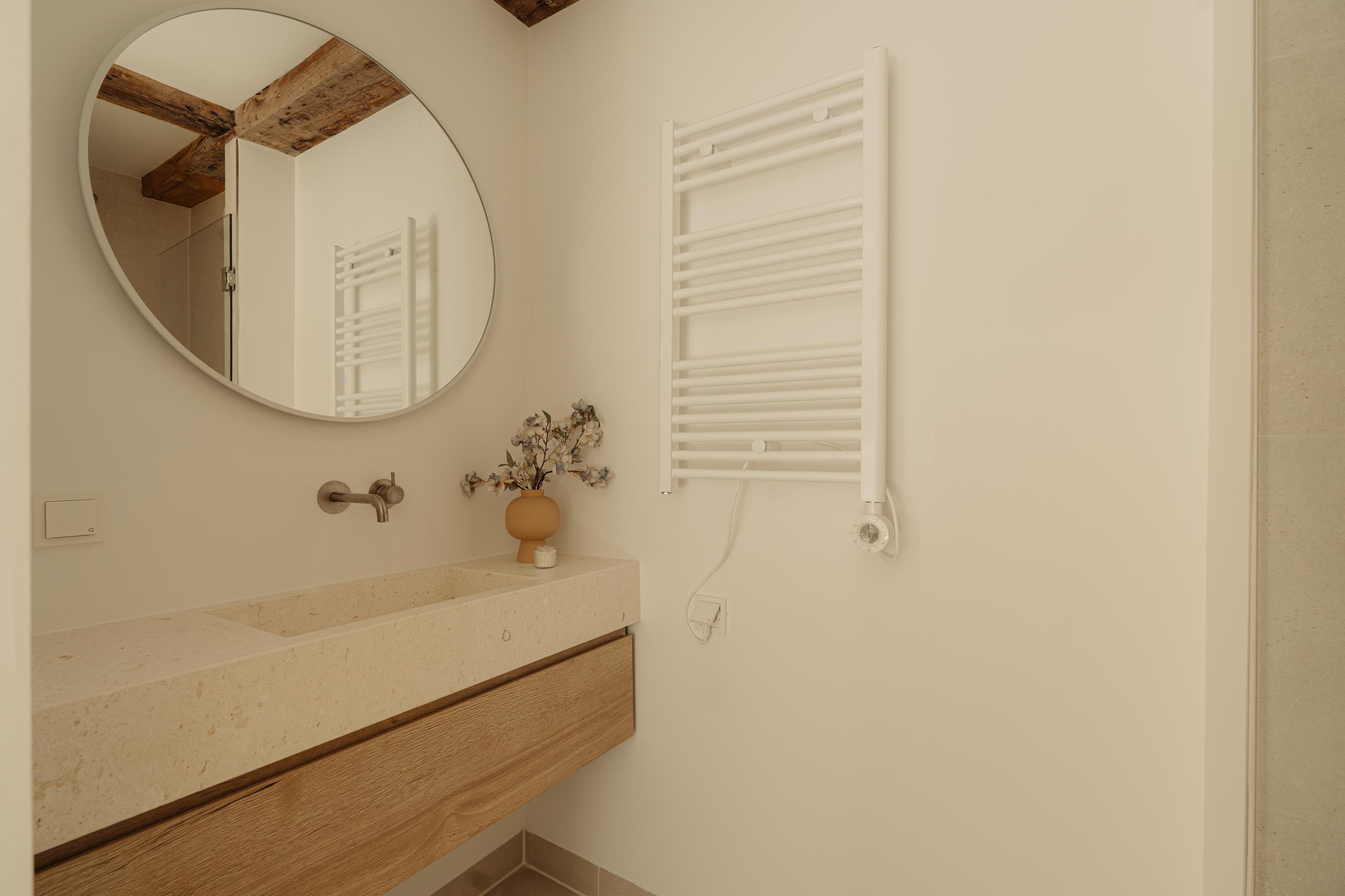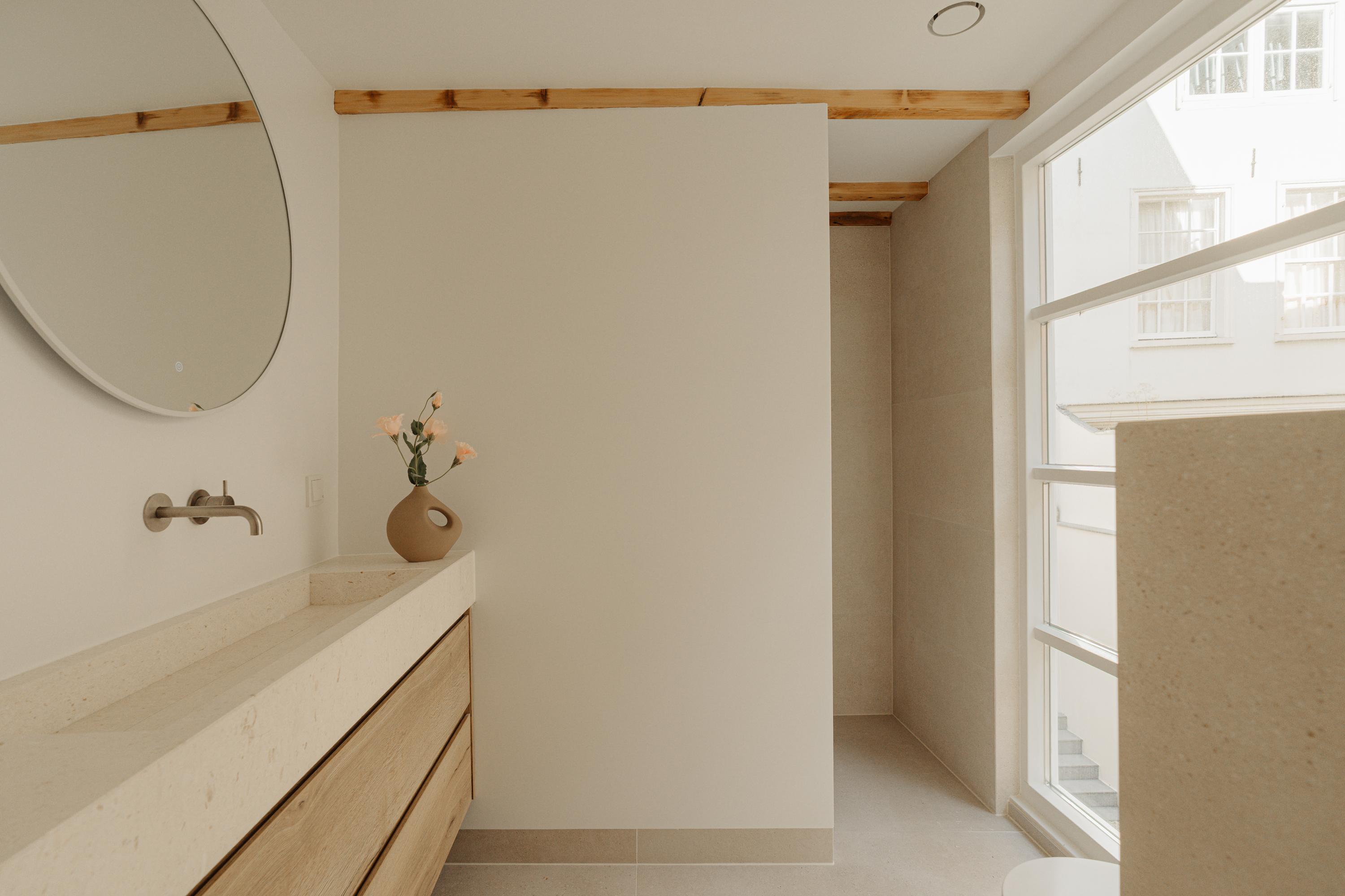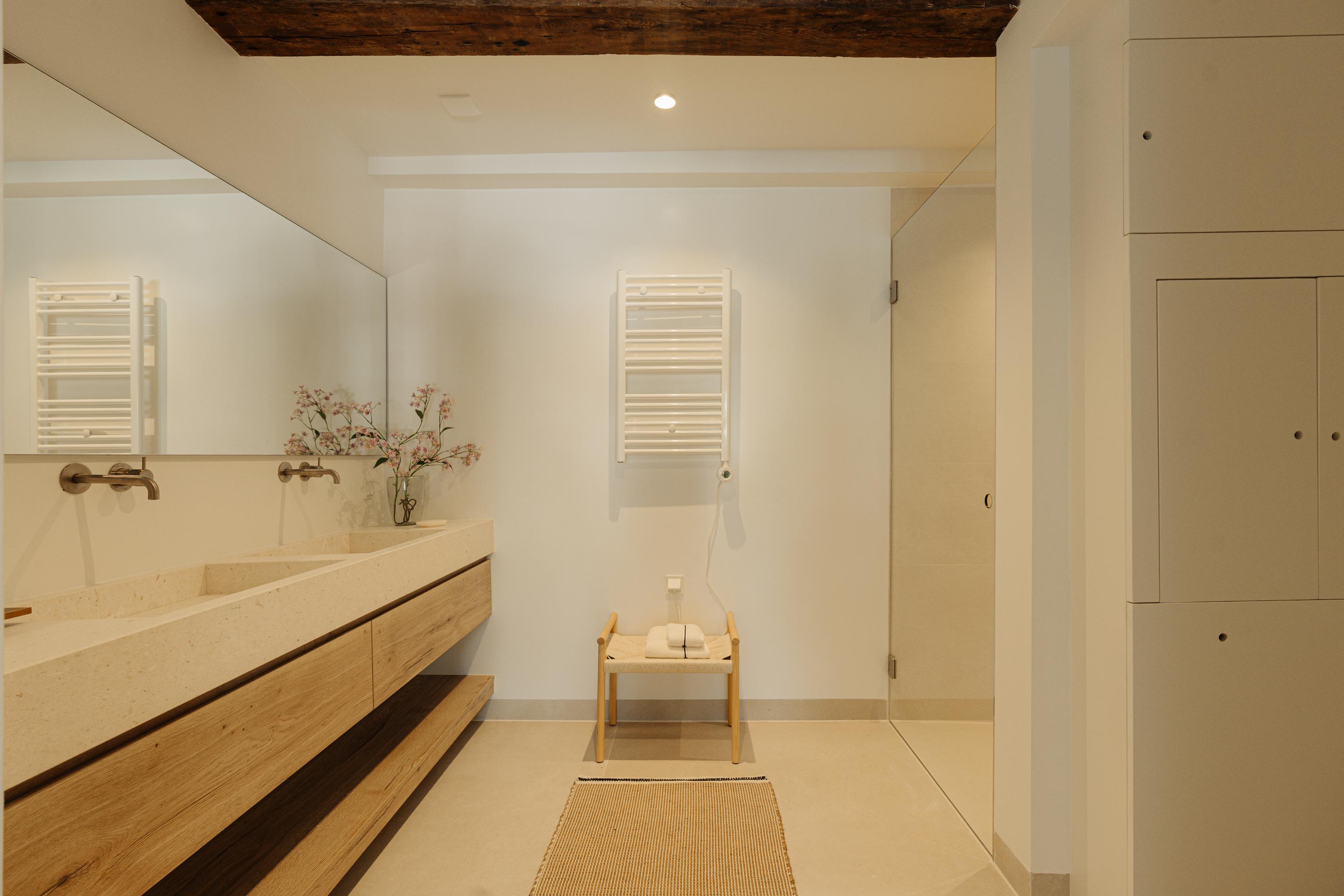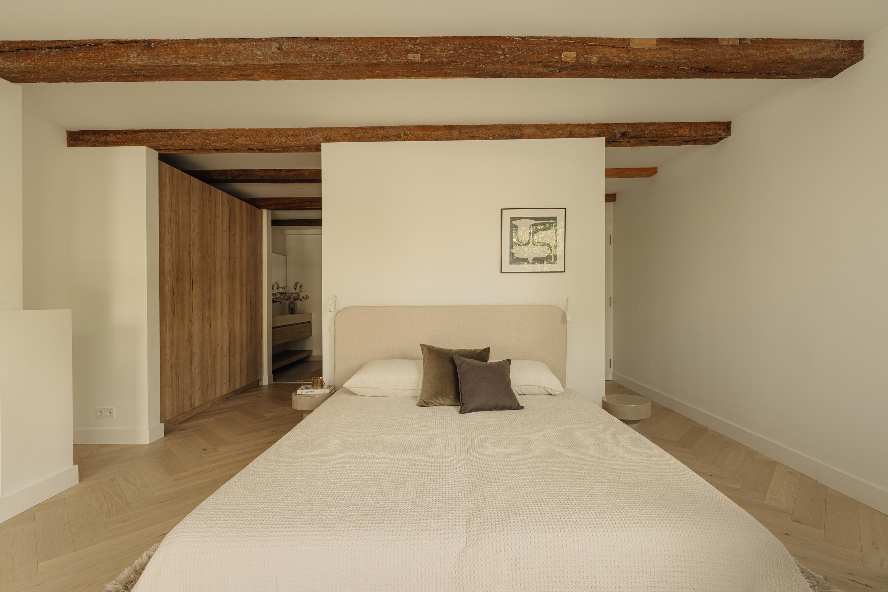 De inloopkast met maatwerkkasten verbindt de slaapkamer met de aangrenzende badkamer ensuite, waar rust en eenvoud de toon zetten. Hier vormen natuursteen, hout en zacht licht een harmonieus geheel. De badkamer is voorzien van een dubbele wastafel, inloopdouche en hoogwaardige afwerking in natuurlijke tinten.