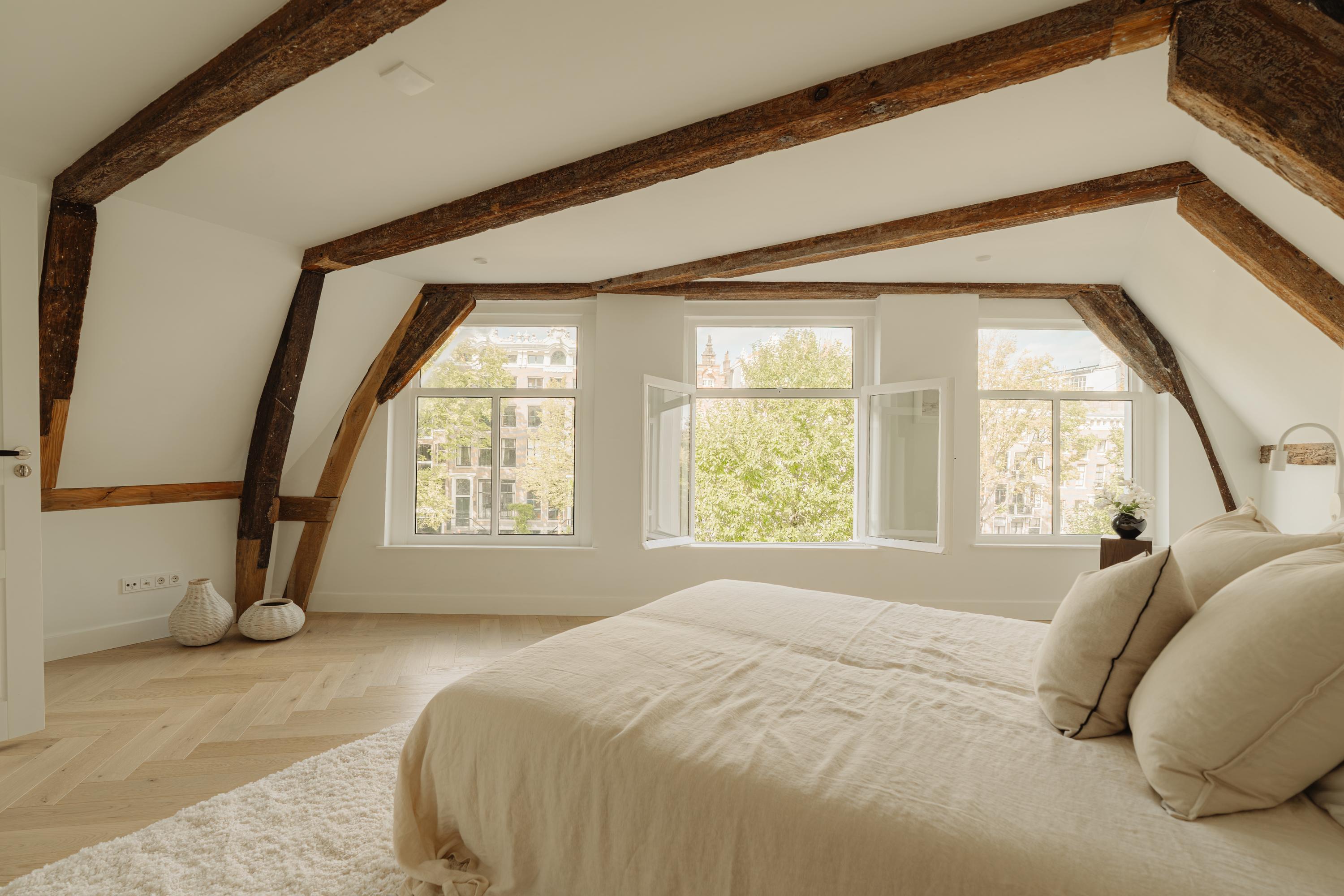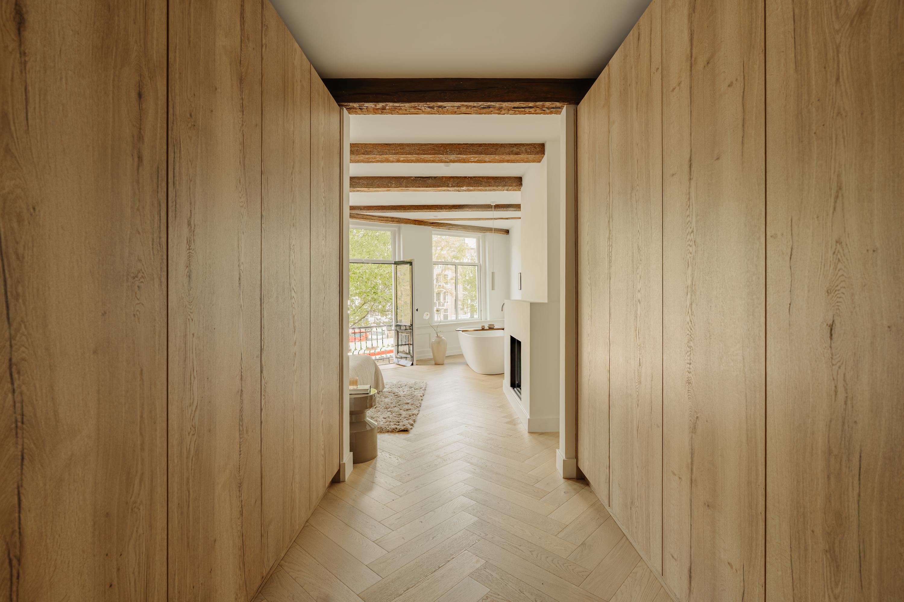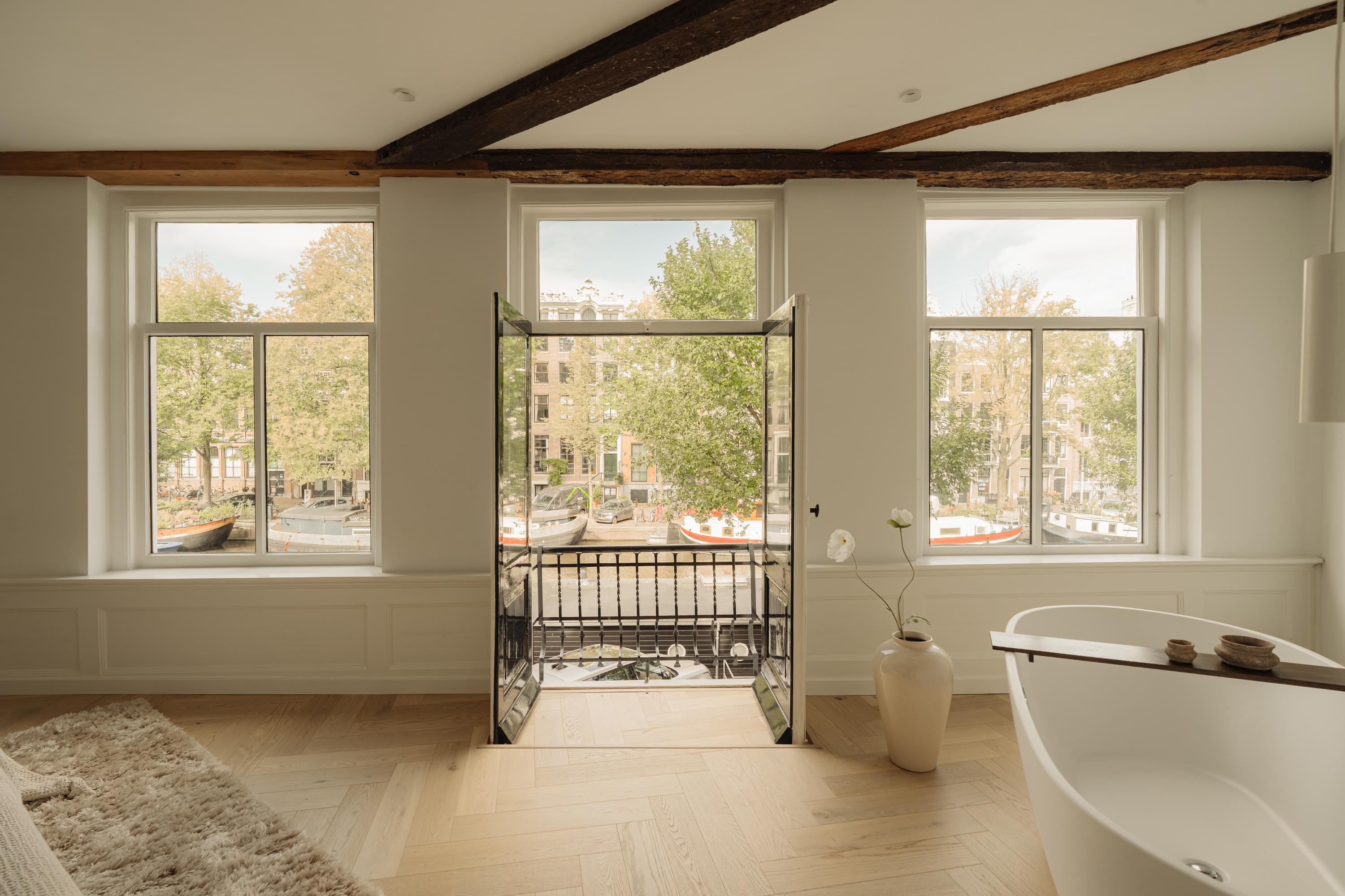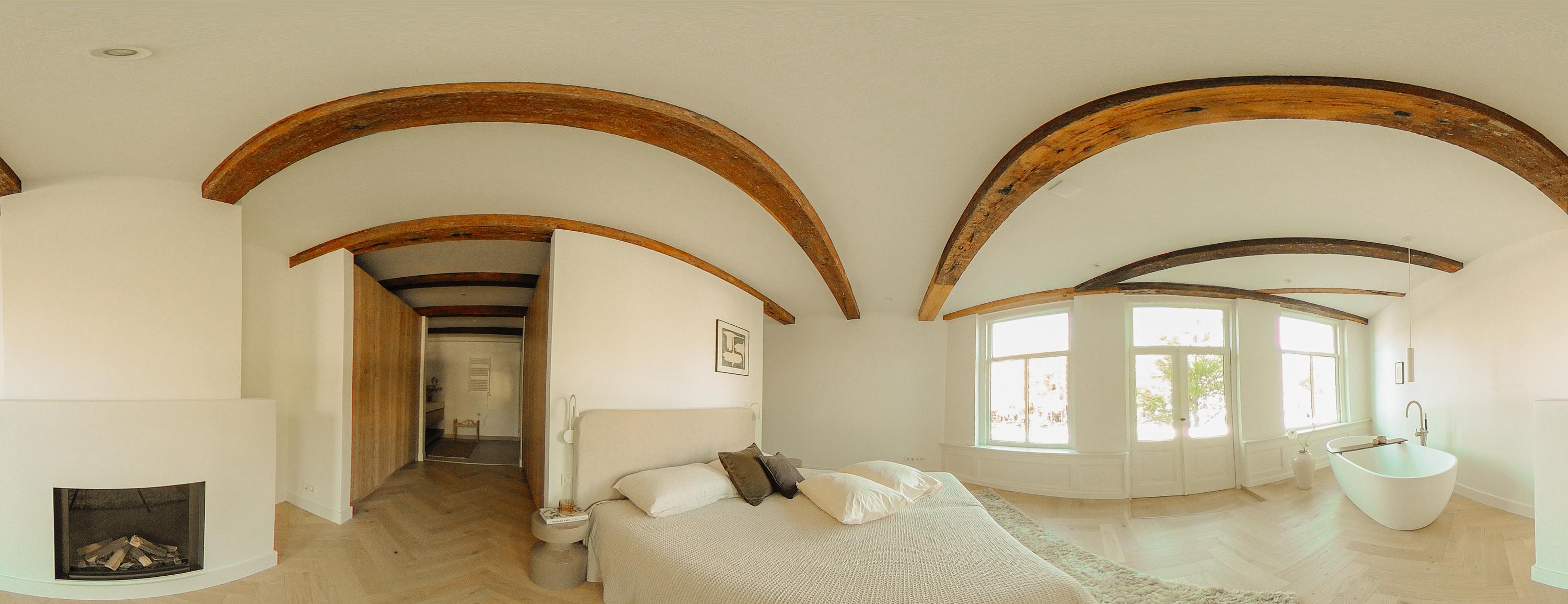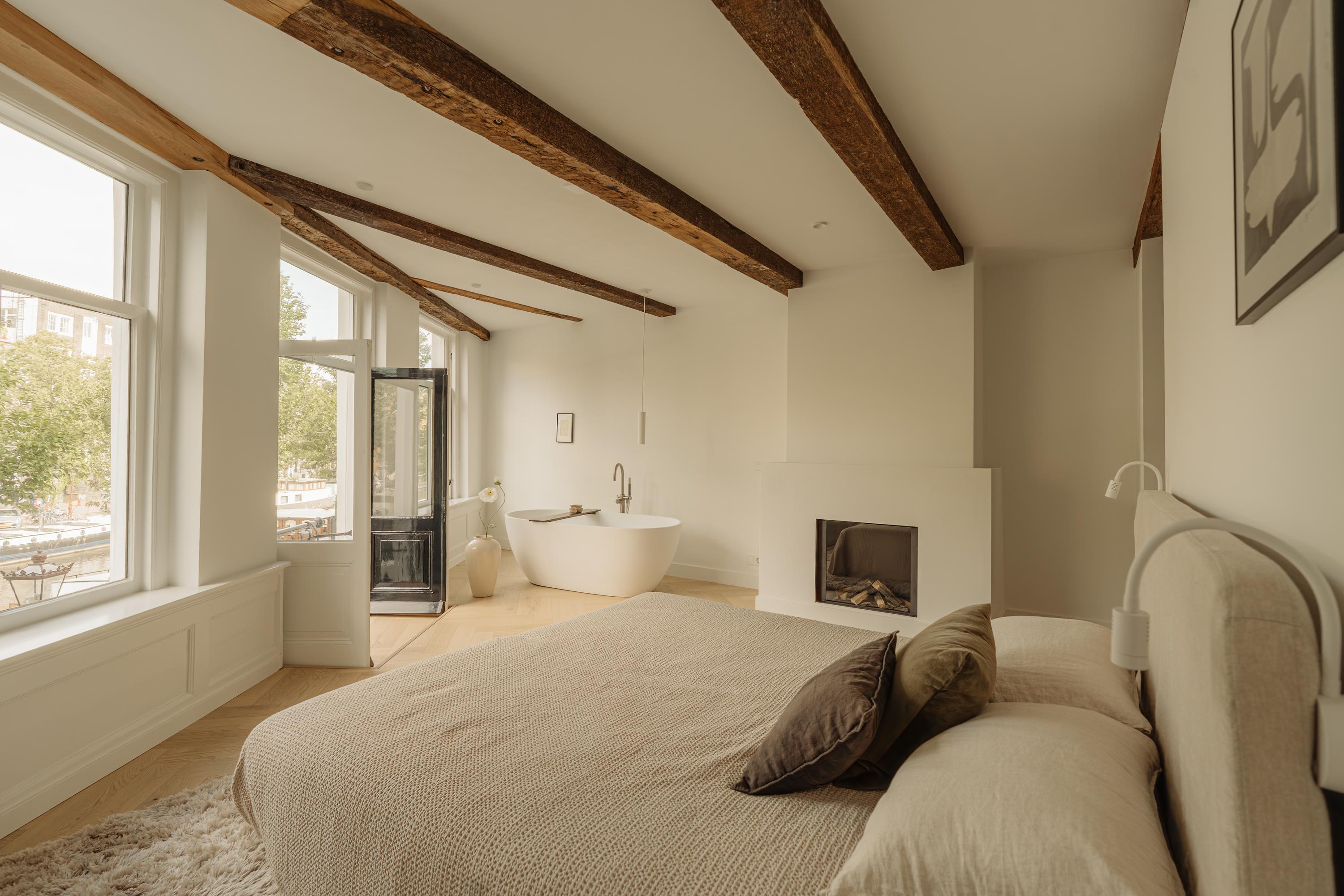 Aan de voorzijde bevindt zich de hoofdslaapkamer met uitzicht over de Singel. De kamer heeft een warme, natuurlijke en lichte uitstraling dankzij de grote raampartijen. De vrijstaande badkuip bij het raam, het Franse balkon en de open haard zorgen voor een gevoel van luxe en intimiteit.