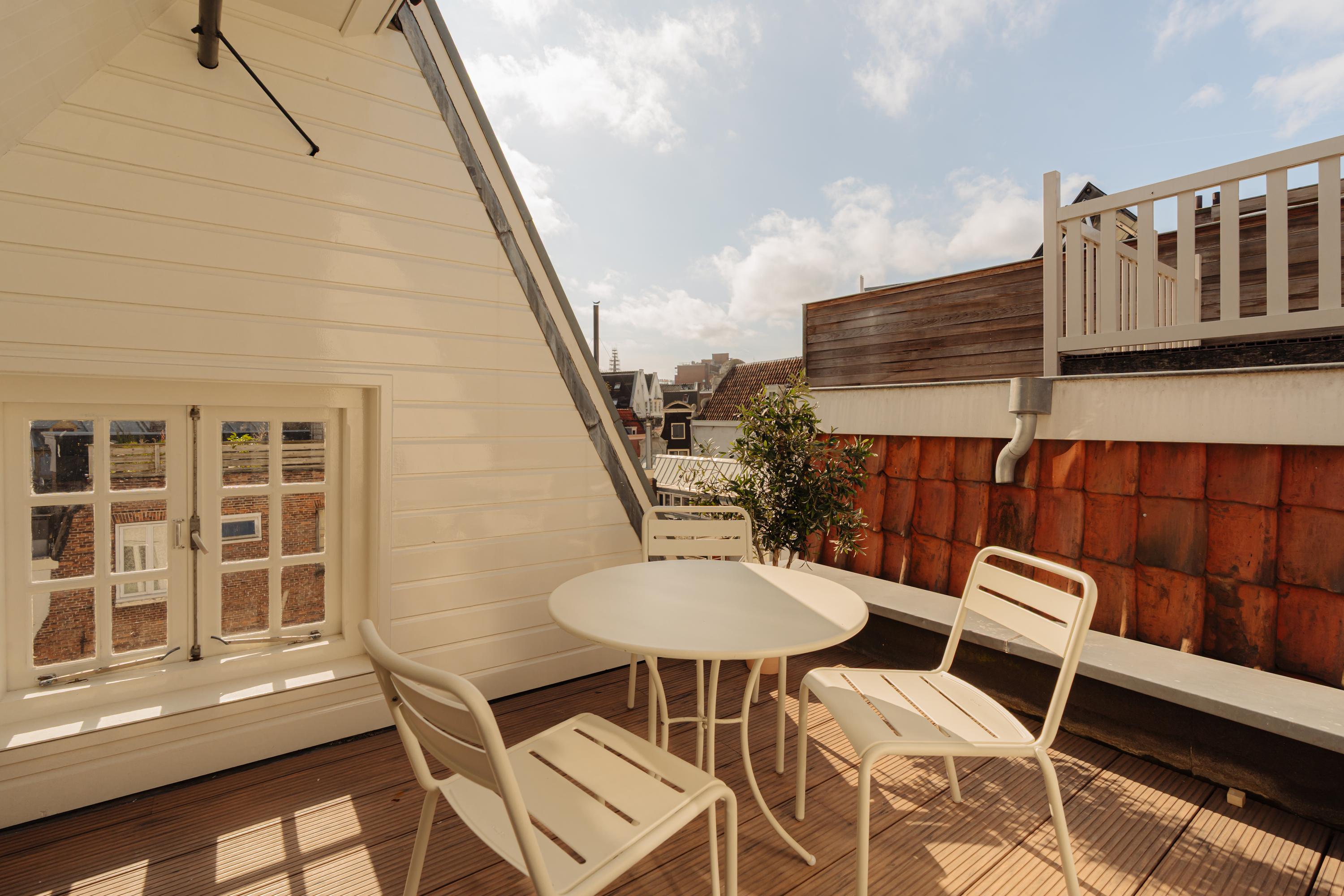 De bovenste verdieping is verdeeld in twee aparte ruimtes. De kamer aan de voorzijde is ideaal om als extra slaapkamer of werkkamer te dienen. Ook deze verdieping is licht van kleur en heeft een rustige sfeer. Aan de achterzijde bevindt zich een kamer met pantry inclusief wijnkoeler en toegang dakterras, waar u in alle rust van de zon kunt genieten onder het genot van een drankje met uitzicht over de historische daken van Amsterdam en de Dominicuskerk.