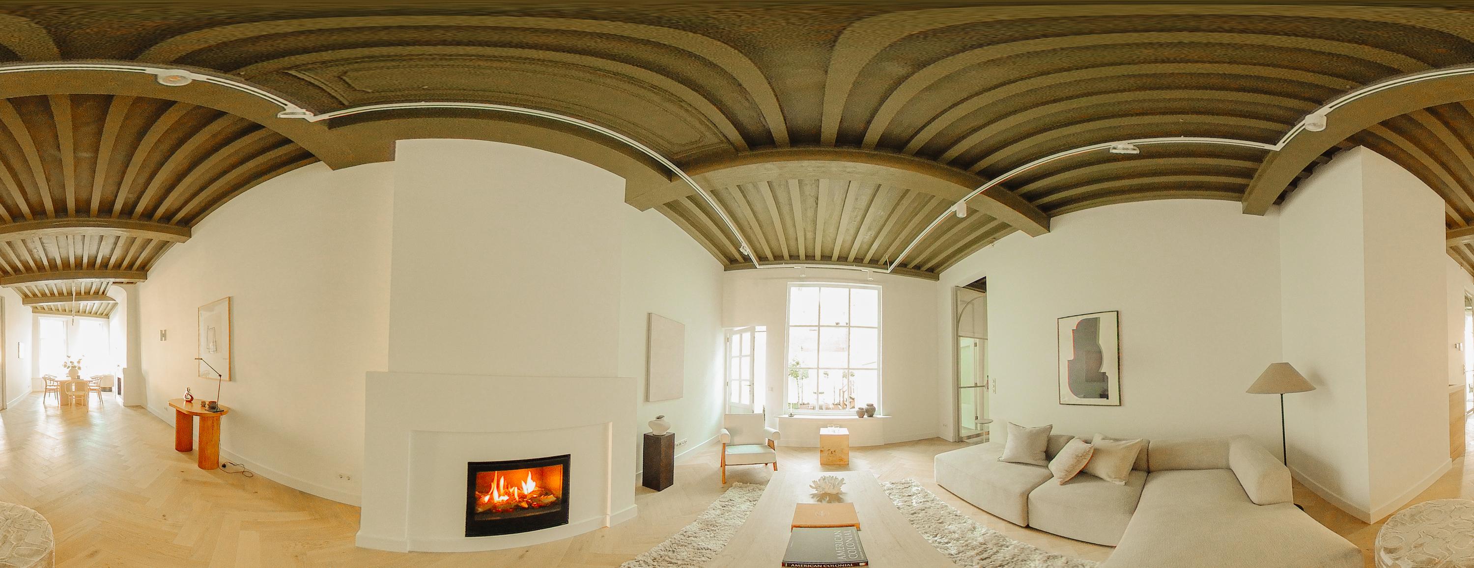Via de hal bereikt u het woongedeelte van deze verdieping. Met een plafondhoogte van ruim 3,4 meter, originele plafondbalken, grote raampartijen en zicht op de Singel is dit een indrukwekkende ruimte waar allure en warmte op natuurlijke wijze samenkomen. De twee haarden op deze verdieping geven de ruimte een extra huiselijk gevoel.