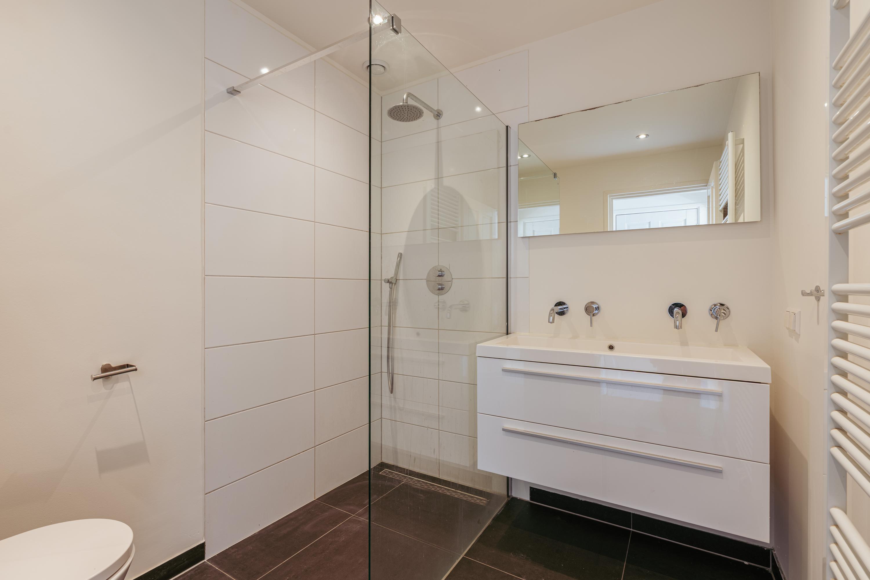 Een vaste trap brengt u naar de bovenste verdieping, waar het principe van omgekeerd wonen volledig tot zijn recht komt. Hier vindt u de lichte woonkamer met open keuken, die direct in het oog springt door de brede raampartijen en de fijne lichtinval. De moderne en open keuken is uitgerust met een inductieplaat, afzuigkap, vaatwasser, oven en ijskast. Aansluitend bevindt zich een praktische berging/kast. Vanuit de woonkamer stapt u zo het zonnige dakterras op, waar u in alle rust kunt genieten van het buitenleven en een prachtig uitzicht.