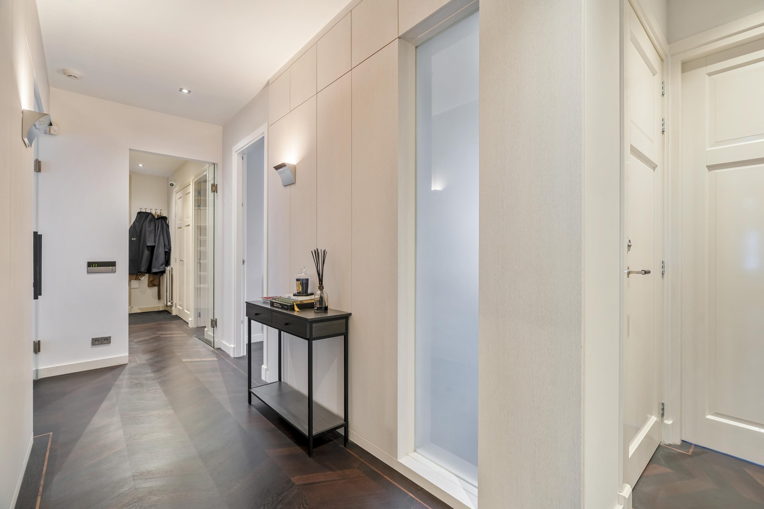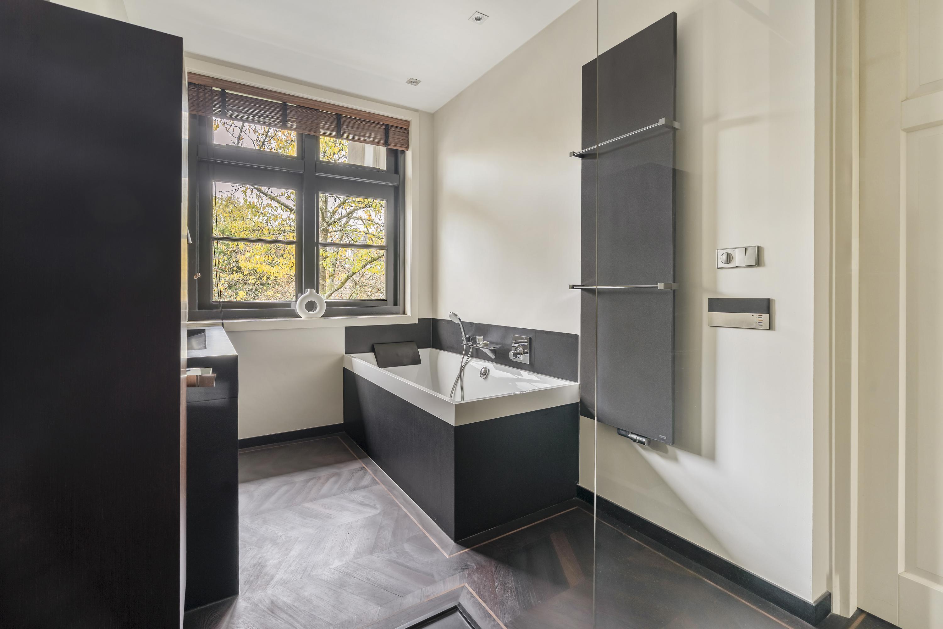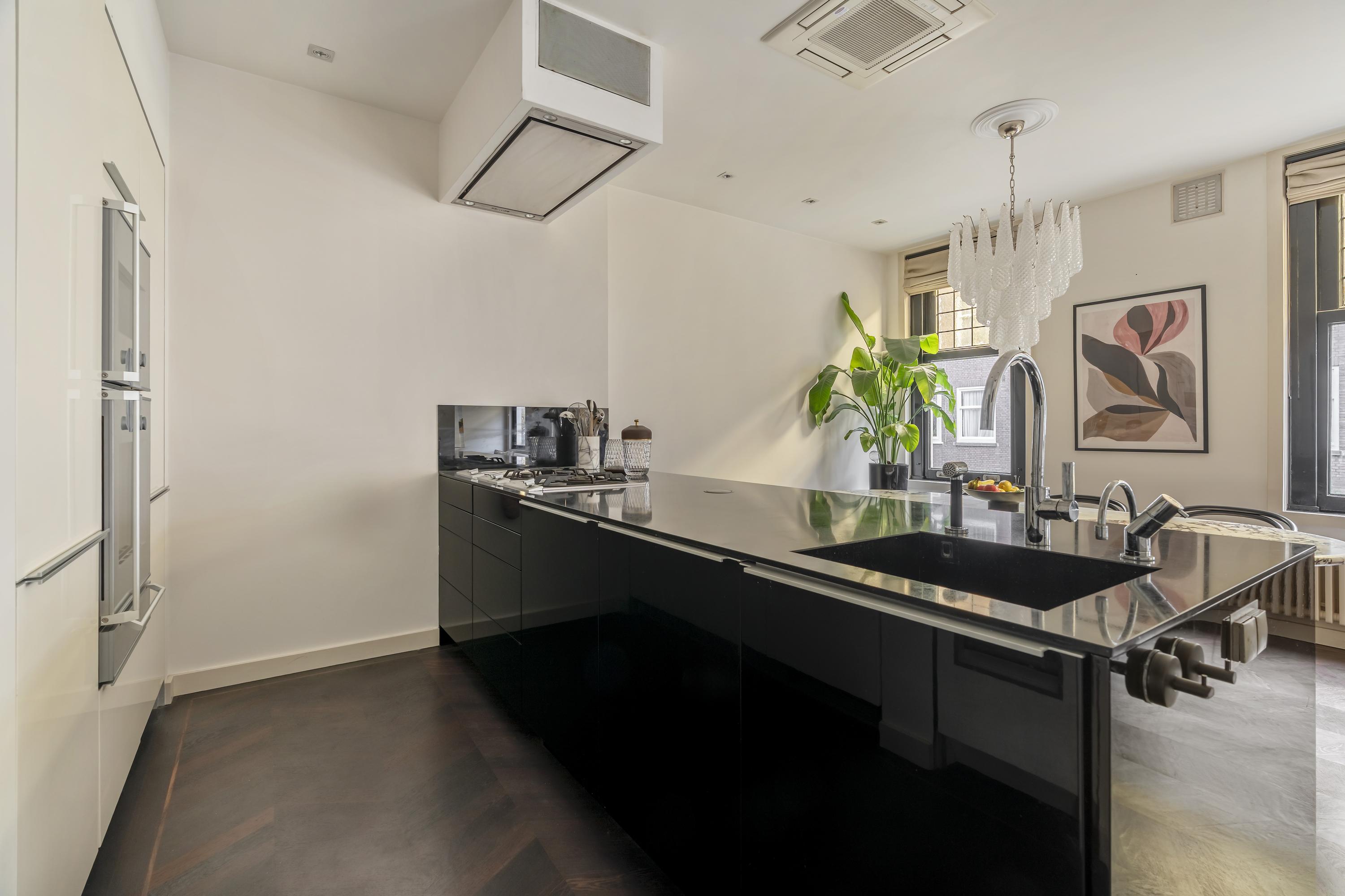 Het appartement wordt betreden via een open portaal dat direct toegang geeft tot de woning. In de hal vallen de hardhouten inbouwkasten direct op: praktisch én stijlvol, met ruimte voor onder andere de wasmachine en droger. Hier bevindt zich ook een separaat toilet met fonteintje. Aan de voorzijde ligt de royale living, een uitnodigende ruimte met een sfeervolle gashaard en karaktervolle glas-in-loodramen. De elektrische openslaande deuren en de schuifdeuren richting de keuken, beide voorzien van subtiele designverlichting, zorgen voor een vloeiende overgang tussen de woon- en kookruimte. De woonkeuken, ontworpen door Poggenpohl, vormt het hart van het huis. De keuken is uitgerust met topapparatuur van Gaggenau, waaronder een bordenverwarmer, stoomoven, oven, twee koelkasten, een wijnklimaatkast, een 3-pitsgasfornuis met Teppanyakiplaat, vaatwasser en tot slot een Quooker. Daarnaast is in de woonkeuken een airco-installatie aanwezig. Een tweede gashaard en een ingebouwde tv maken dit niet alleen een praktische, maar ook een bijzonder gezellige plek om te koken en samen te zijn.