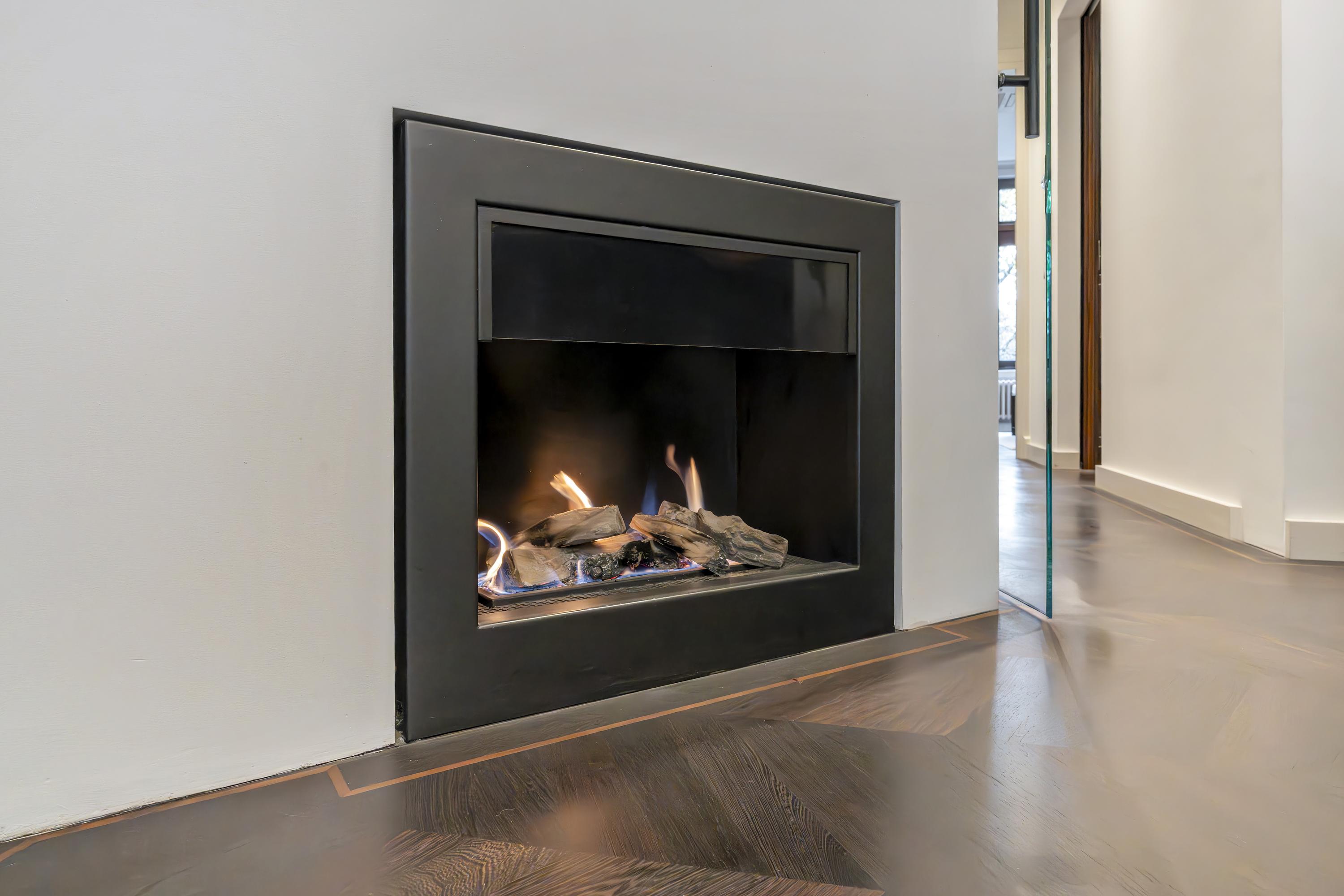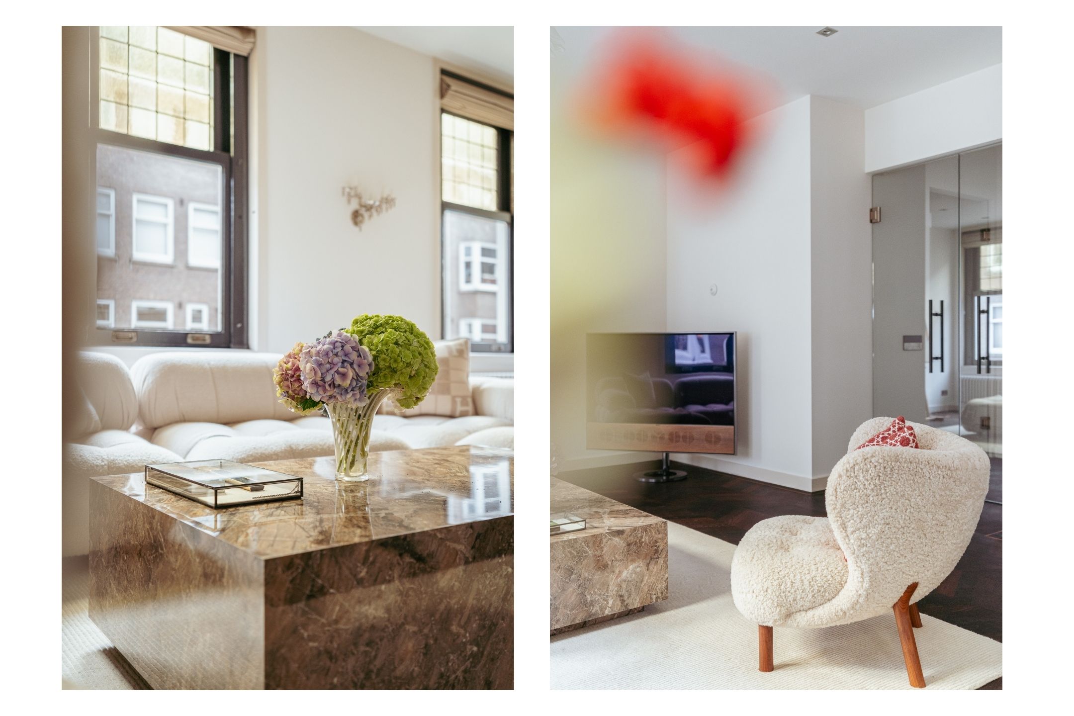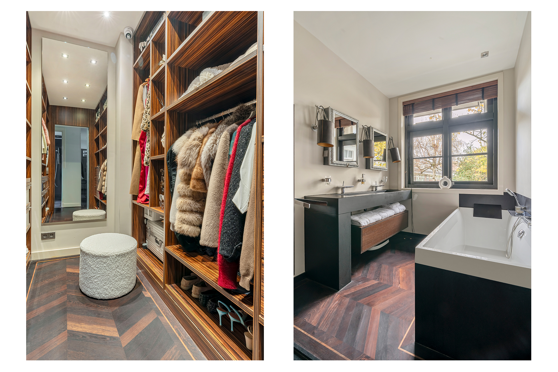 Het appartement wordt betreden via een open portaal dat direct toegang geeft tot de woning. In de hal vallen de hardhouten inbouwkasten direct op: praktisch én stijlvol, met ruimte voor onder andere de wasmachine en droger. Hier bevindt zich ook een separaat toilet met fonteintje. Aan de voorzijde ligt de royale living, een uitnodigende ruimte met een sfeervolle gashaard en karaktervolle glas-in-loodramen. De elektrische openslaande deuren en de schuifdeuren richting de keuken, beide voorzien van subtiele designverlichting, zorgen voor een vloeiende overgang tussen de woon- en kookruimte. De woonkeuken, ontworpen door Poggenpohl, vormt het hart van het huis. De keuken is uitgerust met topapparatuur van Gaggenau, waaronder een bordenverwarmer, stoomoven, oven, twee koelkasten, een wijnklimaatkast, een 3-pitsgasfornuis met Teppanyakiplaat, vaatwasser en tot slot een Quooker. Daarnaast is in de woonkeuken een airco-installatie aanwezig. Een tweede gashaard en een ingebouwde tv maken dit niet alleen een praktische, maar ook een bijzonder gezellige plek om te koken en samen te zijn.