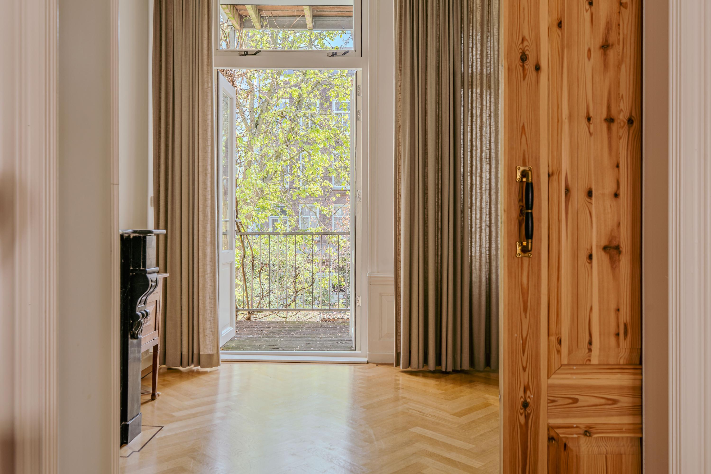 Vanuit de uitgestrekte hal heeft u toegang tot de royale woonkamer, gelegen aan de voorzijde van het appartement. De woonkamer beschikt over hoge plafonds met fraaie details en grote raampartijen, de eerste slaapkamer bevindt zich en-suite. Middels ingebouwde schuifdeuren bereikt u vanuit de woonkamer deze slaapkamer, gelegen aan de achterzijde van de woning. Deze slaapkamer biedt tevens toegang tot het diepe balkon van circa 7 m², gelegen op het zuid oosten. De keuken bevindt zich evenals aan de achterzijde en beschikt over luxe inbouwapparatuur zoals een 5-pits gasfornuis met afzuiger en een brede oven, een koel- en vriescombinatie en een vaatwasser. Aan de gehele achterzijde van het appartement beschikt u over elektrische rolluiken. Naast de keuken treft u nog een separaat toilet met fontein en een handige berging.