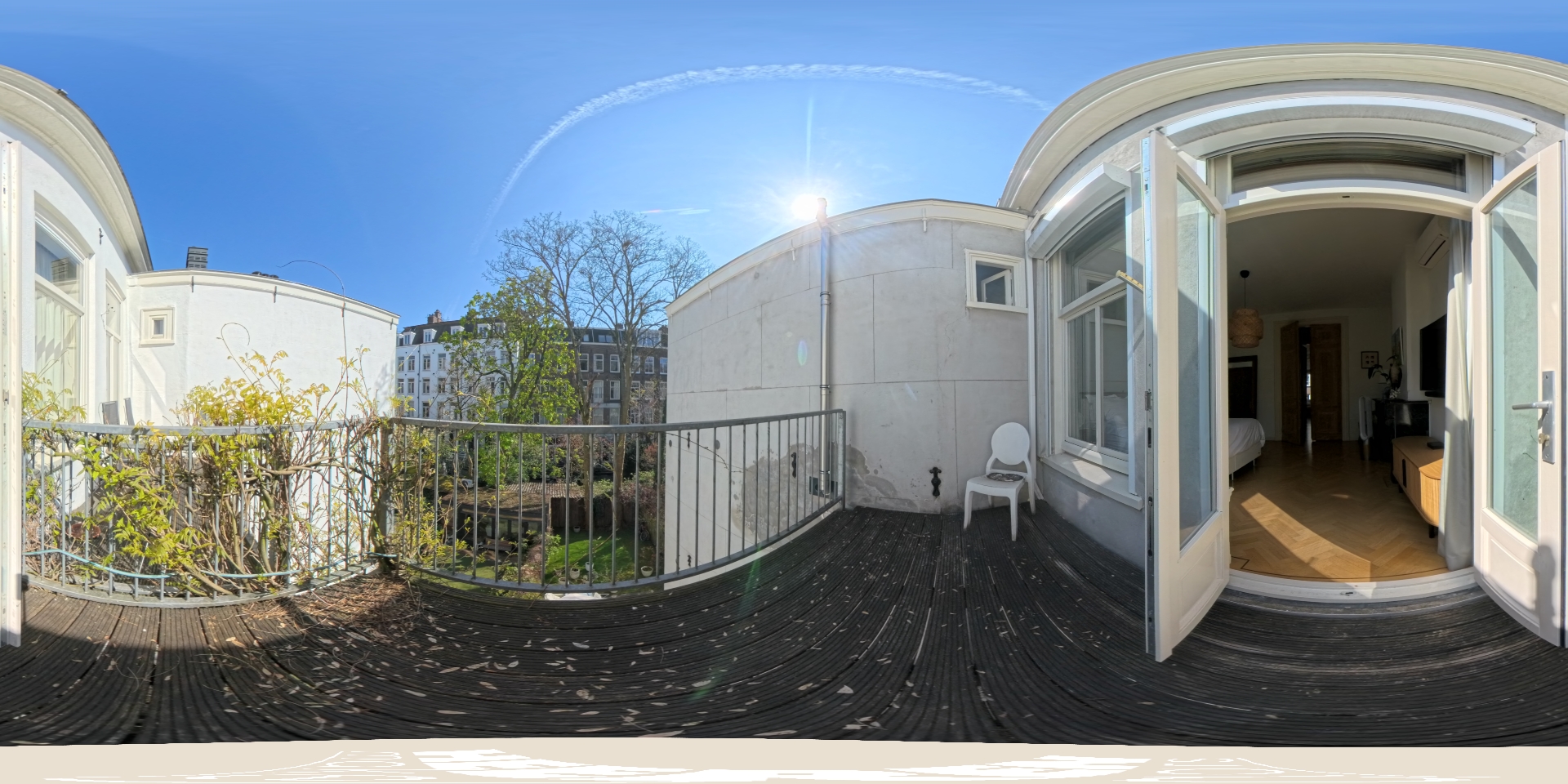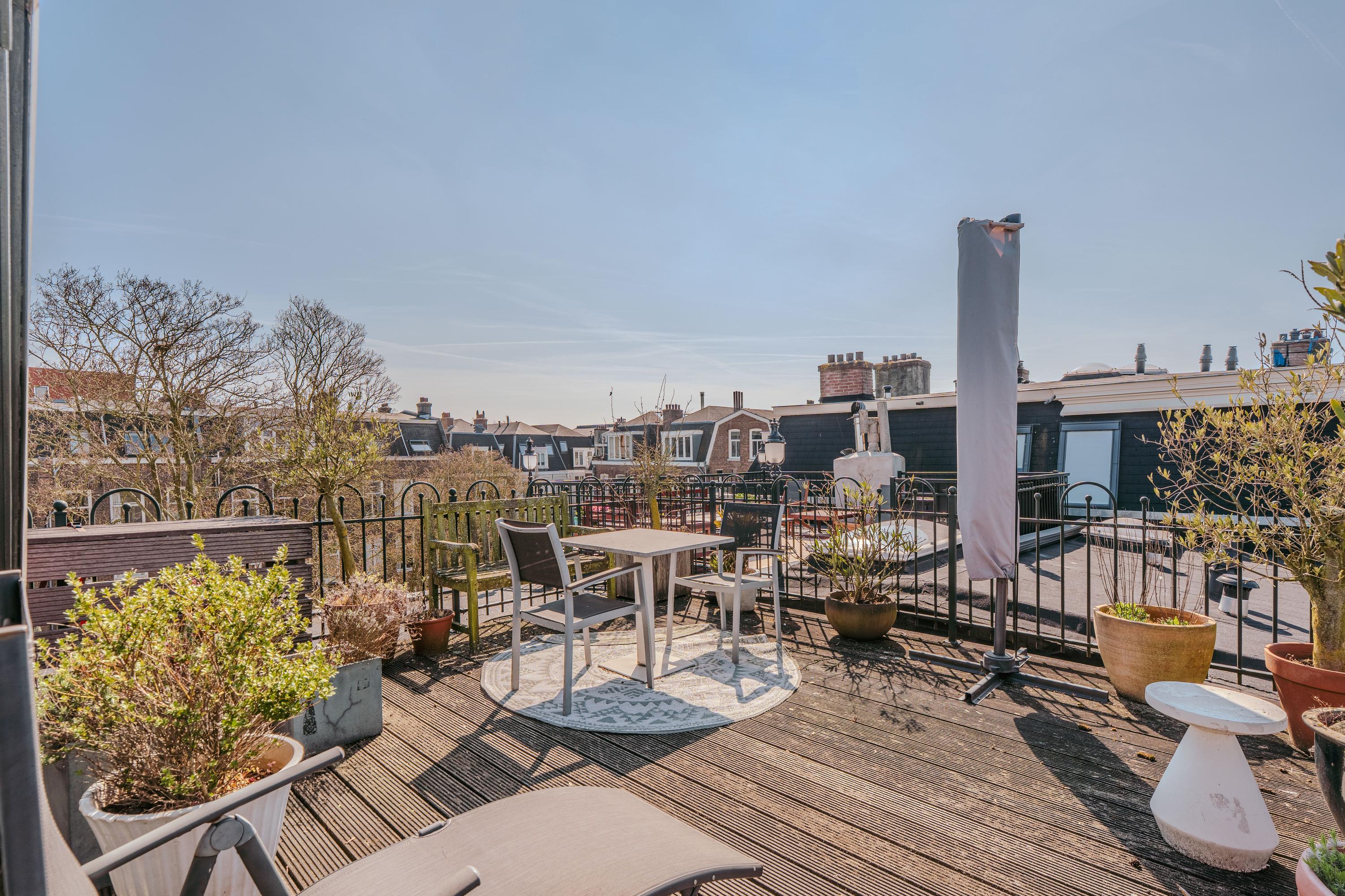 Via de tweede trap loopt u direct naar de woonkamer op de derde verdieping, voorzien van een kitchenette, twee ruime bergingen, airco en een extra badkamer. Deze badkamer is voorzien van een wastafel met meubel, een douche en een toilet. Aan de voorzijde van deze verdieping treft u nog een vierde goed bemeten slaapkamer, met aangrenzend een fijne kantoorruimte en voorzien van een airco-installatie. Beide vertrekken zijn te bereiken middels het centrale trappenhuis aan de rechterzijde van de woning. Vanuit de woonkamer loopt u naar boven naar het zonovergoten dakterras, waar u tot in de late uren heerlijk kunt genieten van de zon. Het dakterras heeft een oppervlakte van meer dan 23m2, uitzonderlijk in de stad!