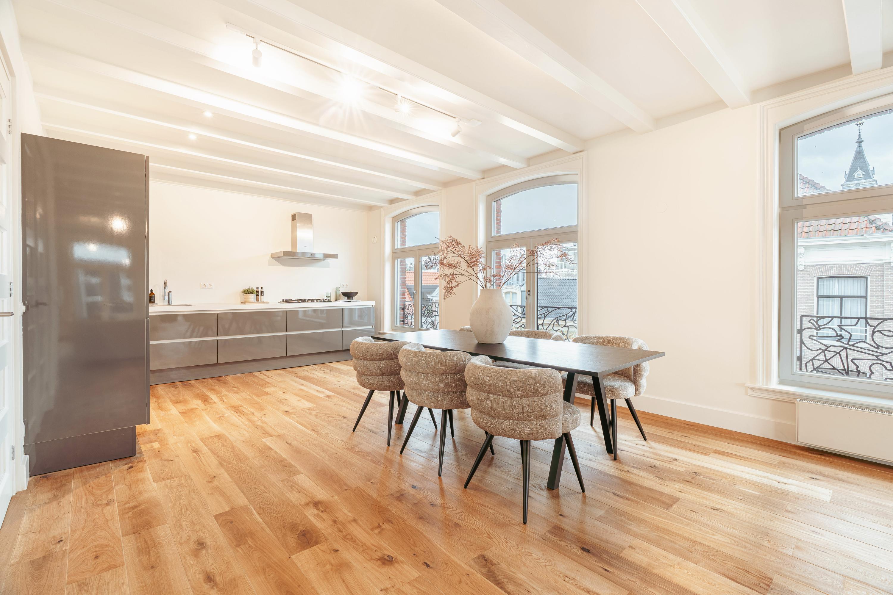 De derde verdieping vormt de belangrijkste leefetage en biedt een royale en sfeervolle woonruimte. De verdieping heeft een open indeling en een aangenaam gevoel van ruimte. Hier is plaats voor een ruime zitkamer, een royaal eetgedeelte en een open keukenopstelling. Authentieke elementen geven het geheel extra karakter. De hoge plafonds en grote raampartijen zorgen voor een mooie lichtinval. Vanuit de ramen geniet je van een charmant uitzicht over de levendige Van Baerlestraat en de chique P.C. Hooftstraat.