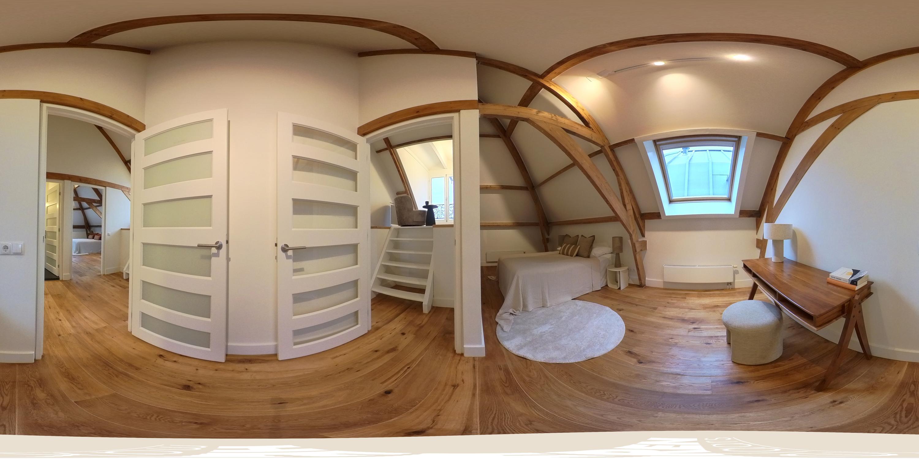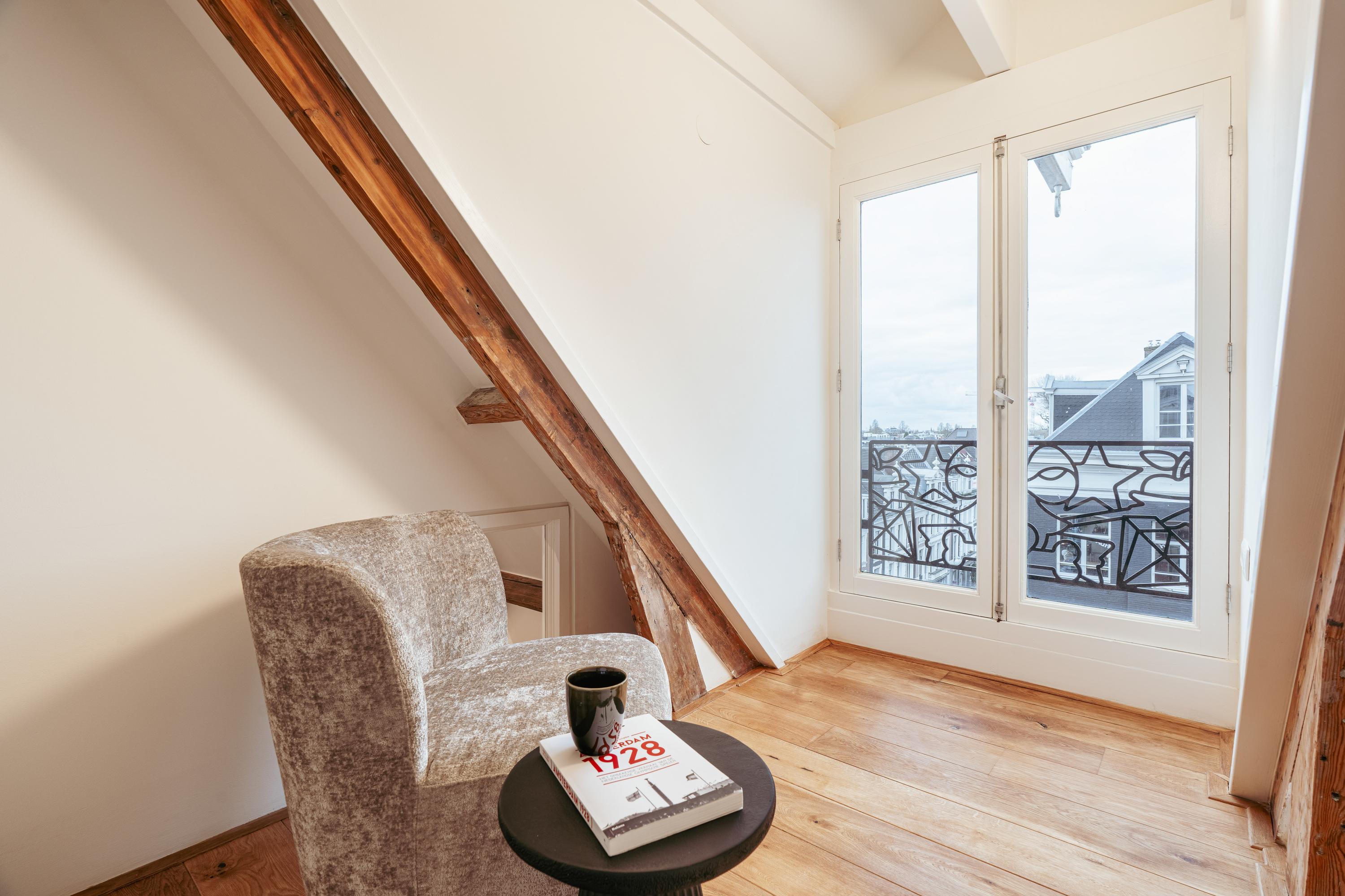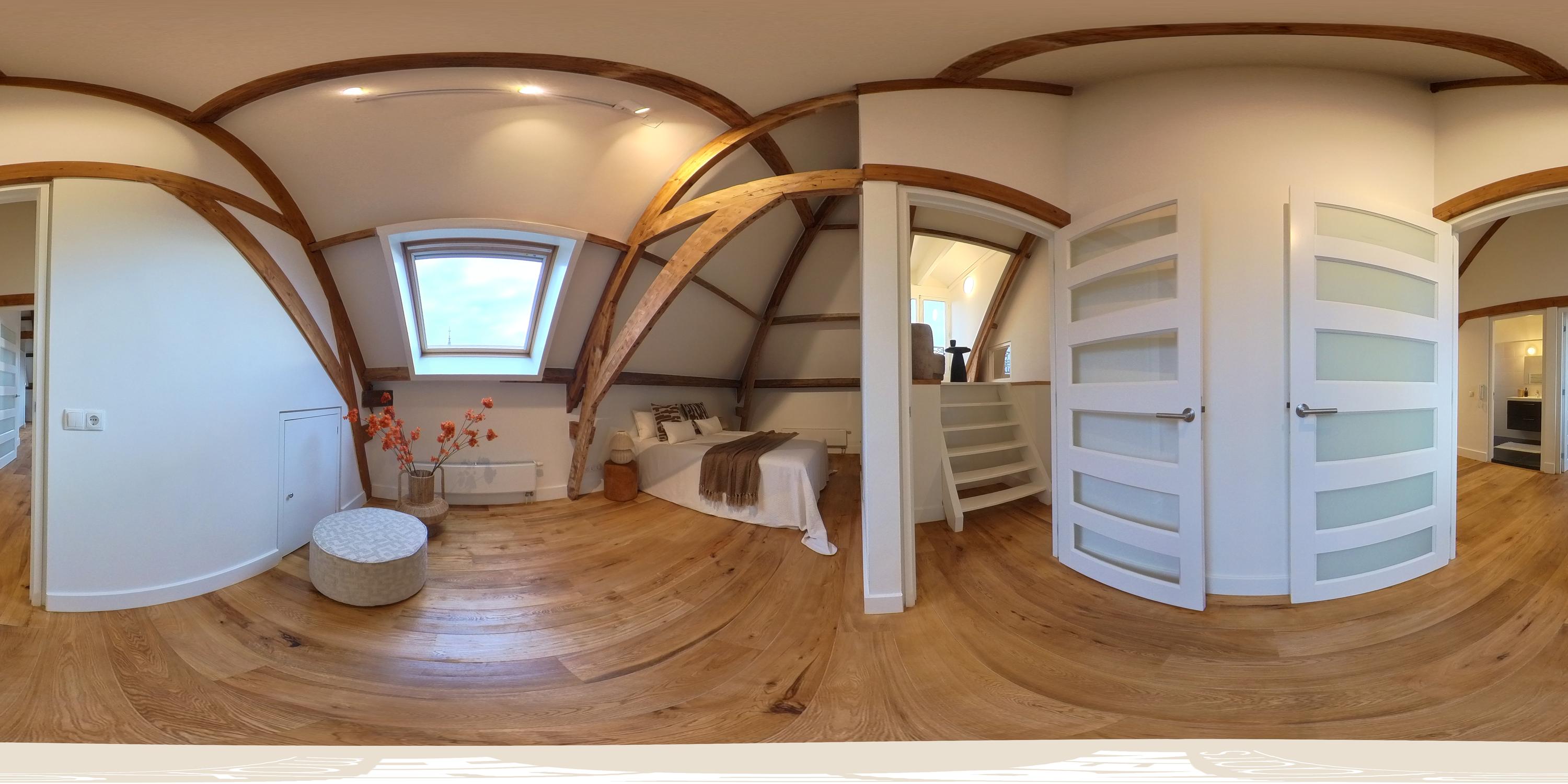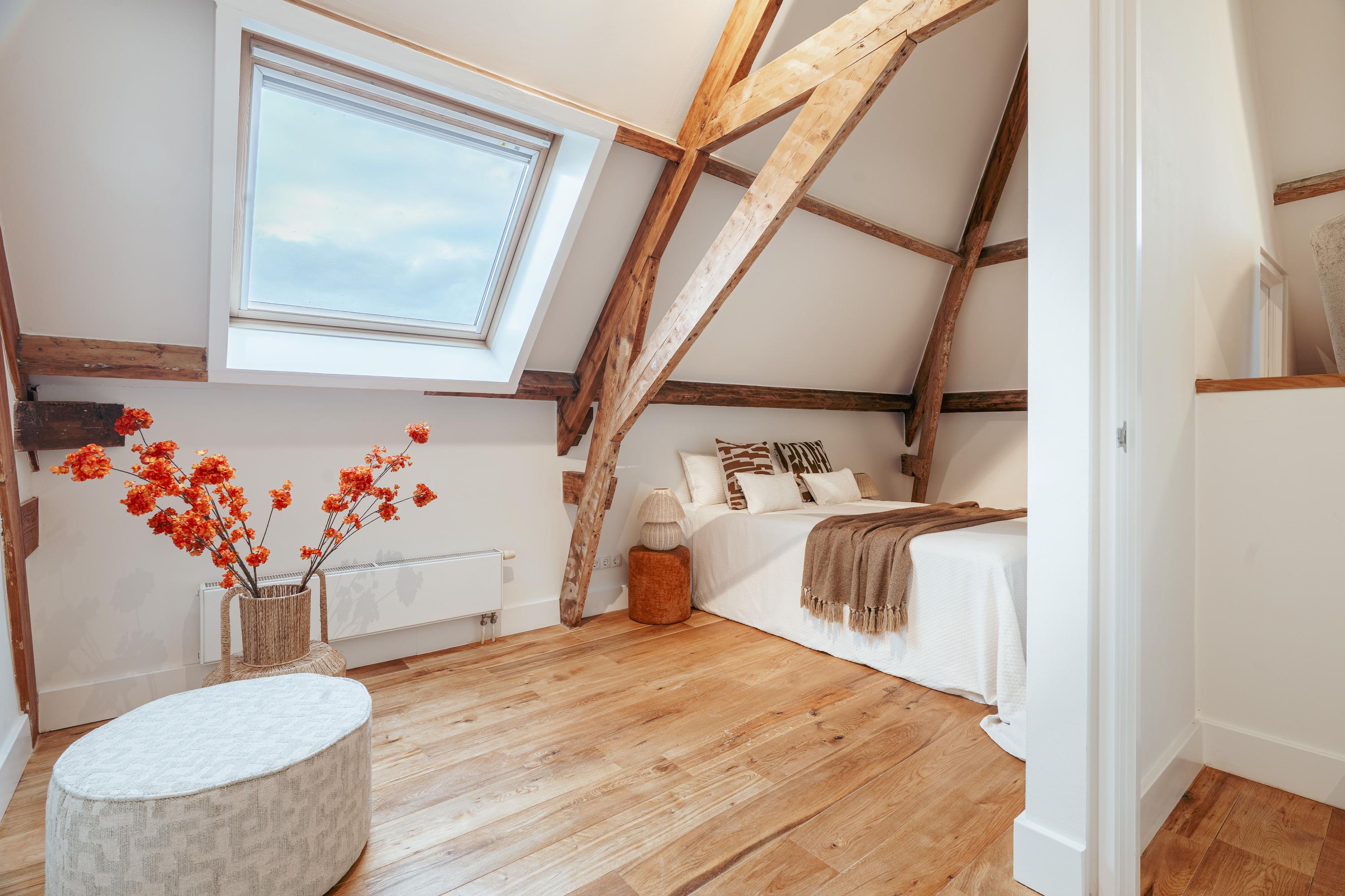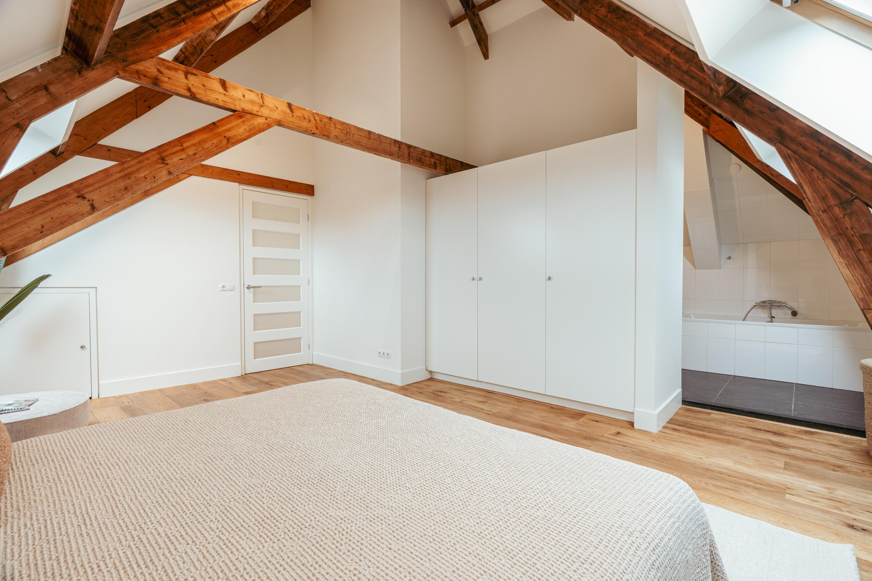 Een bijzonder en speels element zijn de twee vides tussen de vertrekken – sfeervolle plekken om te lezen of te genieten van een kop koffie. Onder deze vides zijn handige kastruimten geïntegreerd. Een klein deel van deze verdieping kent een hoogte onder 1,5 meter, passend bij de karakteristieke kapvorm. In alle ruimtes zijn de authentieke balken zichtbaar, wat bijdraagt aan de charme van de woning.