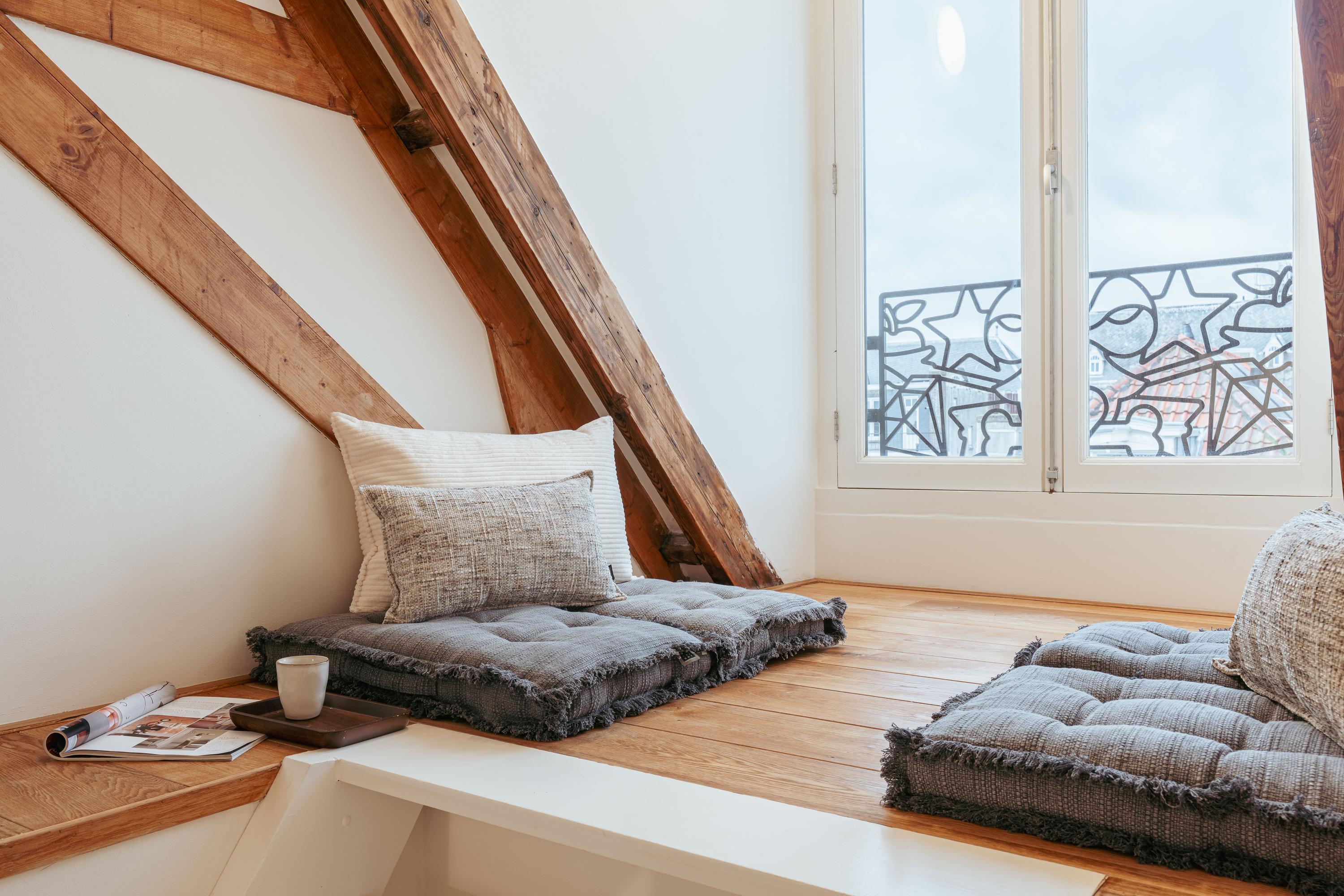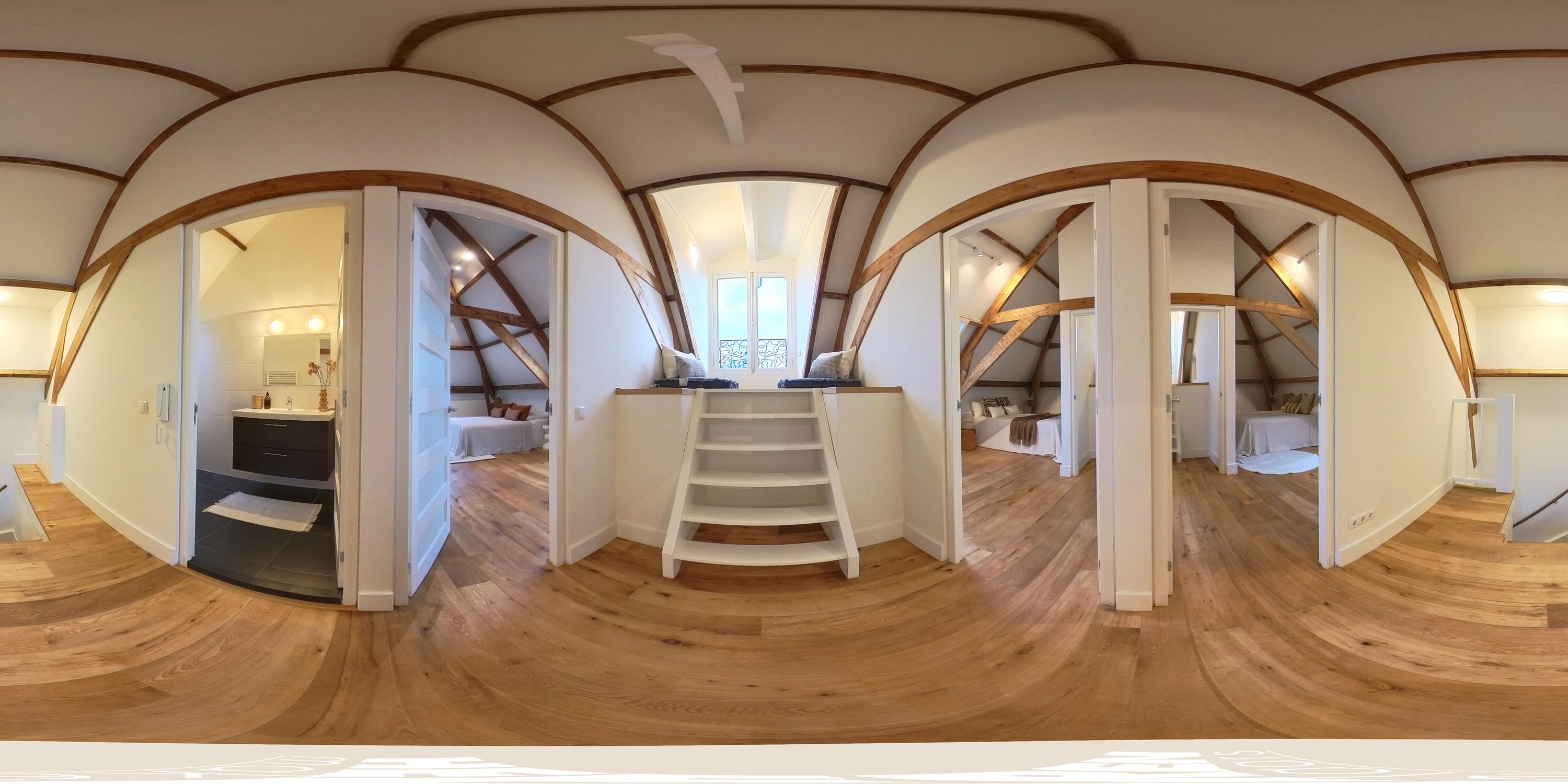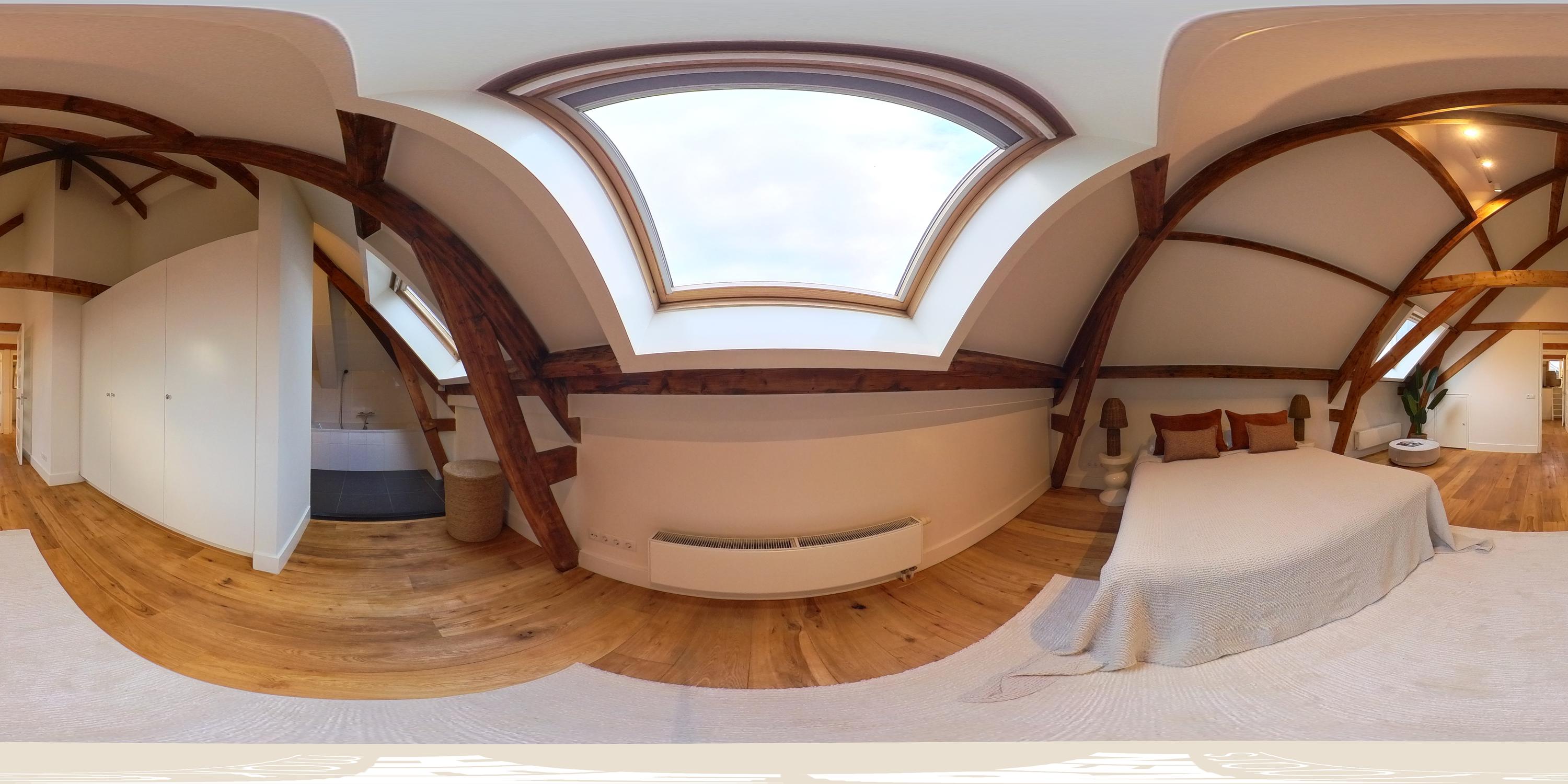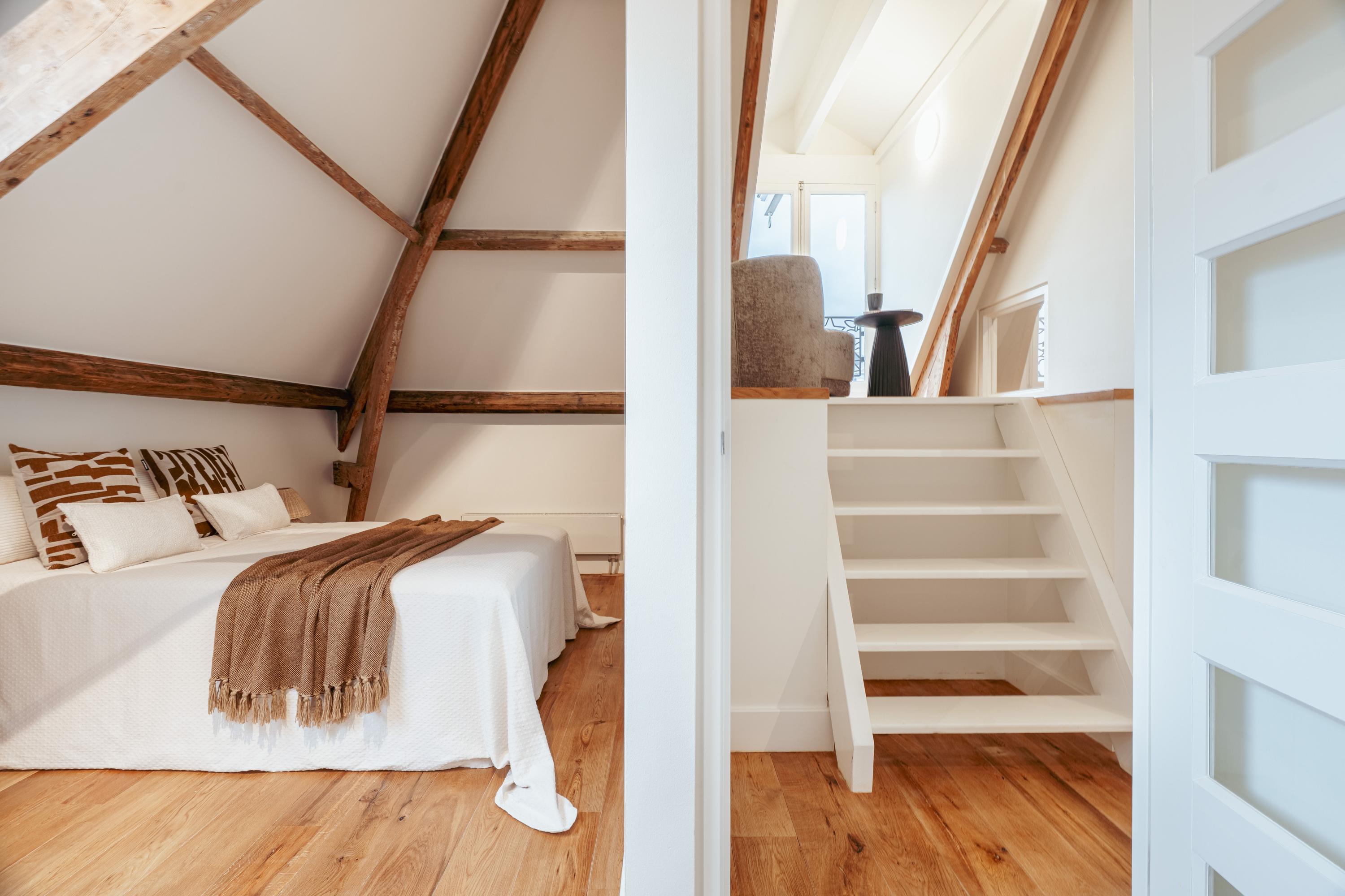 Een bijzonder en speels element zijn de twee vides tussen de vertrekken – sfeervolle plekken om te lezen of te genieten van een kop koffie. Onder deze vides zijn handige kastruimten geïntegreerd. Een klein deel van deze verdieping kent een hoogte onder 1,5 meter, passend bij de karakteristieke kapvorm. In alle ruimtes zijn de authentieke balken zichtbaar, wat bijdraagt aan de charme van de woning.