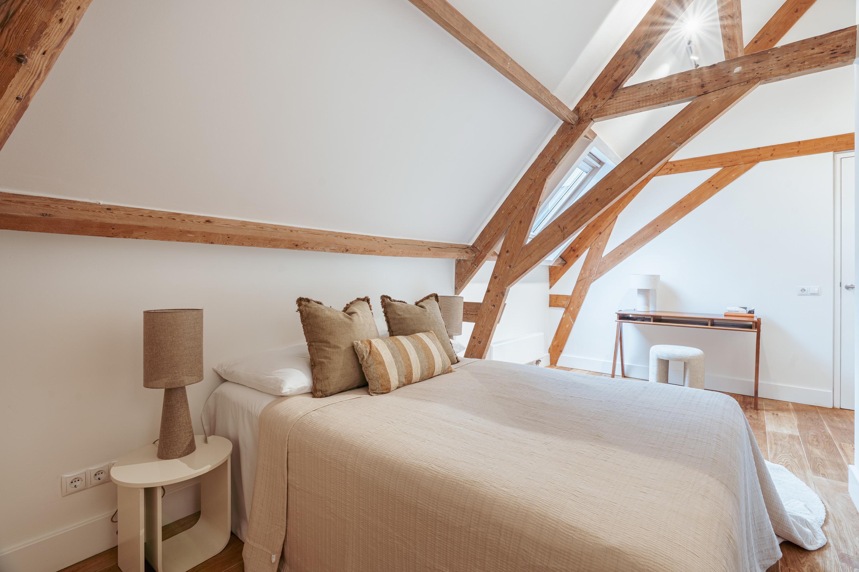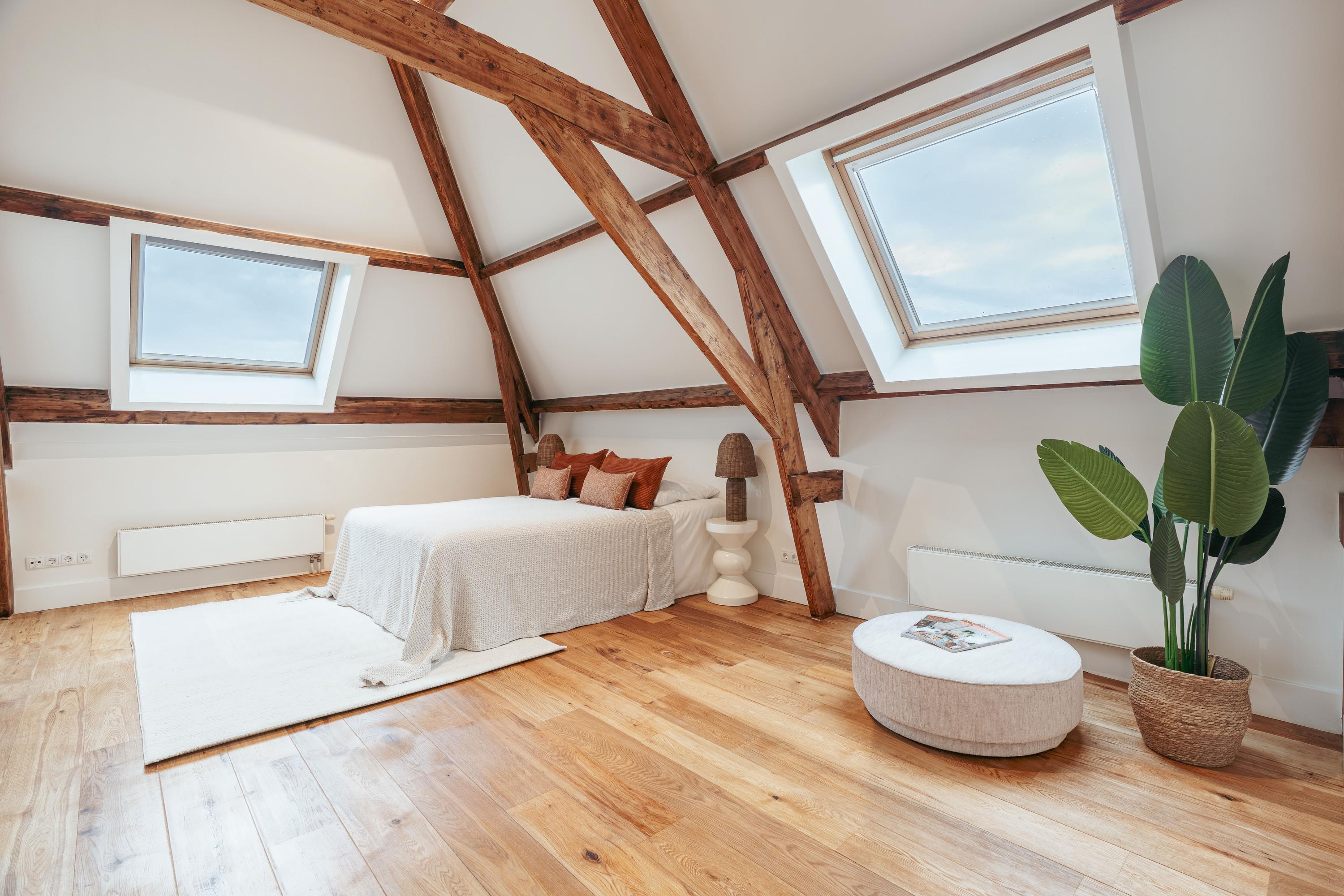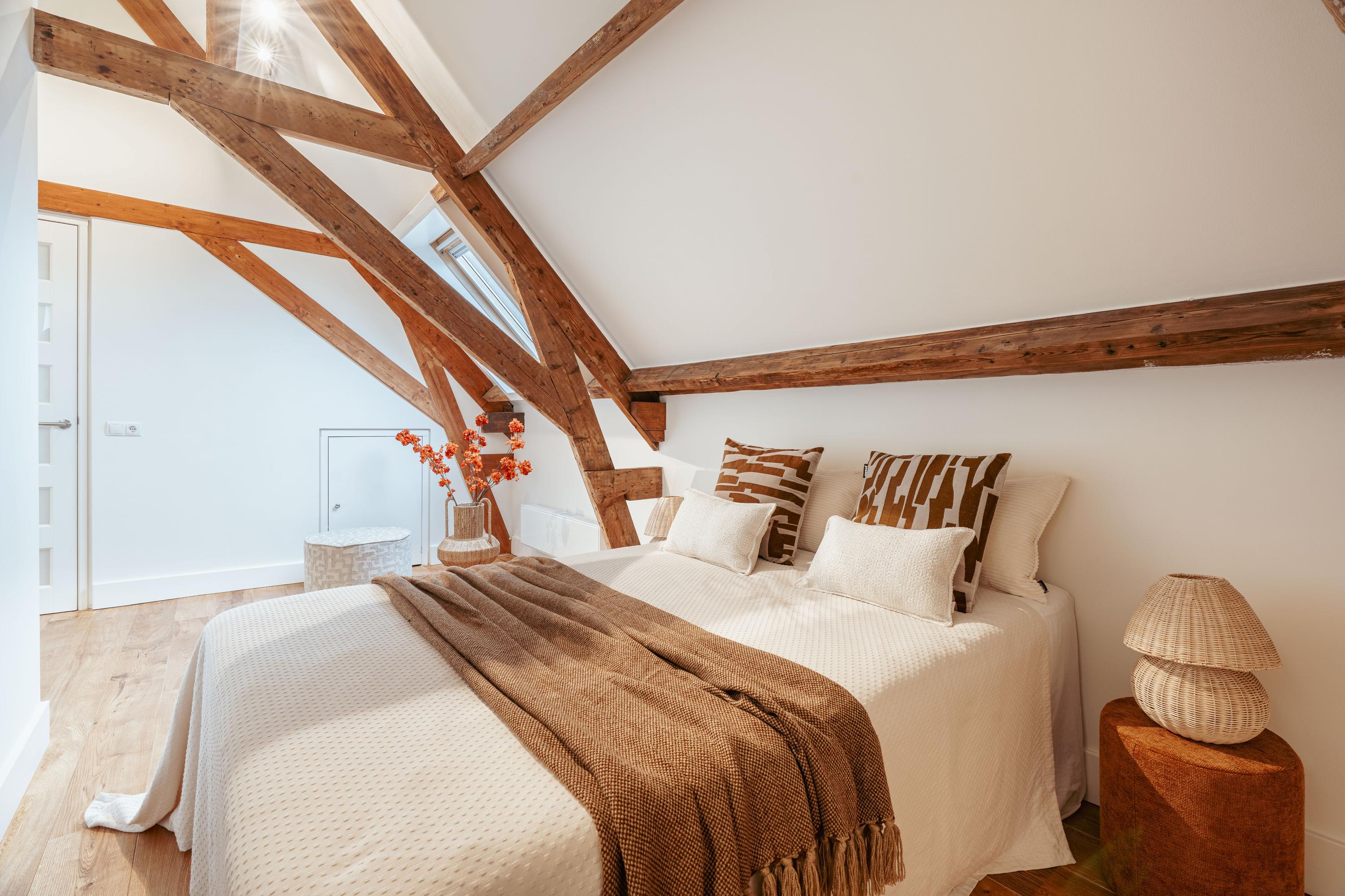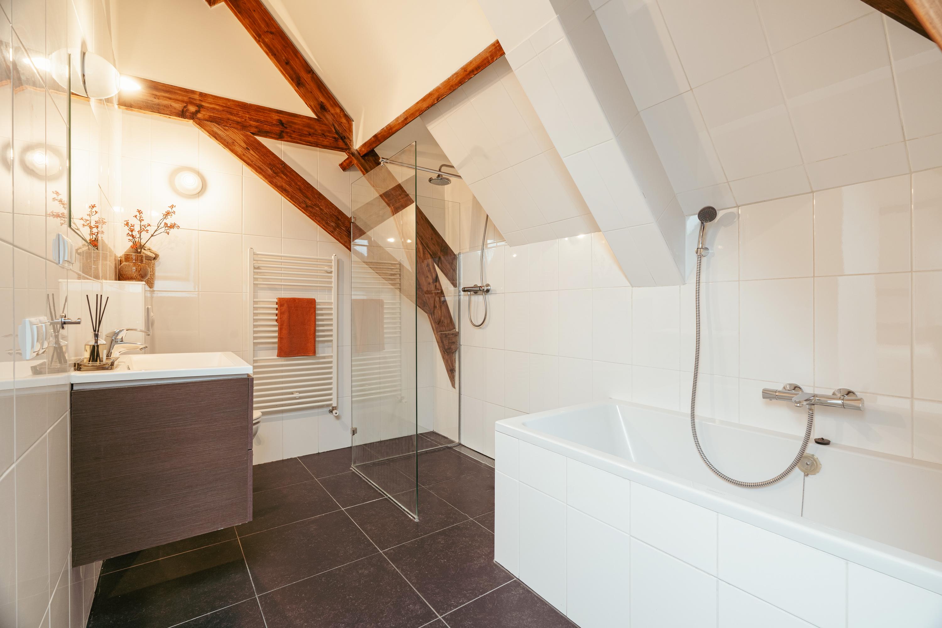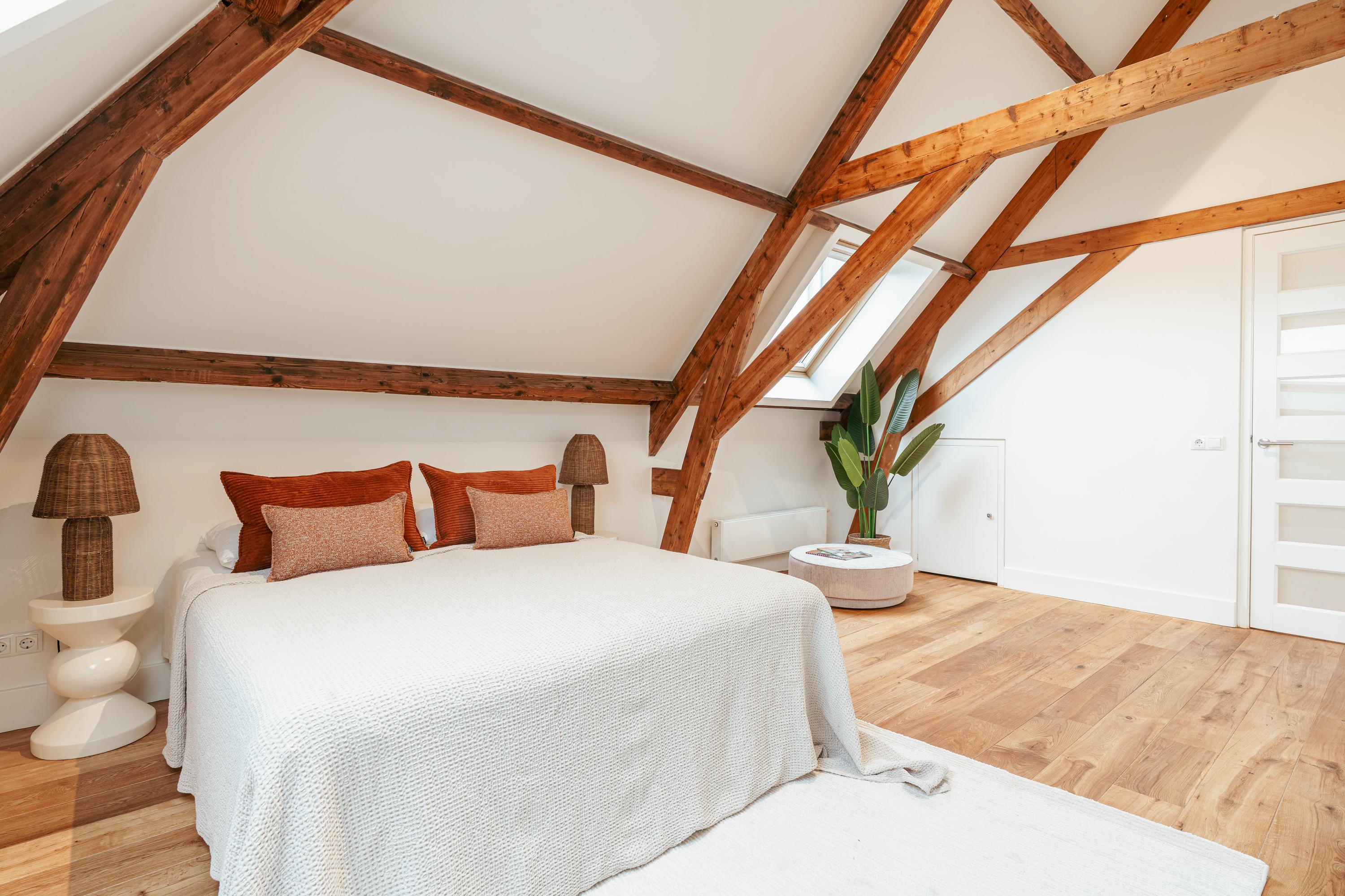 Een bijzonder en speels element zijn de twee vides tussen de vertrekken – sfeervolle plekken om te lezen of te genieten van een kop koffie. Onder deze vides zijn handige kastruimten geïntegreerd. Een klein deel van deze verdieping kent een hoogte onder 1,5 meter, passend bij de karakteristieke kapvorm. In alle ruimtes zijn de authentieke balken zichtbaar, wat bijdraagt aan de charme van de woning.