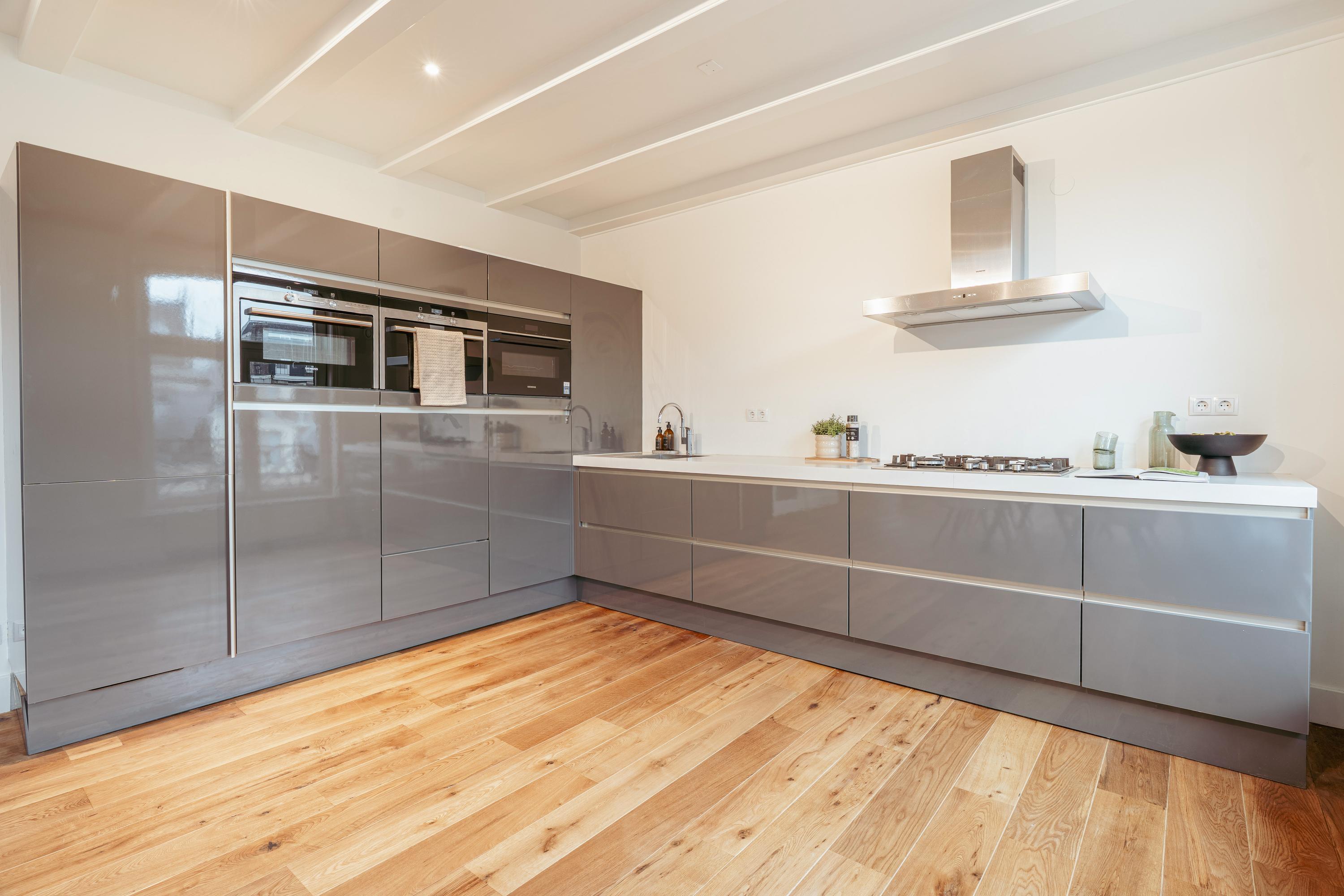 De open keuken is ruim opgezet en uitgerust met onder andere een vaatwasser, koelkast, vriezer, 5-pits gasfornuis, twee ovens en een magnetron. Op deze verdieping bevinden zich tevens een praktische bergruimte, bereikbaar via de overloop, en een separaat toilet.