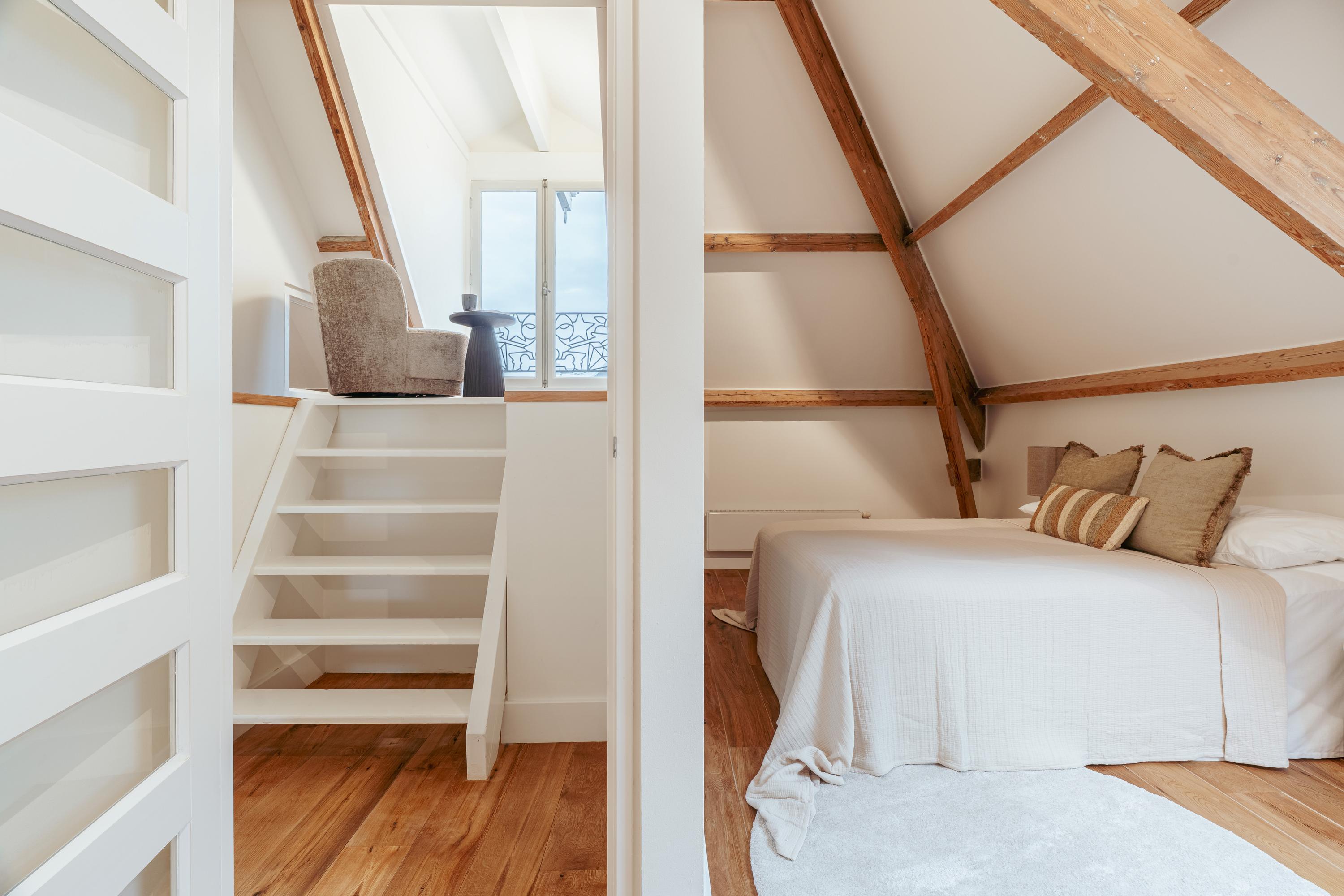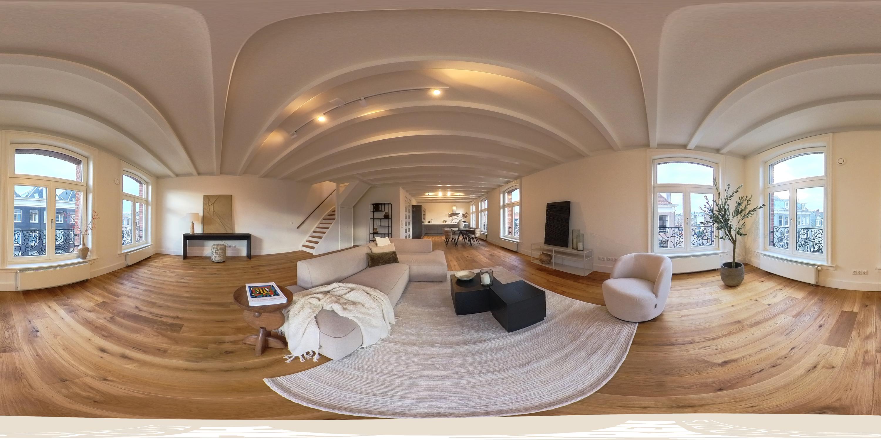 Dit royale appartement strekt zich uit over drie verdiepingen. De entree tot de woning bevindt zich op de tweede verdieping, waar een trap leidt naar de derde verdieping waar de woonruimte begint.