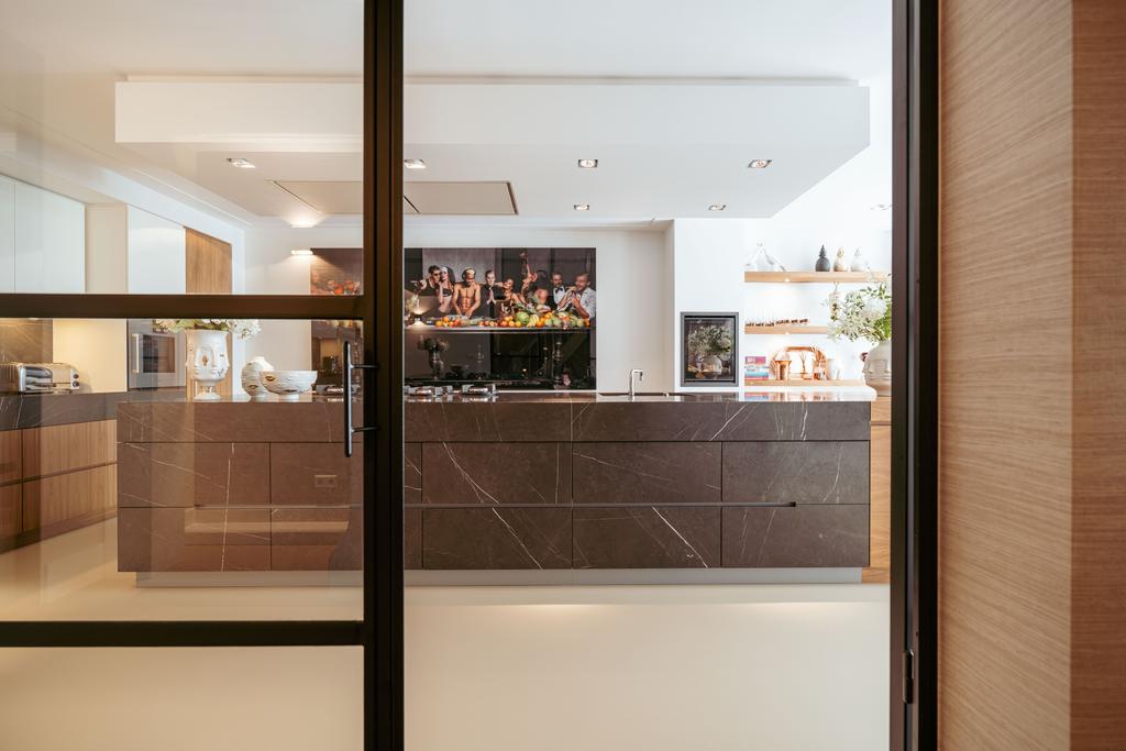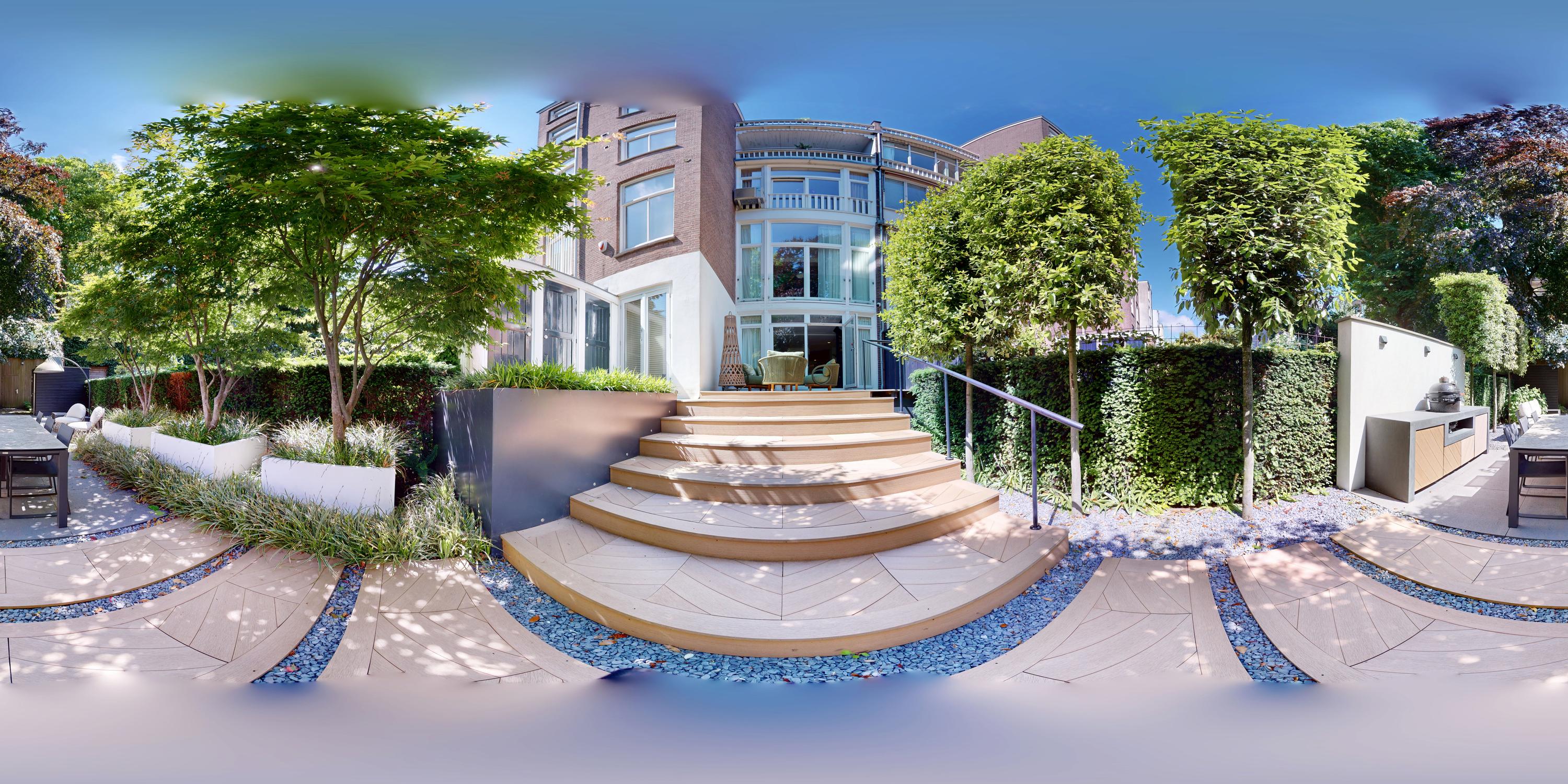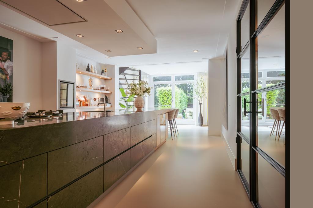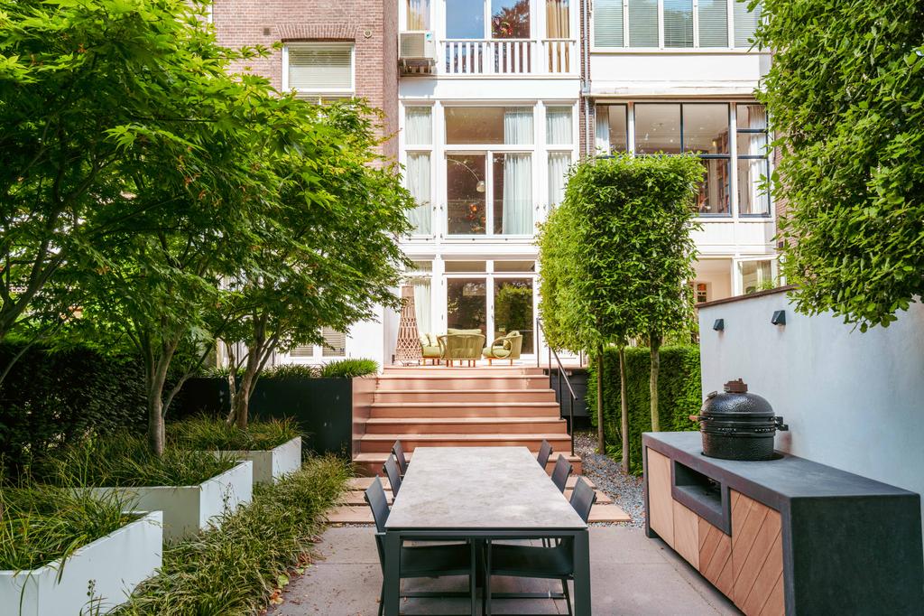 De woning is toegankelijk zowel vanaf de bel-etage als vanuit het souterrain, dat bereikbaar is via de trap of lift vanuit de hal of direct vanuit de bovengelegen eetkamer. Bij binnenkomst op deze verdieping treedt u de hal binnen, waar zich een separaat toilet bevindt. Aan de voorzijde ligt een slaapkamer met een en-suite badkamer, voorzien van een wastafel en douche. Deze multifunctionele ruimte wordt momenteel gebruikt als gym, maar is flexibel inzetbaar. De luxe uitgevoerde open woonkeuken bevindt zich aan de achterzijde en vormt het kloppend hart van deze verdieping. De keuken is uitgerust met hoogwaardige inbouwapparatuur van het merk Gaggenau, waaronder een koelkast, vriezer, Quooker, vijfpits gasfornuis geïntegreerd in het aanrecht, oven, stoomoven, vaatwasser en wijnklimaatkast. Het massief natuurstenen aanrechtblad in combinatie met het houten bargedeelte zorgt voor een warme, stijlvolle uitstraling. De keuken beschikt bovendien over bijzonder veel opbergruimte en is toegankelijk vanuit de eetkamer op de bel-etage of via openslaande deuren vanuit de hal. Een sfeervolle gashaard maakt de ruimte helemaal af. Aangrenzend aan de keuken bevindt zich een slaapkamer – momenteel in gebruik als werkkamer – die, net als de keuken, via openslaande deuren directe toegang biedt tot het ruime terras. Dit terras leidt via een trap naar de fraai aangelegde, op het zuiden gelegen achtertuin, die ook bereikbaar is via een achterom aan het Schapenburgerpad. Deze toegang biedt de zeldzame mogelijkheid om de achtertuin te betreden en bijvoorbeeld fietsen direct in de tuin te plaatsen, uniek in het centrum van Amsterdam. De tuin, onder architectuur aangelegd door Erik van Gelder, beschikt over een complete buitenkeuken, ideaal voor lange zomeravonden, en is ook voorzien van een vrijstaande berging. Hier geniet u in alle rust van zon en privacy, tot in de late uurtjes.