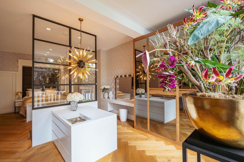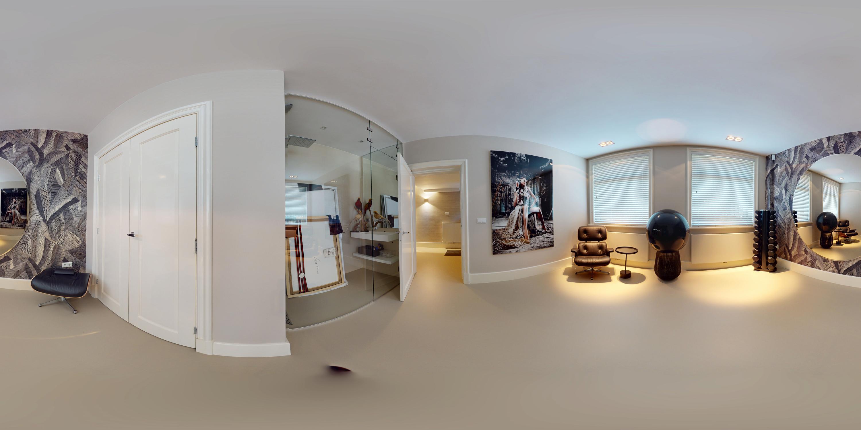 De gehele verdieping is hoogwaardig afgewerkt met stijlvol en sfeervol behang, wat de ruimte warmte en karakter geeft. Grote raampartijen aan beide zijden van de verdieping zorgen voor een uitzonderlijke hoeveelheid daglicht en benadrukken de ruimtelijkheid en luxe van het geheel.