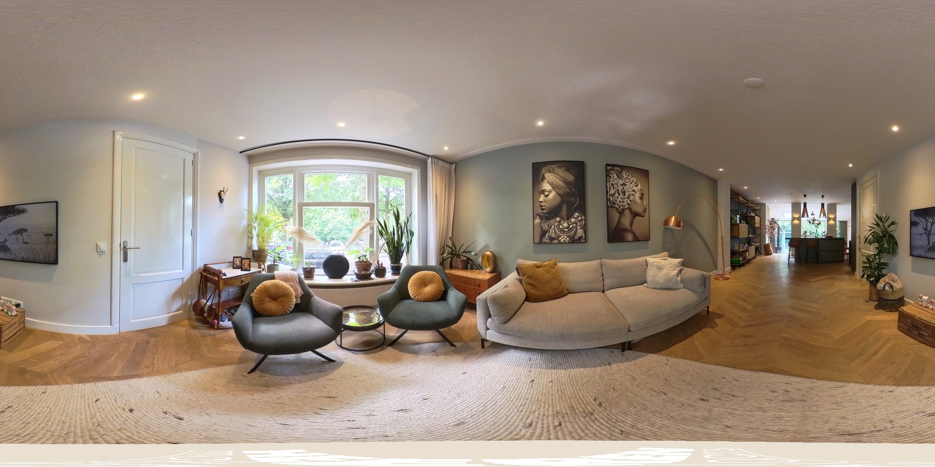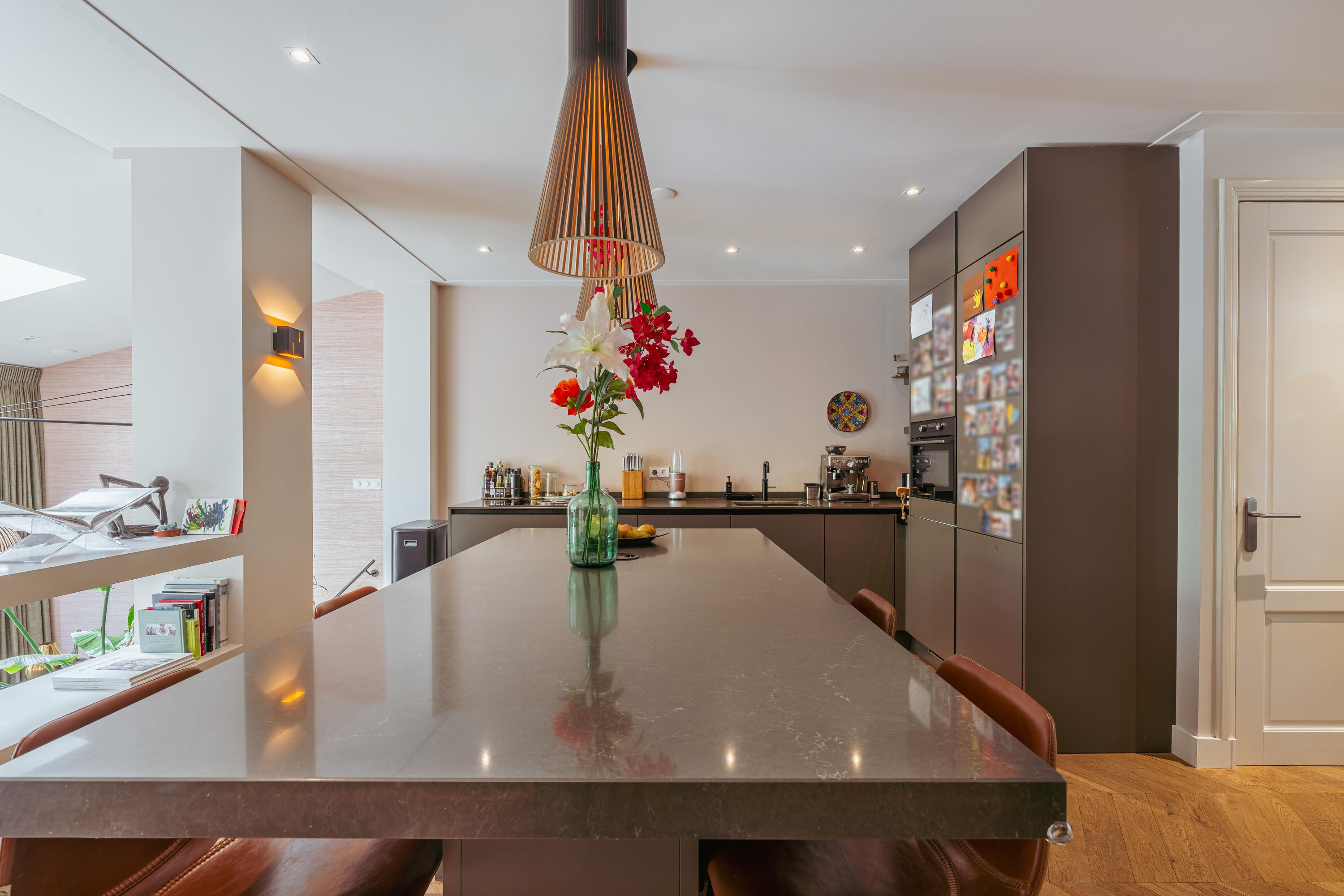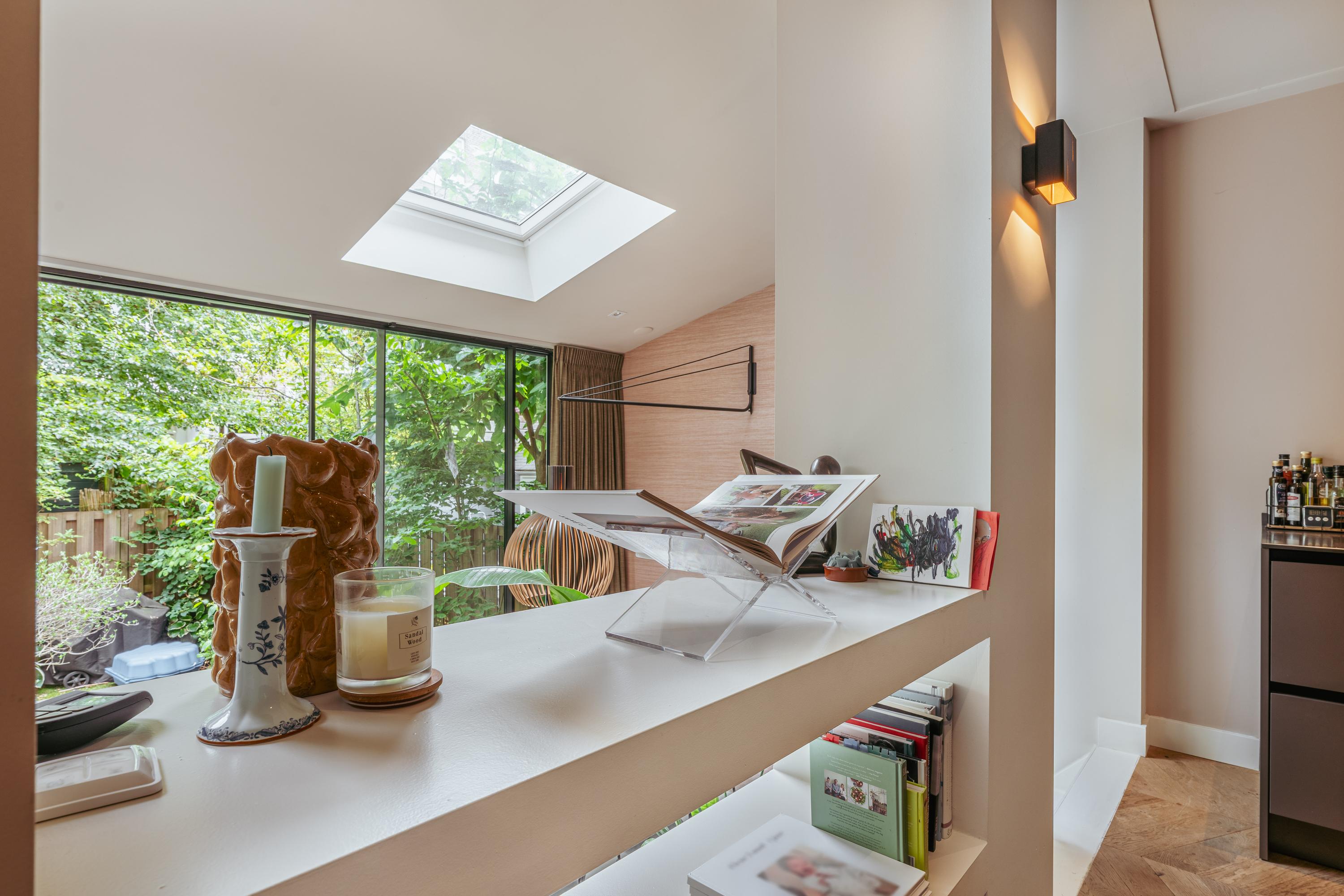 Aan de voorzijde bevindt zich de royale woonkamer, waar eenvoudig een comfortabele zithoek kan worden ingericht. Centraal in de woning treft u de open keuken met een stijlvol kookeiland en een gezellig bargedeelte. De keuken is uitgerust met hoogwaardige inbouwapparatuur, waaronder een 4-pits inductiekookplaat met geïntegreerde afzuiging, een vaatwasser, een koel-/vriescombinatie, een combi-oven en een Quooker. Een paar treden lager komt u in de recent gerealiseerde uitbouw met dakramen, die veel natuurlijk licht binnenlaten. Hier is momenteel een sfeervolle eetruimte ingericht, met daarnaast een extra zithoek rondom een moderne gashaard. Via plafondhoge glazen schuifdeuren bereikt u de fraai aangelegde tuin van circa 32 m², gelegen op het oosten. Daarnaast beschikt u over een praktische berging in de tuin.