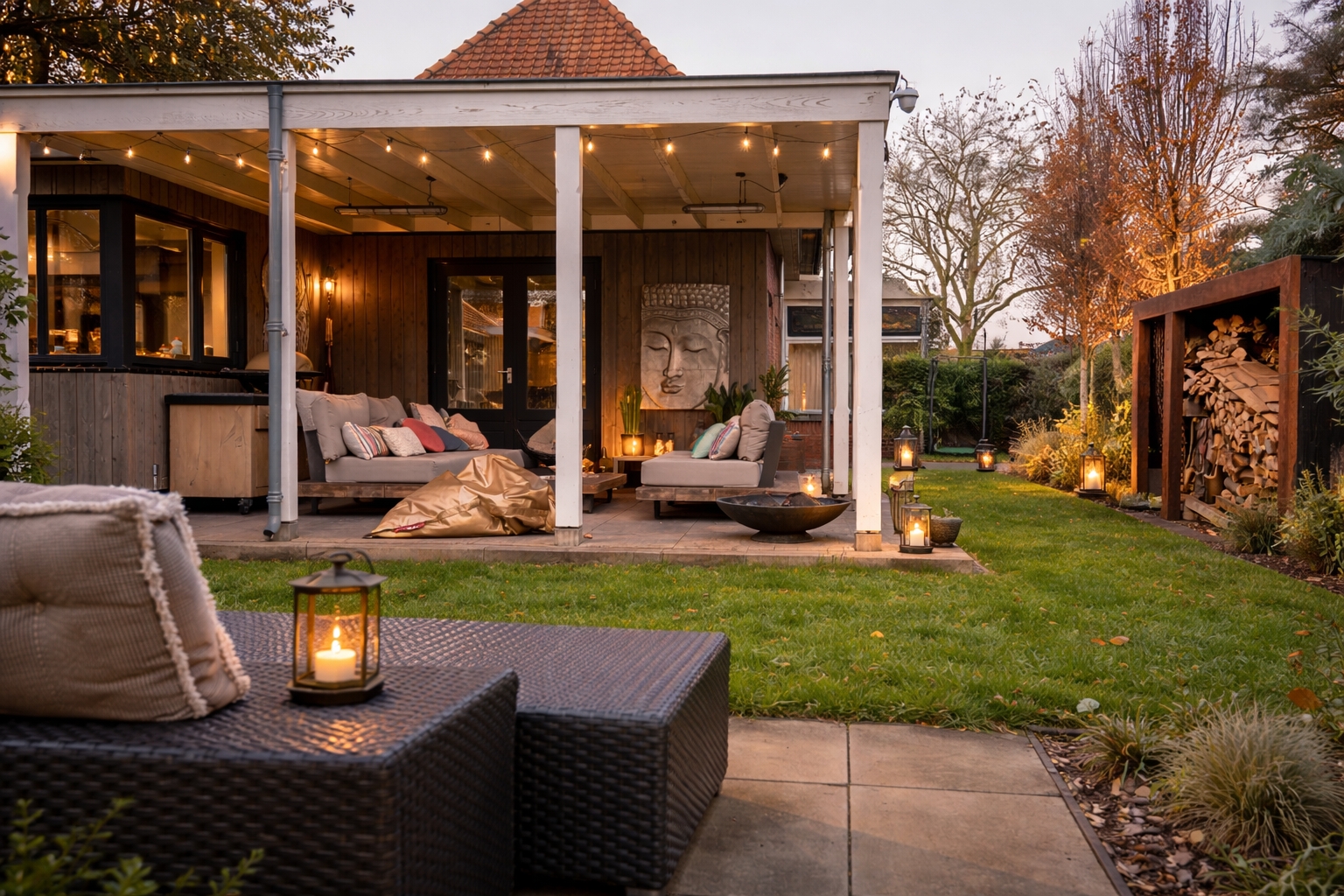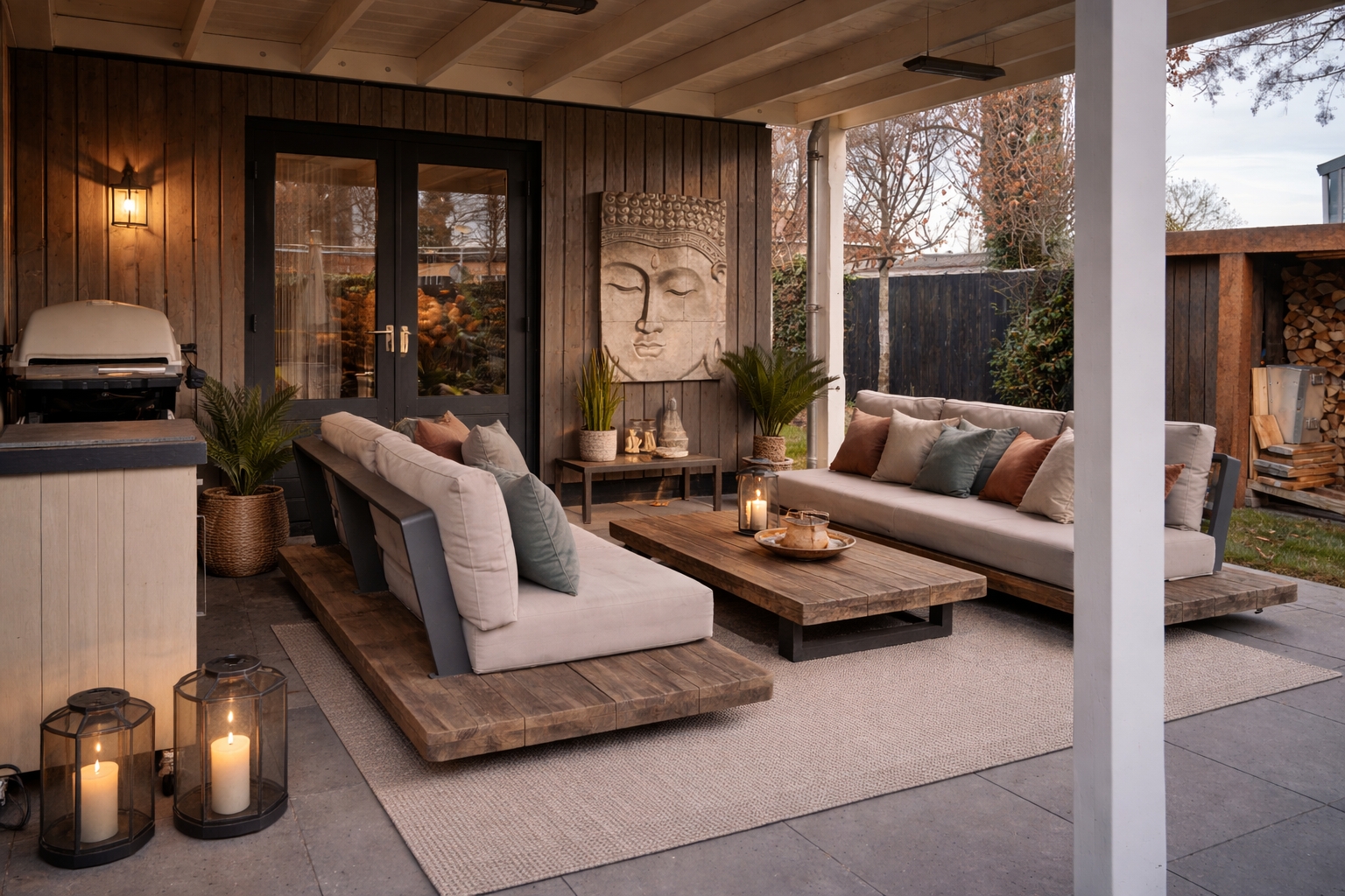 Buiten is het minstens zo aantrekkelijk. De diepe tuin is onder architectuur aangelegd en biedt veel privacy, fraaie zichtlijnen en diverse plekken om terrassen te creëren. De veranda aan de achterzijde vormt een sfeervol verlengstuk van de leefruimte en maakt van het buitenseizoen een vanzelfsprekend onderdeel van het wonen. Voor de woning is een grote carport aanwezig met daaronder een stalen berging. De oprit biedt ruimte voor meerdere auto’s. In de tuin zijn onder meer plantenborders en enkele bomen aanwezig, evenals een houtopslag en containeropstelplaats, uitgevoerd in Cortenstaal. Achter het bijgebouw is aanvullend een houten berging geplaatst voor tuinspullen en opslag.