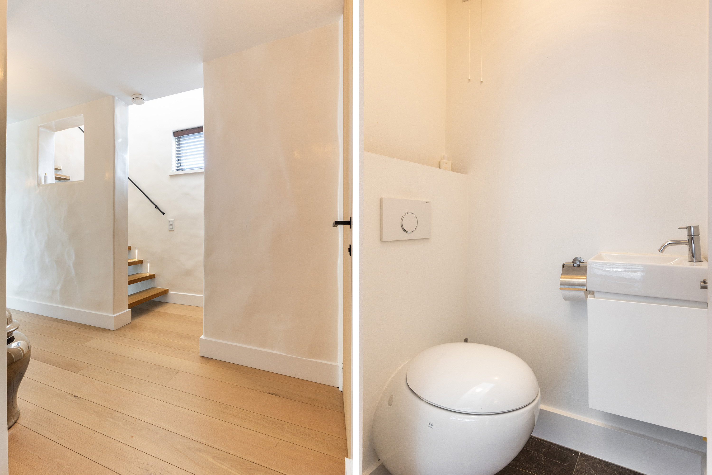 De entree is royaal, met open eiken trappen en sfeervolle verlichting. Het toilet is luxe uitgevoerd met een wandcloset, urinoir en marmeren wastafelmeubel.