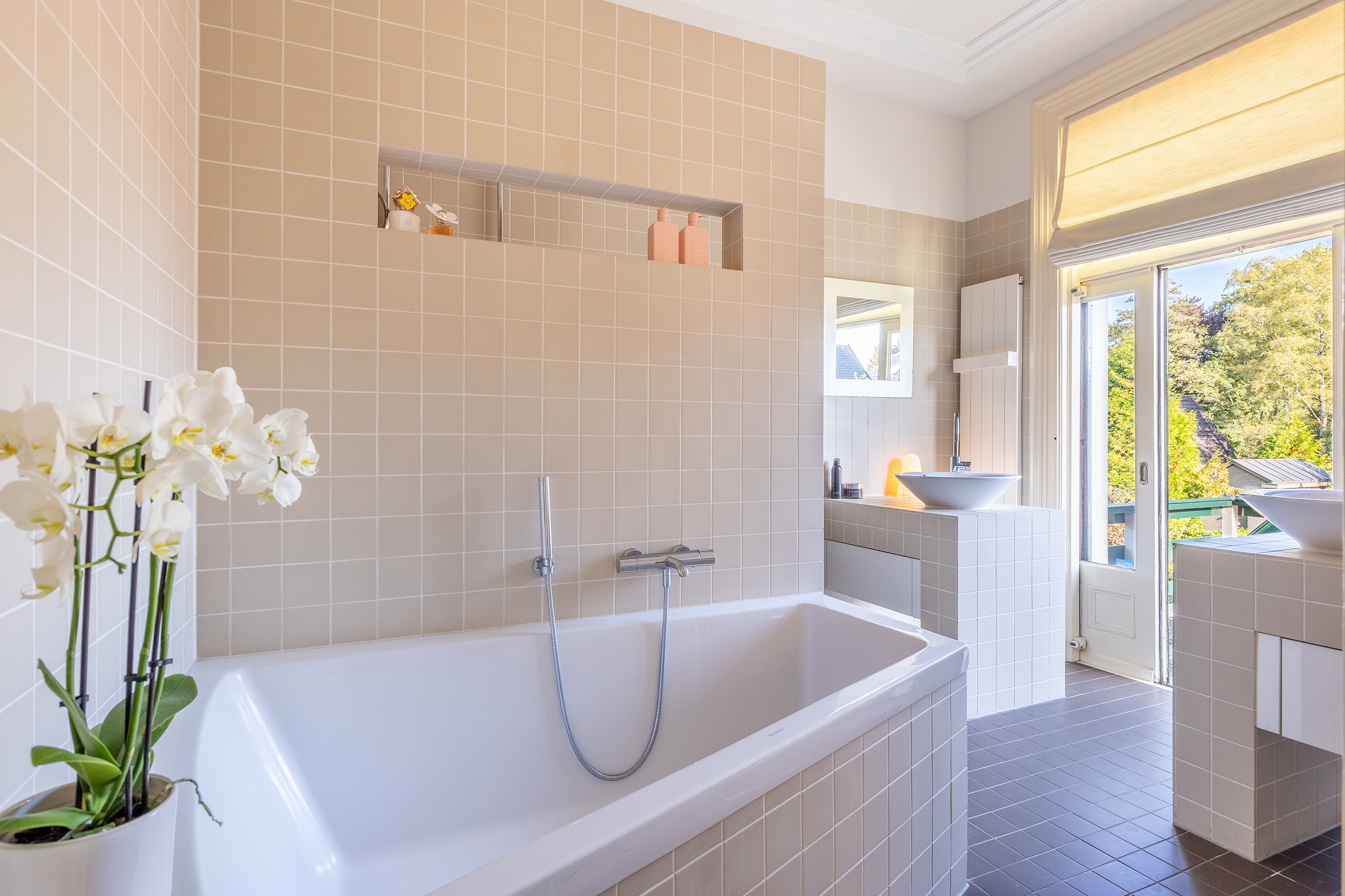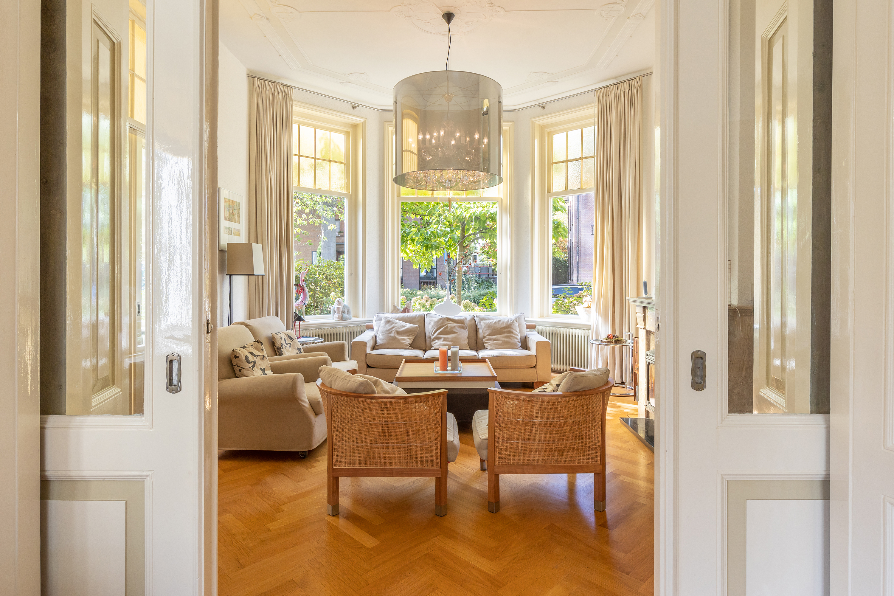 Indeling: Bij binnenkomst via de imposante voordeur betreedt u de vestibule met origineel tochtportaal. De ruime hal, voorzien van een granitovloer met het logo van de oorspronkelijke vrijmetselaarsbewoners, biedt toegang tot alle belangrijke leefruimtes. Rechts vindt u de royale woonkamer en-suite met een prachtige erker, originele suitedeuren met inbouwkasten en een ornamentenplafond. De voorkamer is ingericht als zitkamer, voorzien van een open haard met marmeren schouw. Via de en-suitedeuren betreedt u de lichte serre, die veel natuurlijk lichtinval biedt en ideaal is voor ontspanning met uitzicht op de tuin. De achterkamer, ingericht als lounge, heeft een sfeervolle Jacobus houtkachel en schuifdeuren naar het zonnige terras.