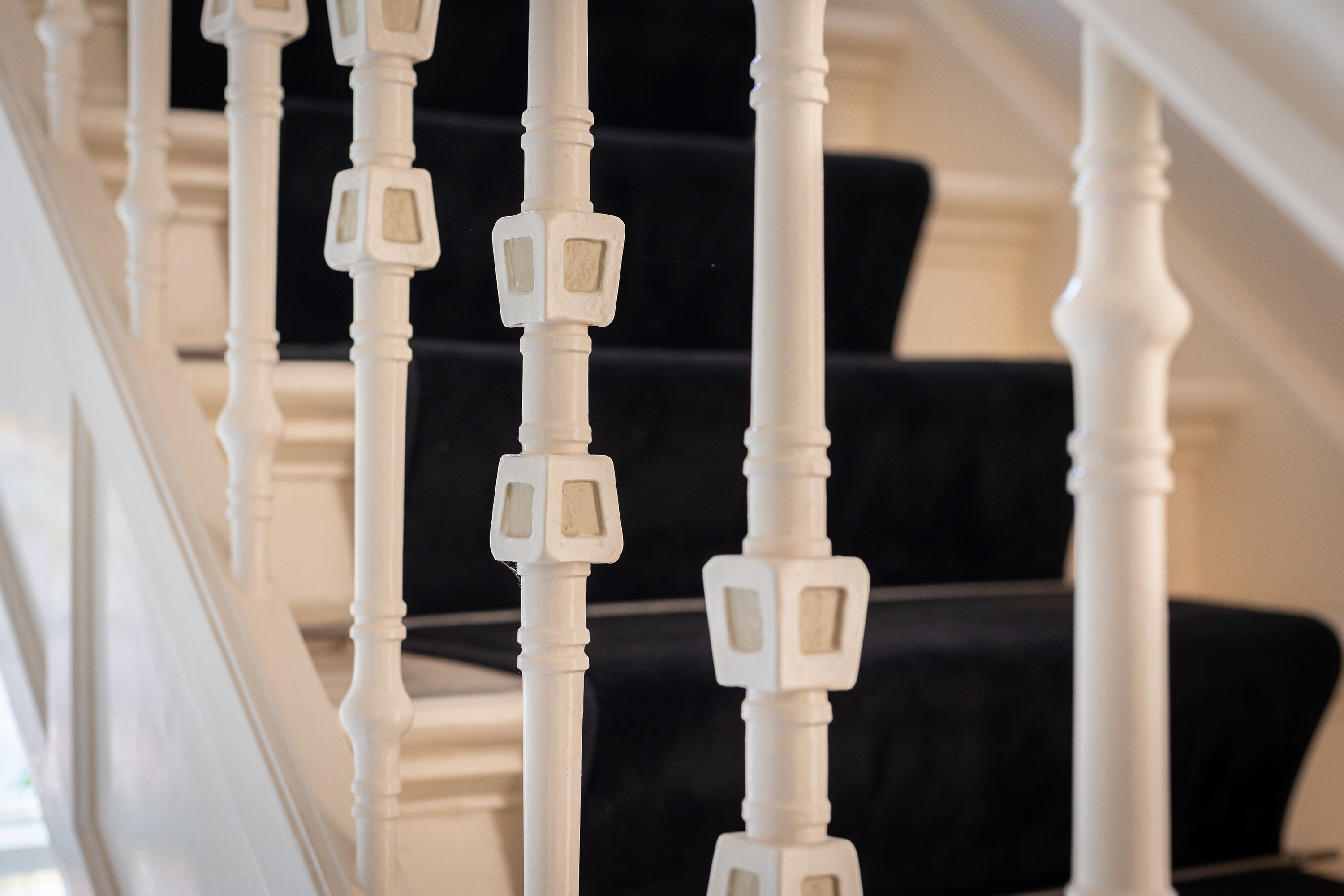 Aan de linkerzijde van de hal bevindt zich een ruime werkkamer, ideaal gelegen aan de voorzijde van de woning en voorzien van het unieke olieverfplafond in originele kleuren. Deze ruimte biedt rust en karakter, perfect als thuiskantoor of studieplek.
