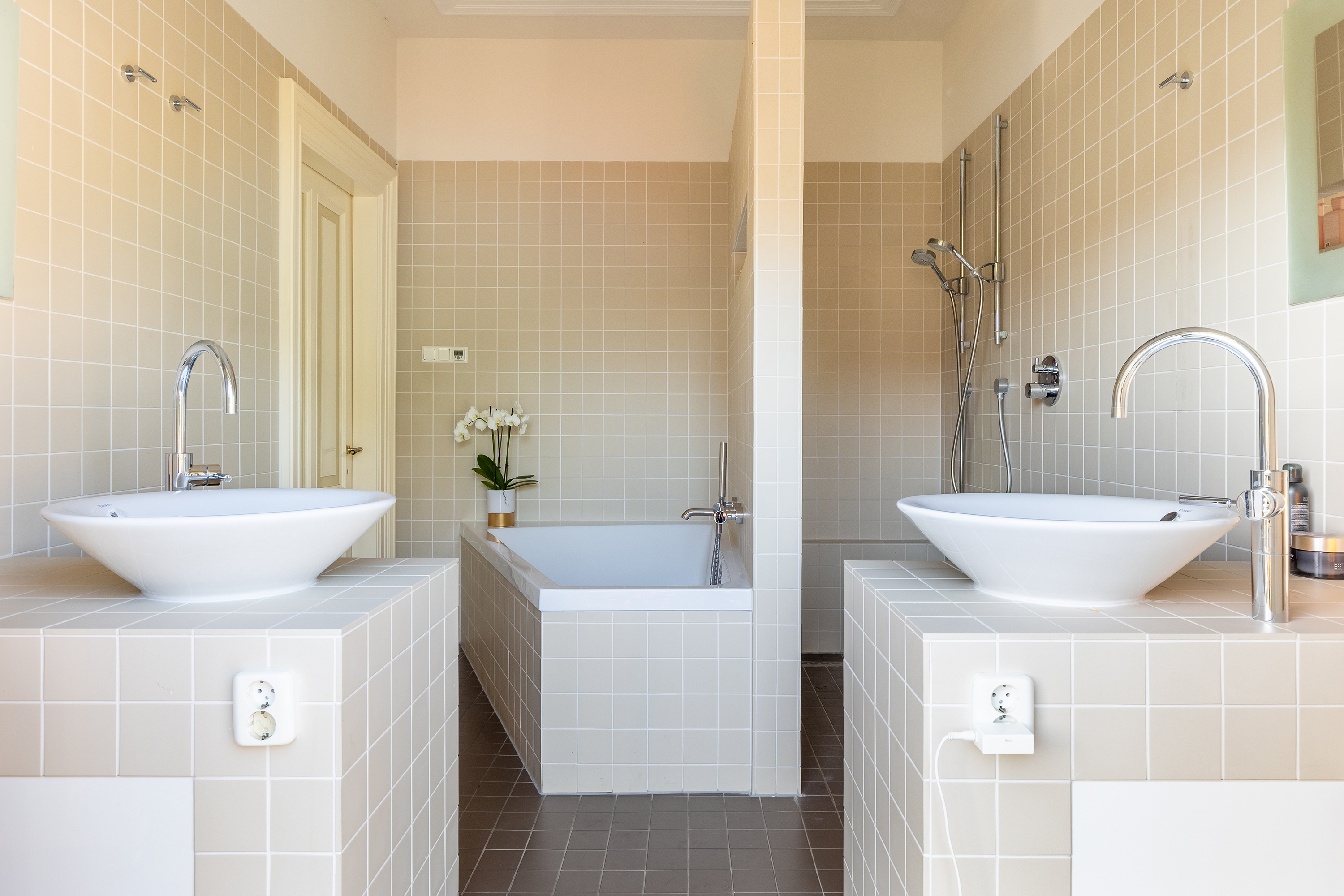 De woonkeuken is luxe uitgevoerd met maatwerk keukenkasten, afgewerkt in roomwit, en een granito aanrechtblad. In de schouw is een Lacanche gasfornuis met vijf pitten en twee ovens geplaatst. De keuken is ruim genoeg voor een grote eettafel, perfect voor gezellige diners met familie en vrienden. Naast de keuken bevindt zich de bijkeuken met wasmachine-aansluiting en toegang tot het terras.