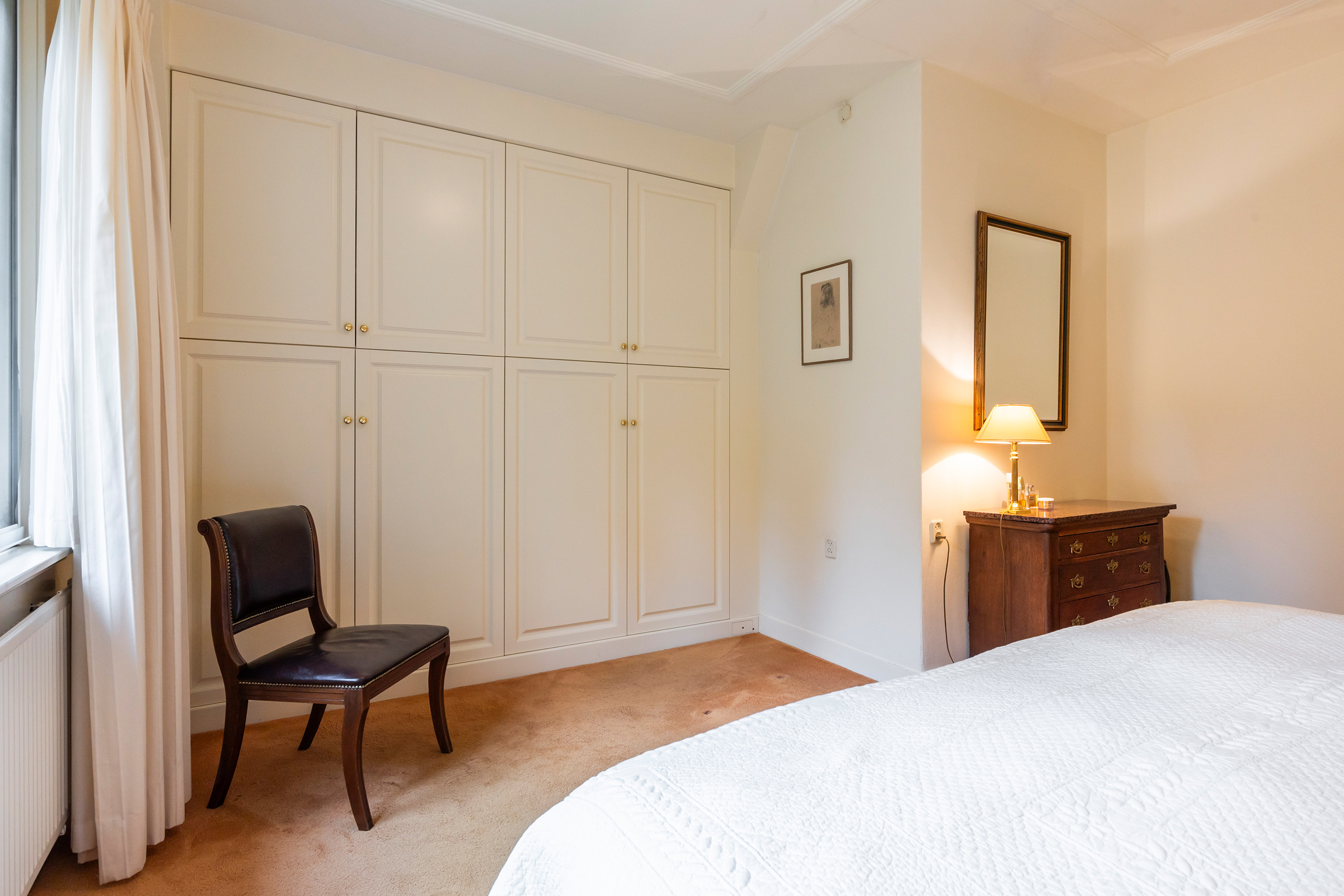 De hoofdslaapkamer ligt aan de zijkant van de woning en is royaal van formaat. Hier is een luxe inbouwkast geplaatst met acht deuren, voorzien van hang- en legruimte en lades. Achter het bed is extra bergruimte op maat aangebracht, wat de kamer zowel praktisch als stijlvol maakt.