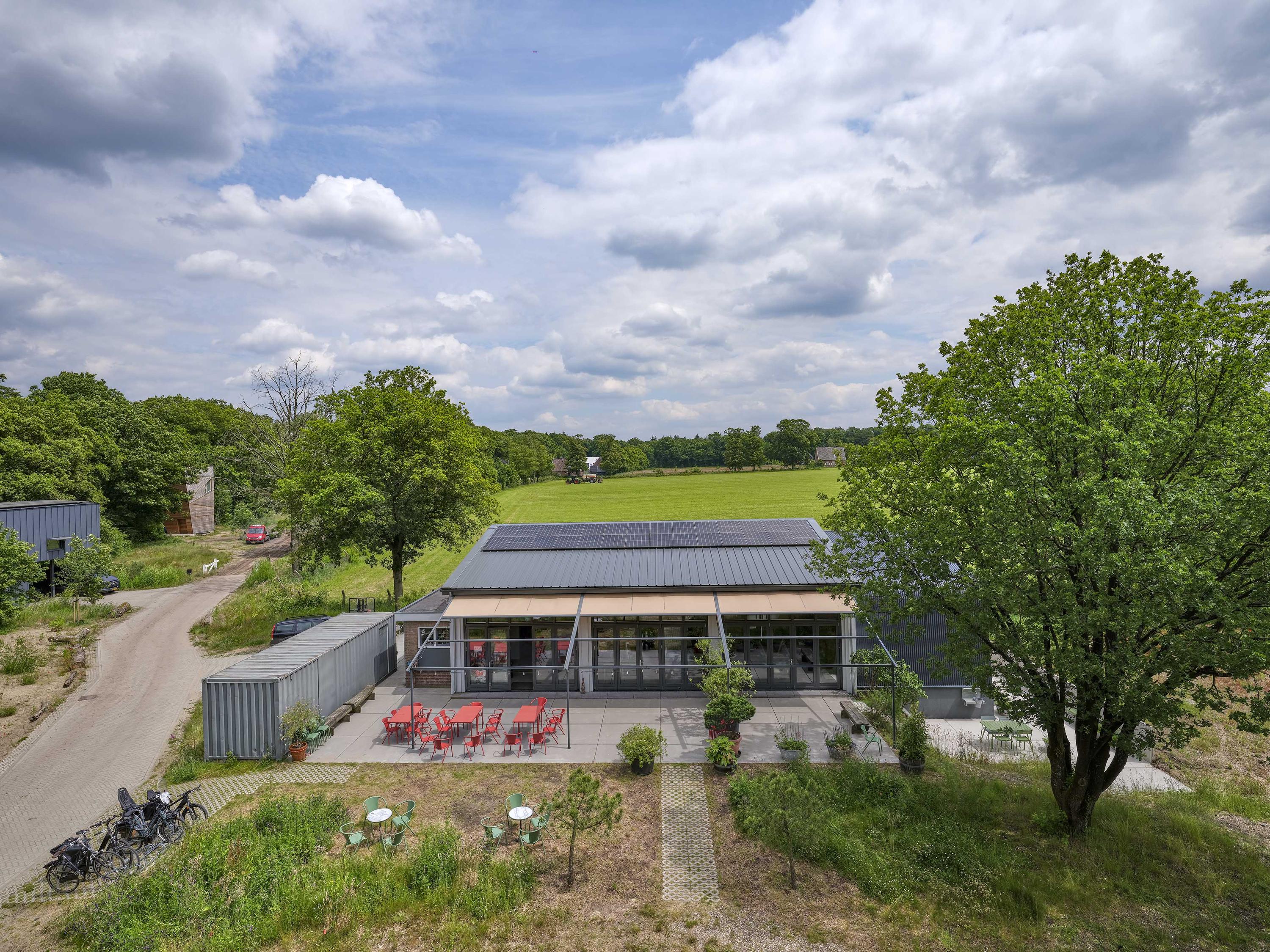 Het pand heeft een horecabestemming en deed ooit dienst als militaire hangar. In 2021 is het volledig gerenoveerd en luxe uitgebreid met een moderne bedrijfswoning. Vanuit de woning kijk je uit over het groen en ervaar je elke dag het gevoel van vrijheid.