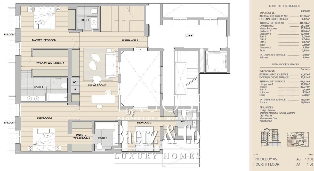 Met drie slaapkamers en vijf badkamers is de indeling geschikt voor zowel privégebruik als stijlvolle ontvangsten. Onberispelijke afwerkingen sluiten naadloos aan op moderne apparatuur, airconditioning, verwarming, video-intercom en praktische gemakken zoals inbouwkasten en een aparte wasruimte.