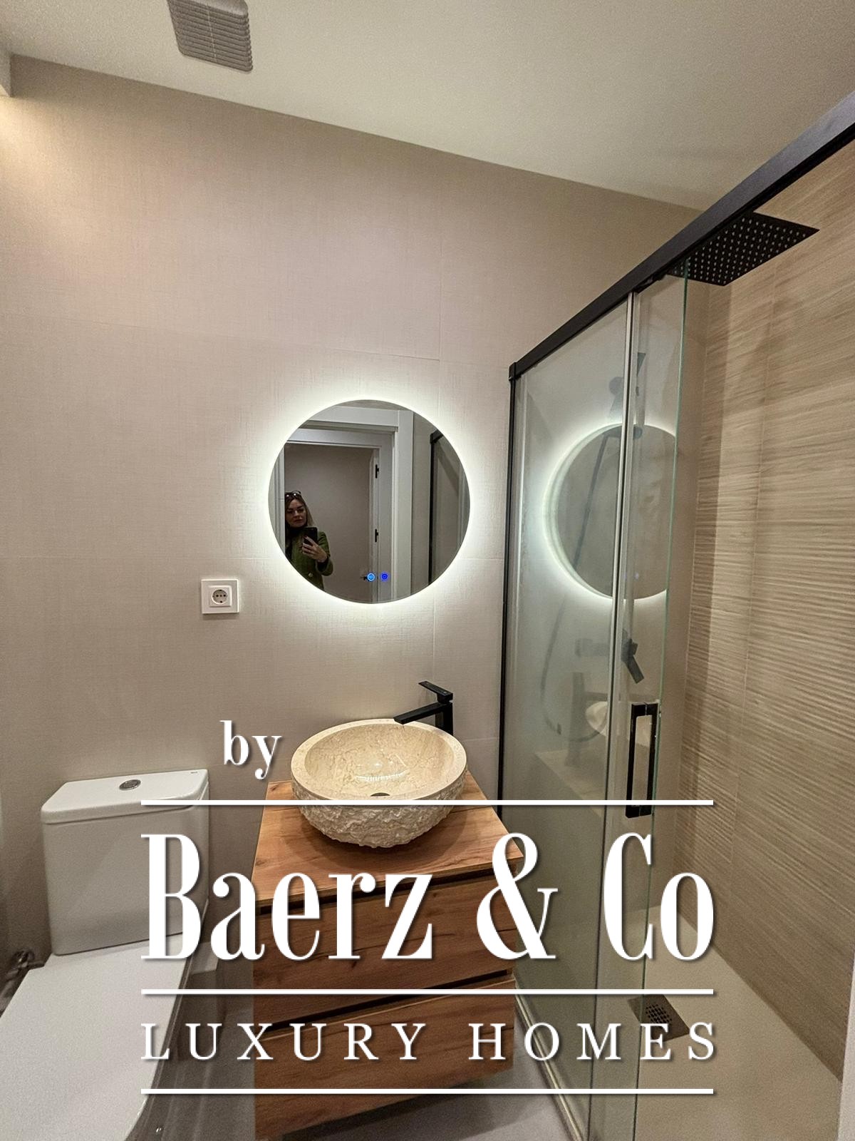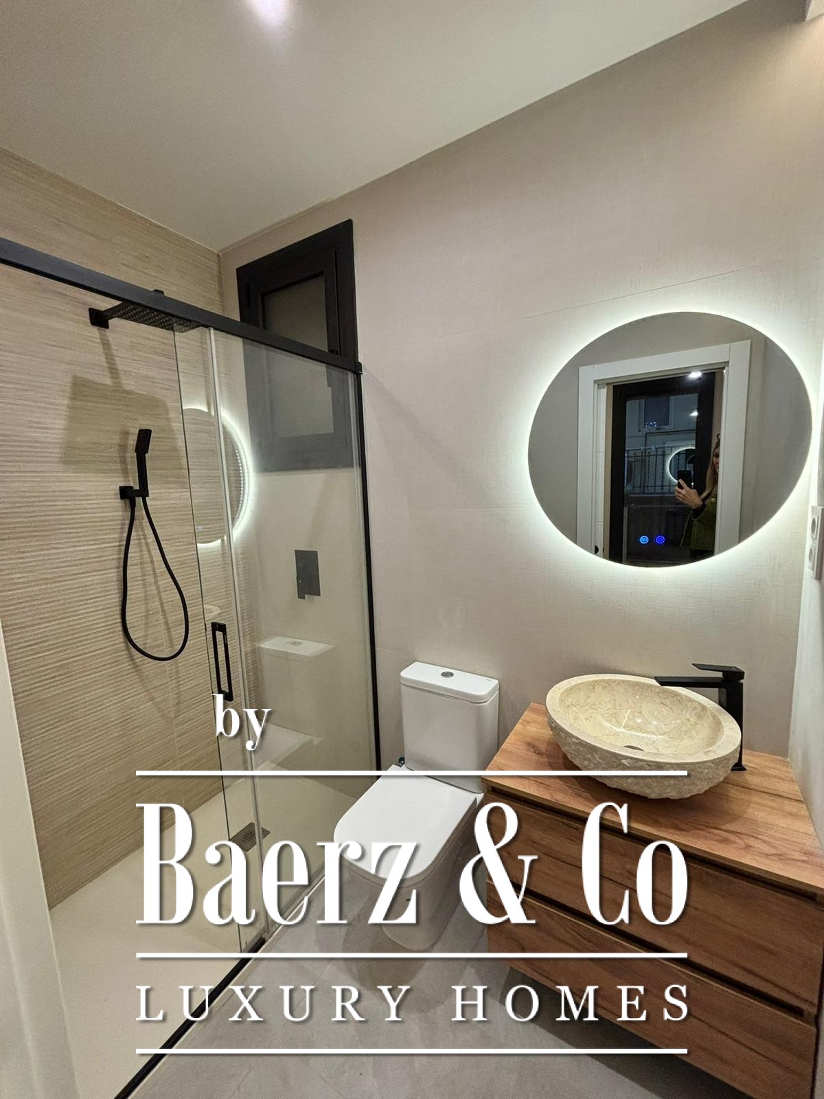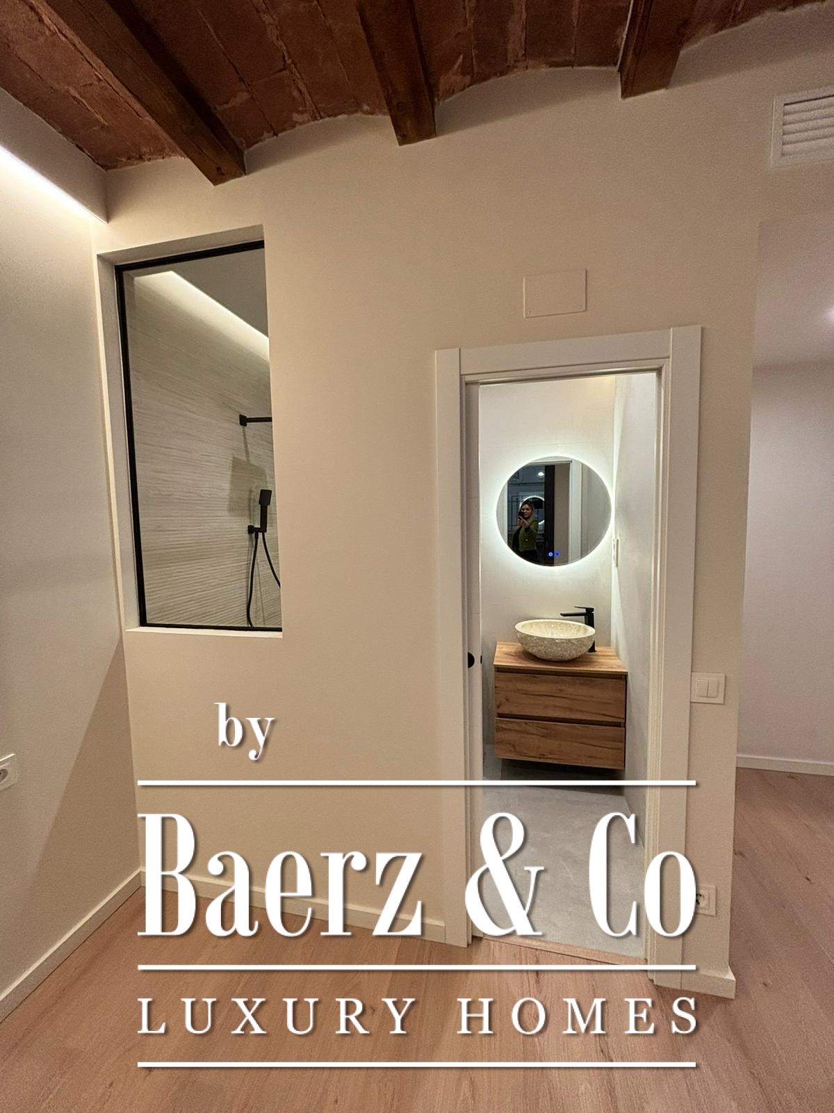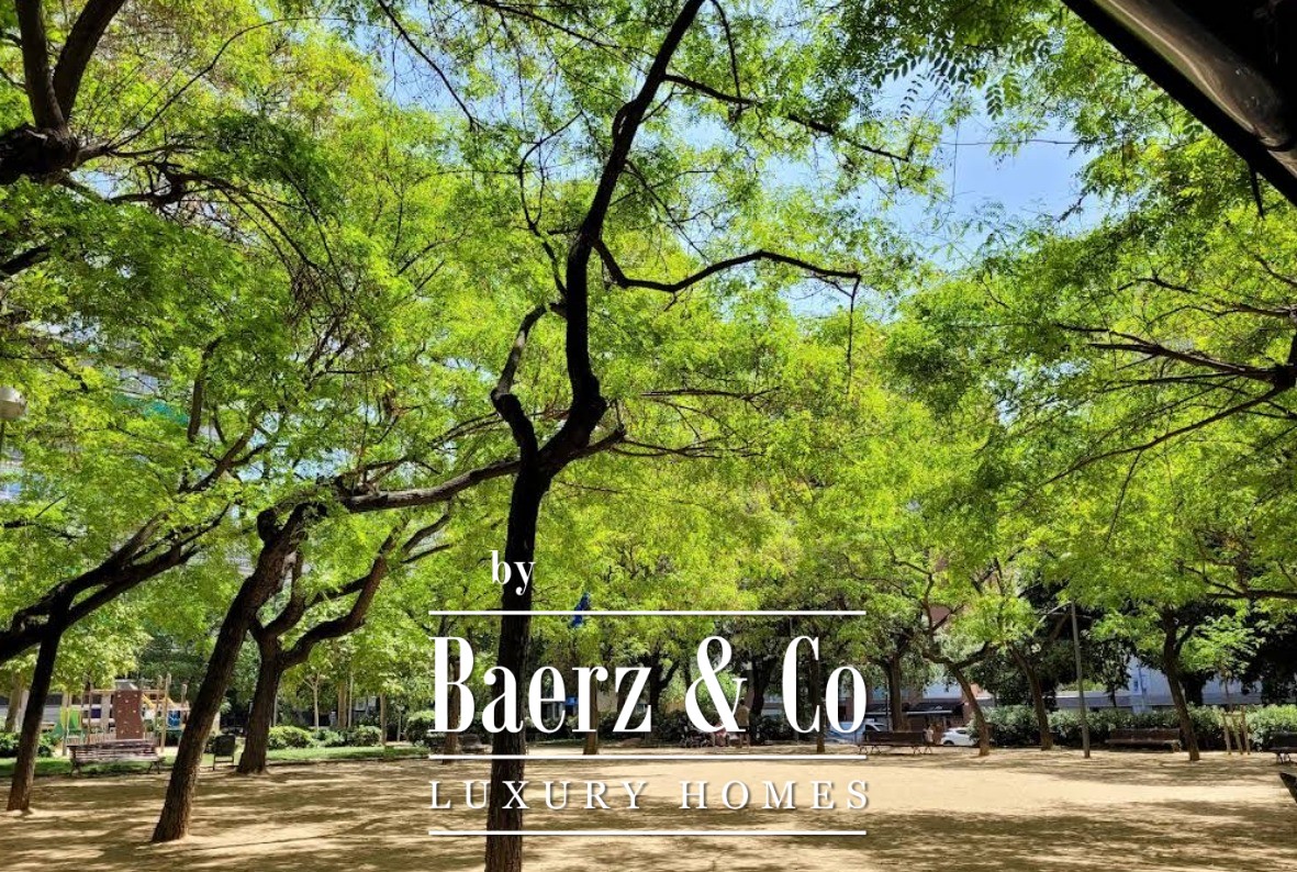 De woonkamer en eetkamer liggen op het oosten en ontvangen het ochtendlicht, met uitzicht op het rustige park wat een serene sfeer geeft. De aparte keuken, die deels open is naar het leefgedeelte, beschikt over Bosch apparatuur en marmerlook afwerkingen die doorlopen in de gang, waardoor visuele harmonie ontstaat. Katalaanse gewelfde plafonds benadrukken de architectonische waarde, terwijl centrale airconditioning, dubbele beglazing en hoogwaardige LED-verlichting voorzien in hedendaags wooncomfort.