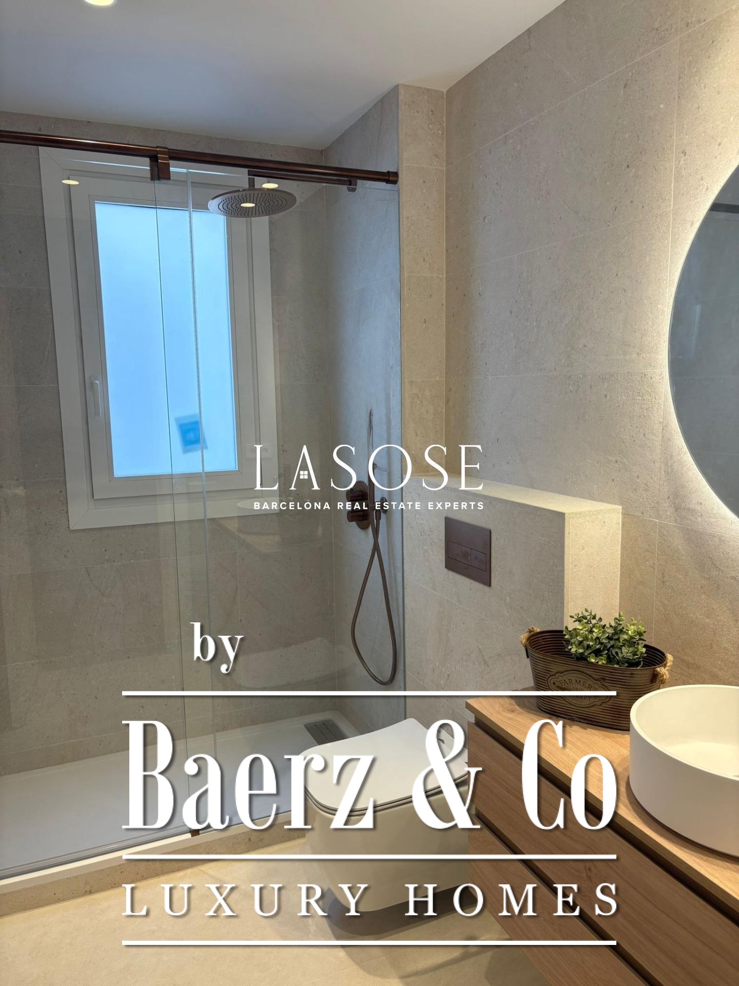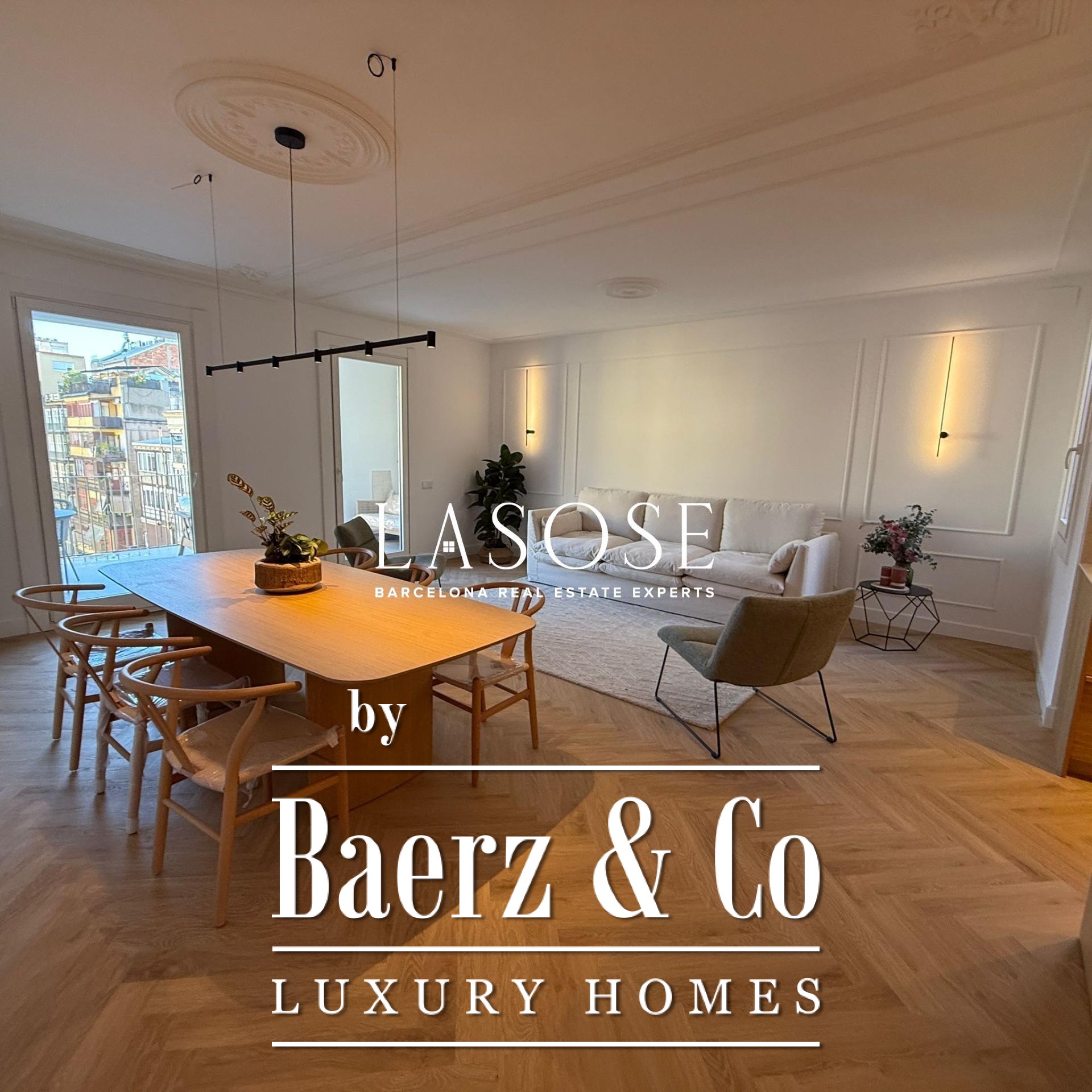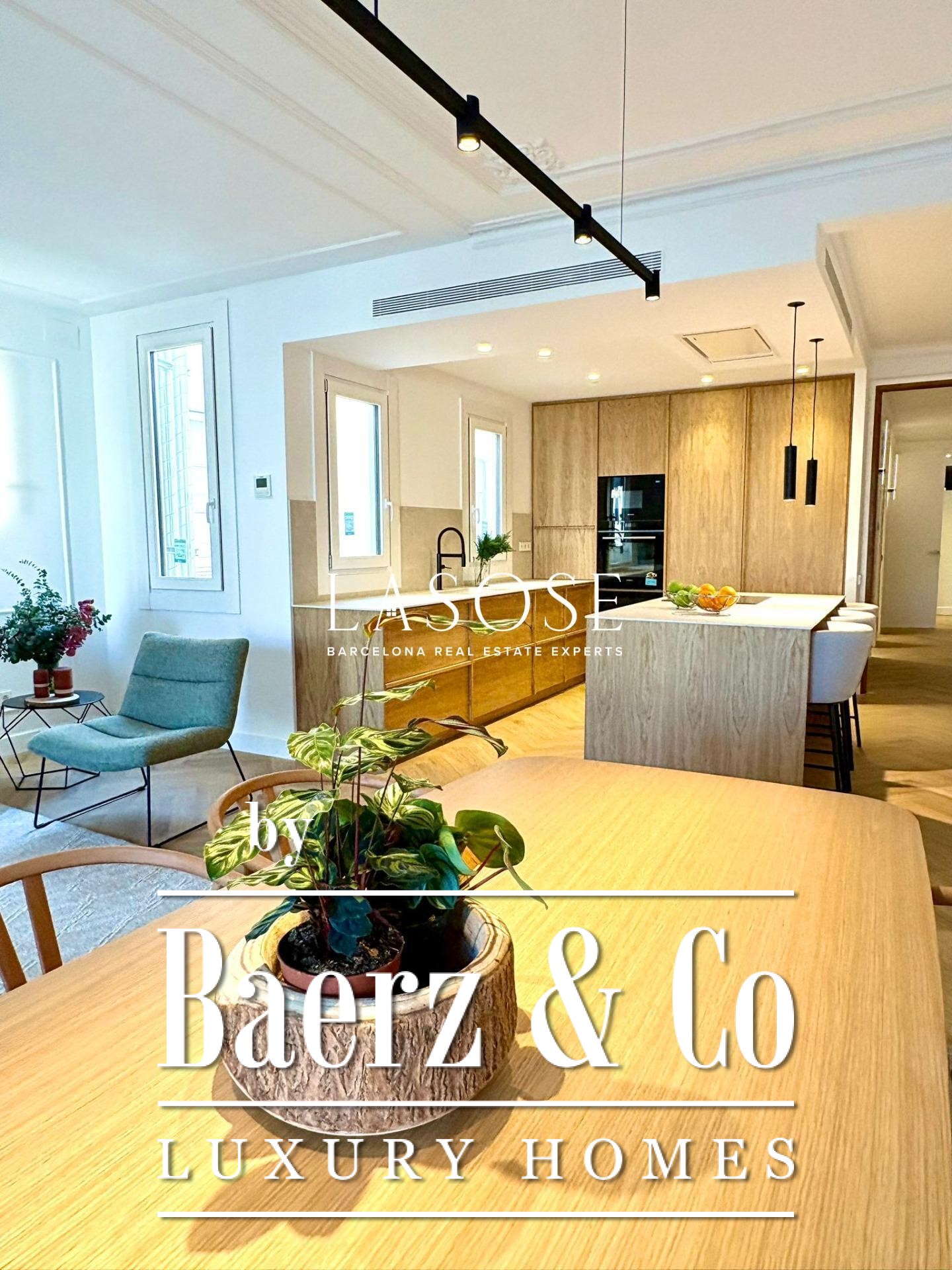 Originele hoge plafonds, sierlijke plafonddetails en traditionele dubbele houten deuren weerspiegelen het architecturale erfgoed van Barcelona, terwijl de royale multifunctionele woon-, eet- en keukenruimte baadt in natuurlijk licht en directe toegang biedt tot een privéterras van 18 m². Het terras is ingericht als lounge en eetruimte en verbindt zo het binnenleven naadloos met het befaamde buitenleven van de stad.