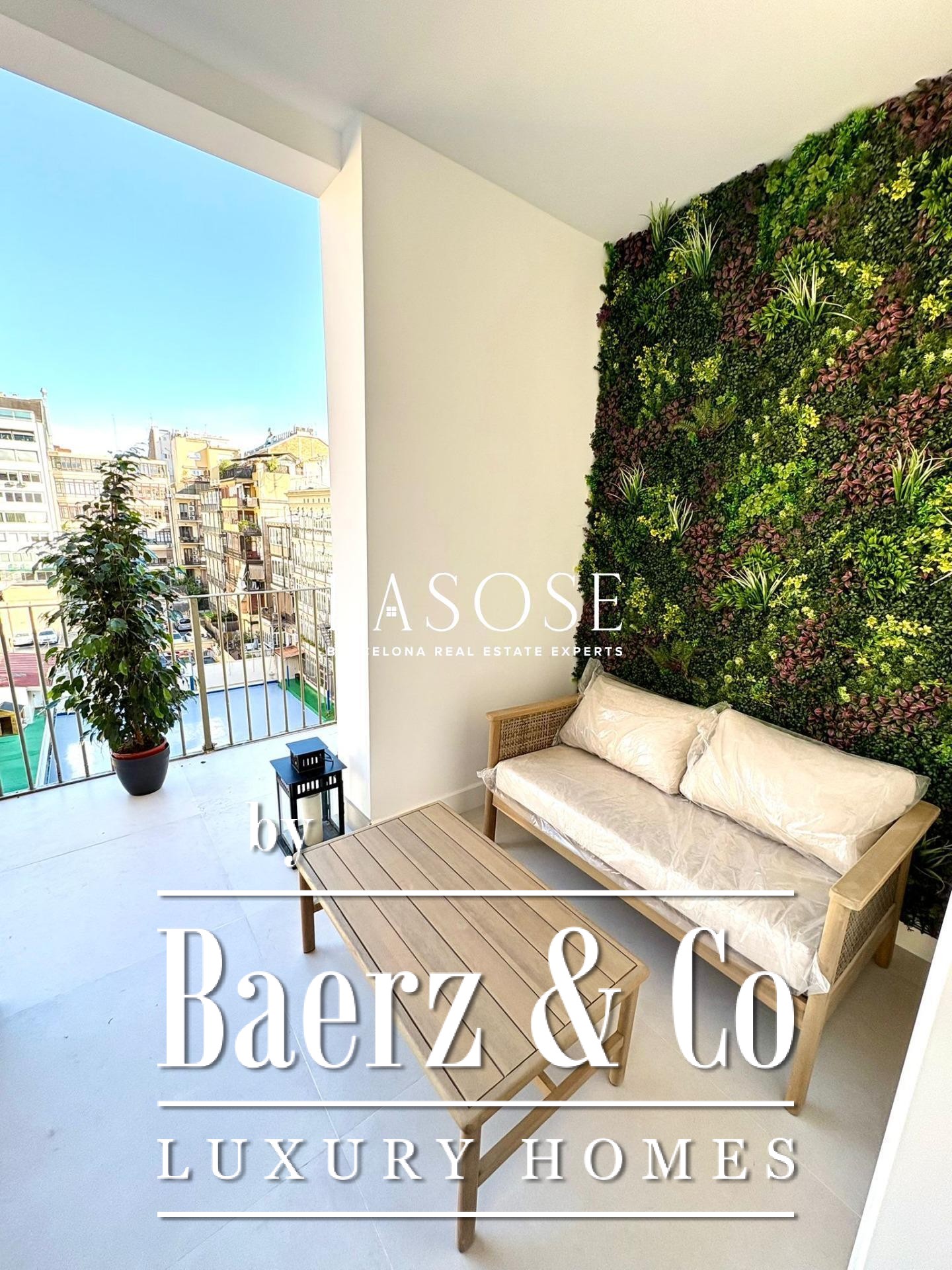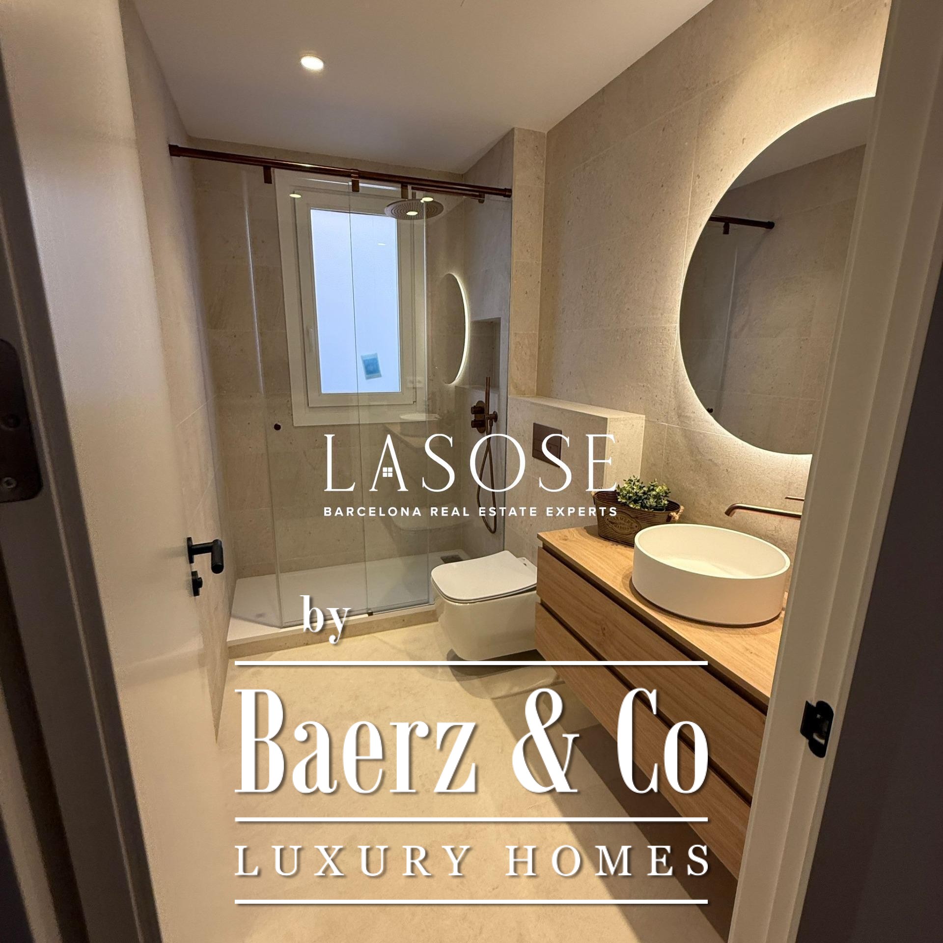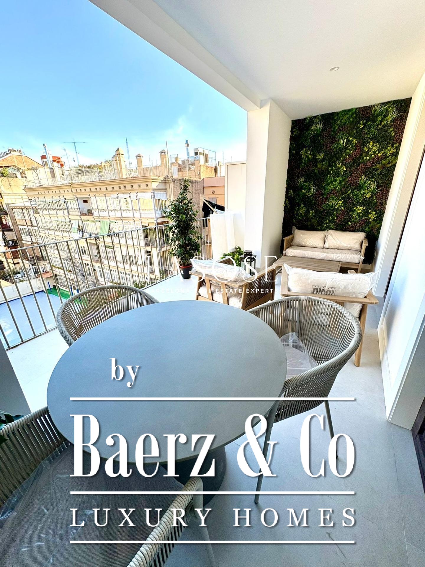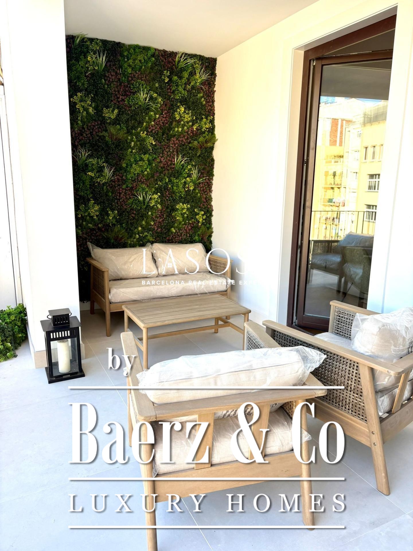 Originele hoge plafonds, sierlijke plafonddetails en traditionele dubbele houten deuren weerspiegelen het architecturale erfgoed van Barcelona, terwijl de royale multifunctionele woon-, eet- en keukenruimte baadt in natuurlijk licht en directe toegang biedt tot een privéterras van 18 m². Het terras is ingericht als lounge en eetruimte en verbindt zo het binnenleven naadloos met het befaamde buitenleven van de stad.