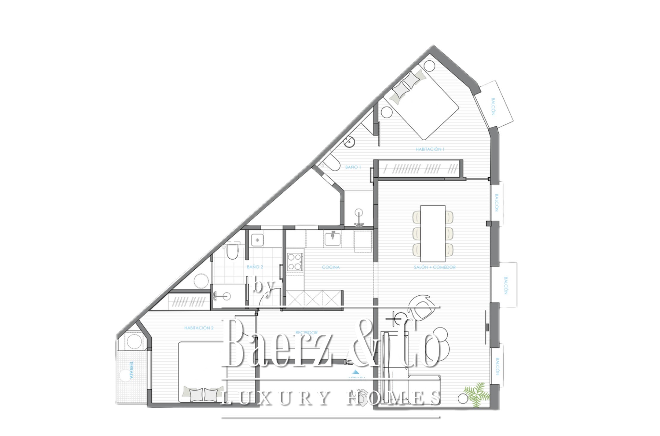 De eigentijdse indeling loopt naadloos over van een lichte woon- en eetkamer naar een volledig uitgeruste moderne keuken, waarbij elke ruimte baadt in natuurlijk licht dankzij drie buitenspatio’s van elk 3,38 m². Twee goed ingedeelde slaapkamers en twee verfijnde badkamers waarborgen privacy en comfort, terwijl zorgvuldig gerestaureerde architectonische details het oorspronkelijke karakter van het pand behouden.
