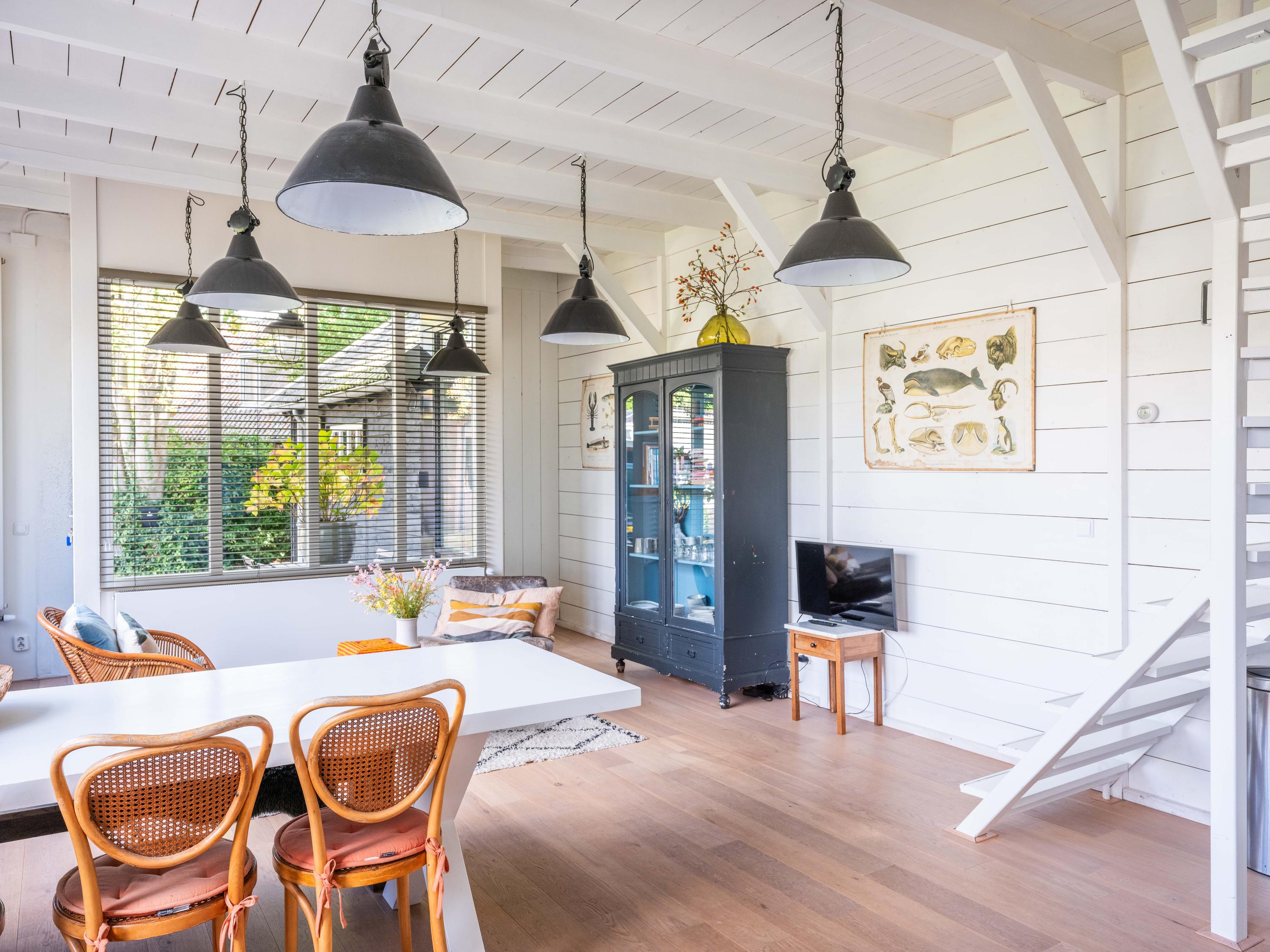 Grenzend aan de keuken bevindt zich de sfeervolle woonkamer met houtkachel, ramen rondom en diverse openslaande deuren naar de tuin. De houten details en de warme uitstraling maken dit een heerlijke plek om te ontspannen, zowel ’s winters bij de haard als ’s zomers met de deuren open naar de tuin met terras.