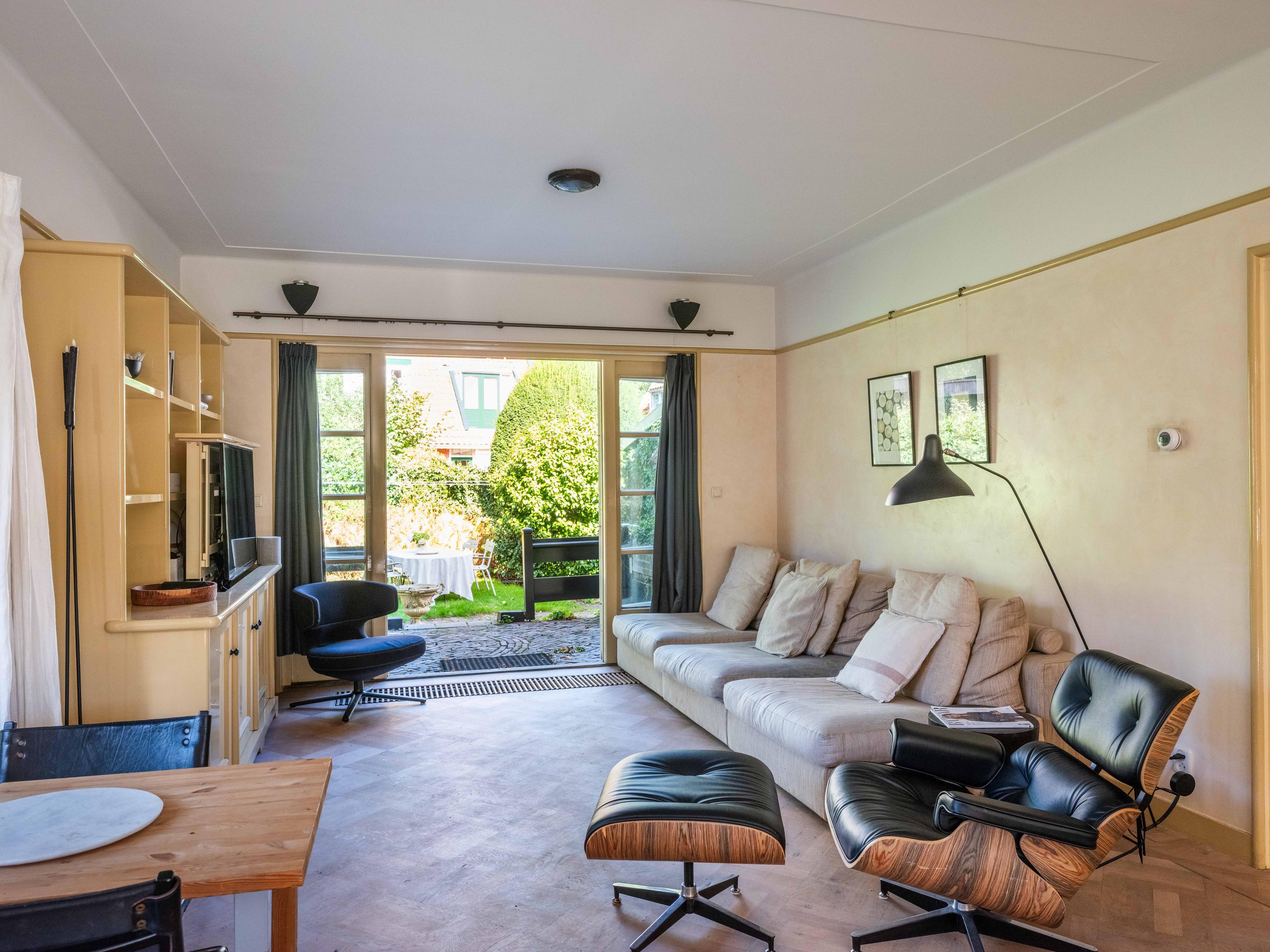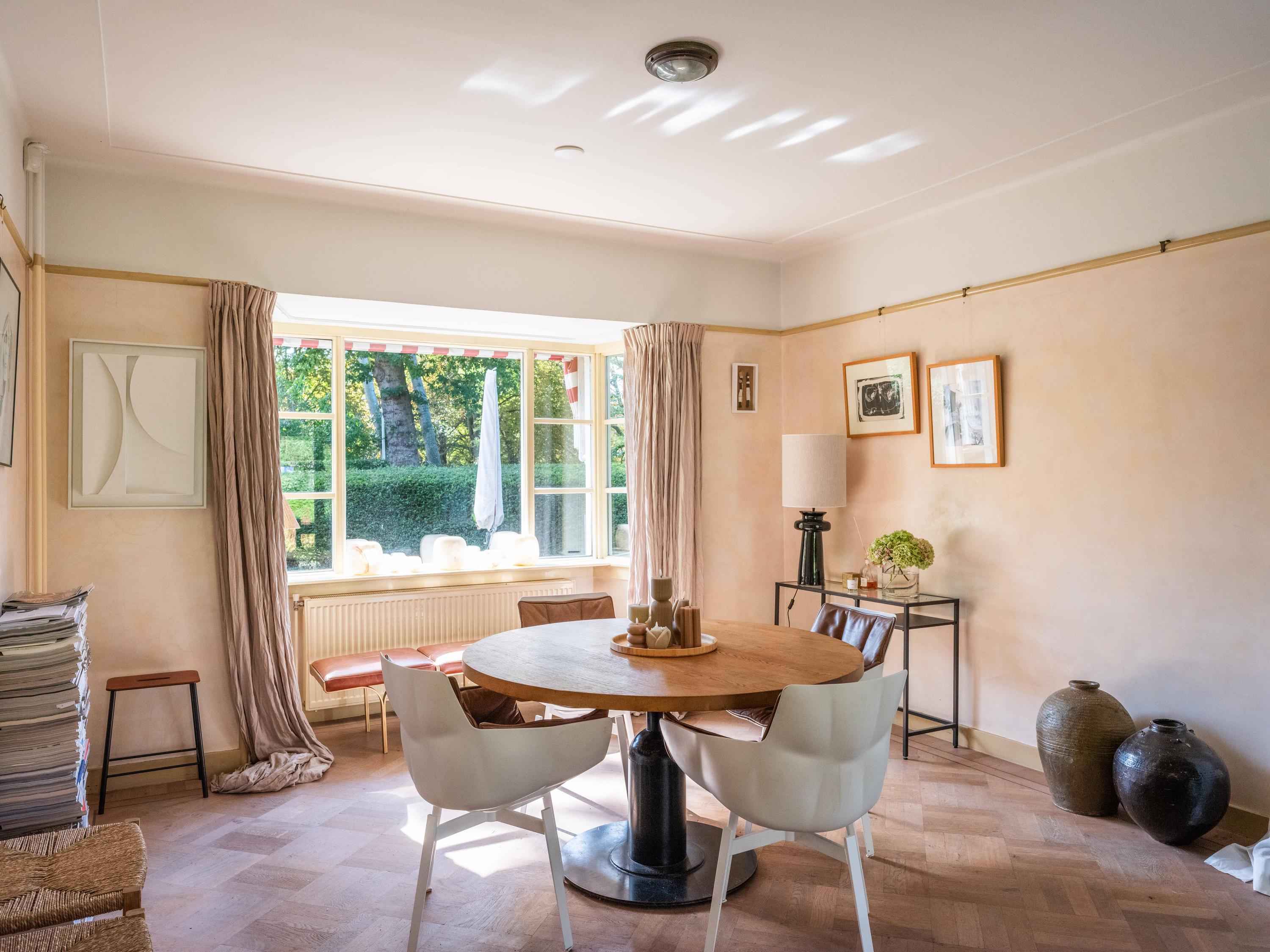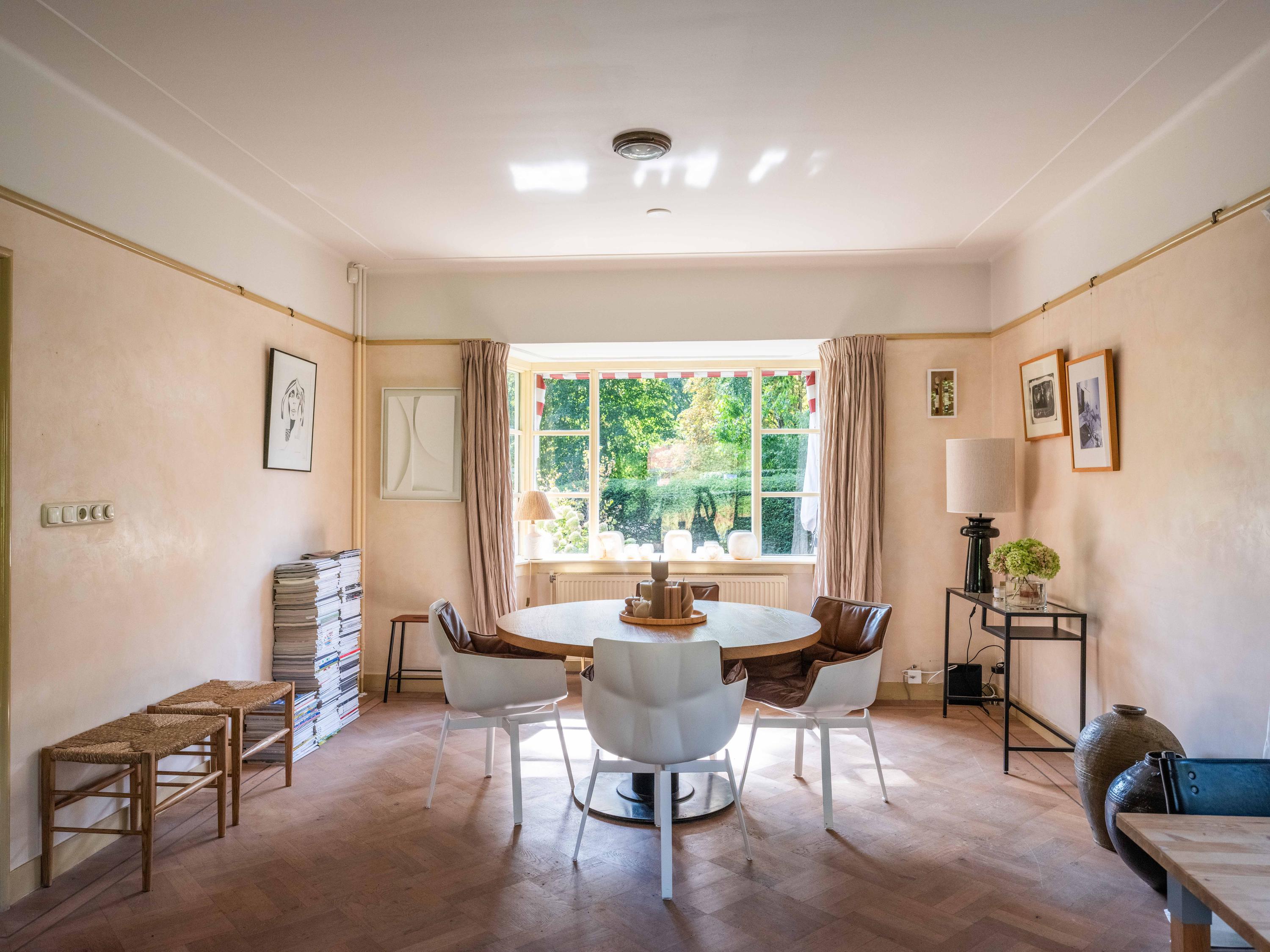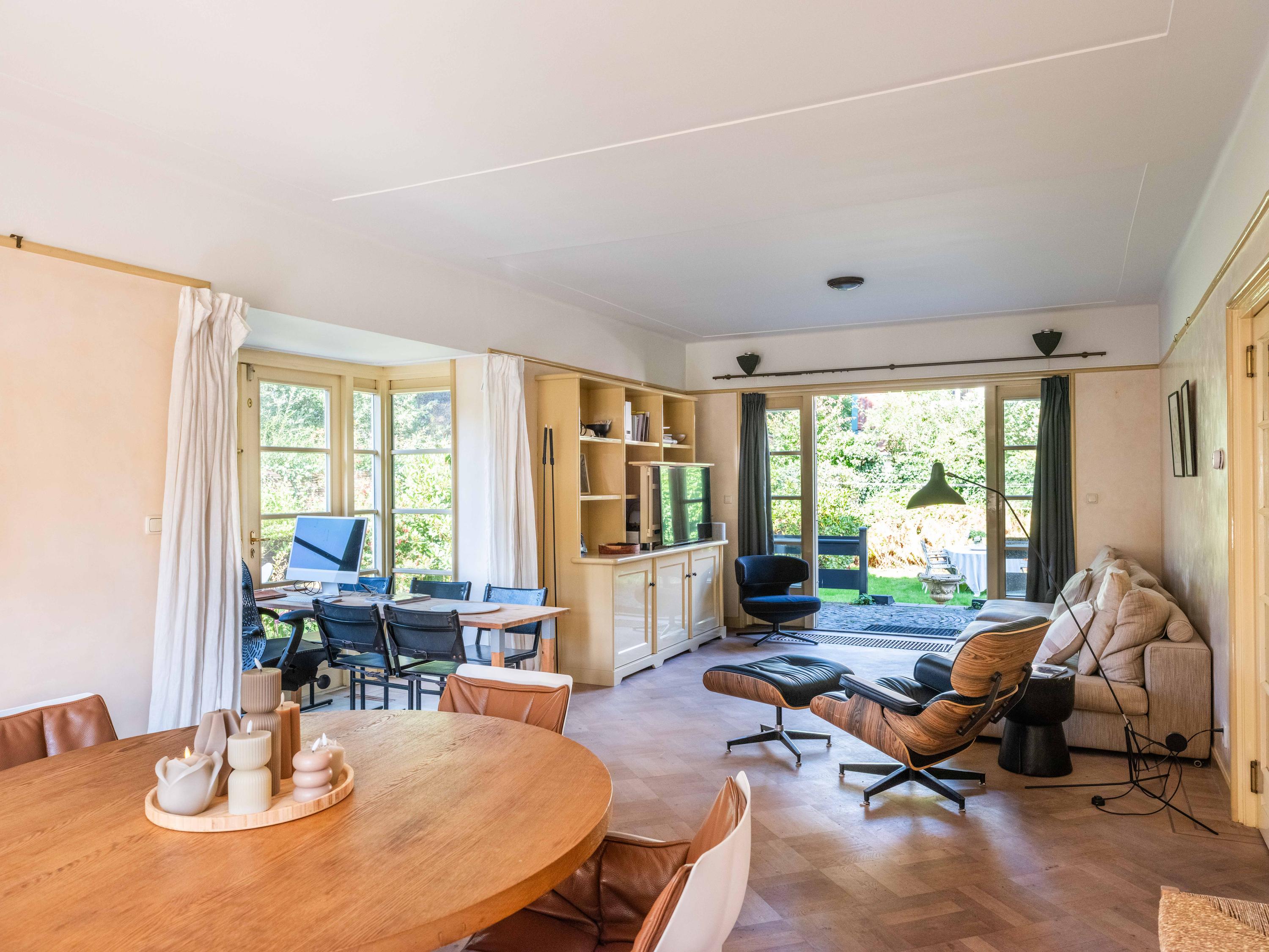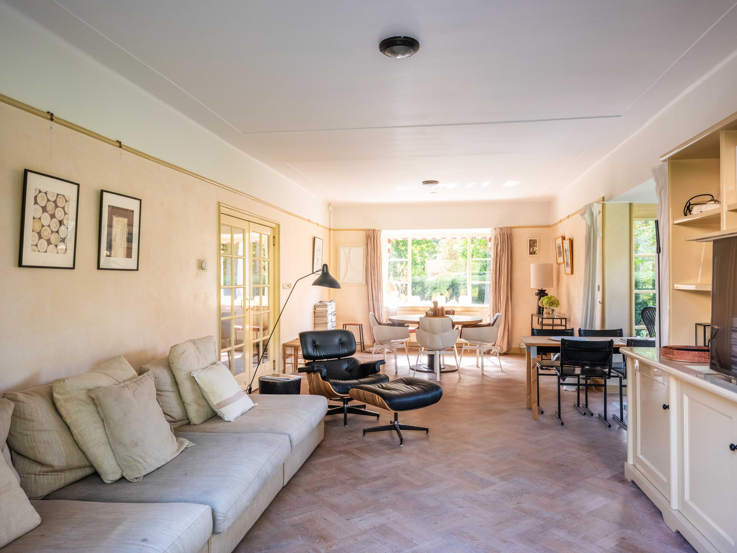 De woonkamer met erker is heerlijk licht. Een parketvloer met bies geeft een chique uitstraling. Openslaande deuren leiden naar diverse terrassen, waar u ervoor kunt kiezen heerlijk in de zon of in de schaduw te gaan zitten.