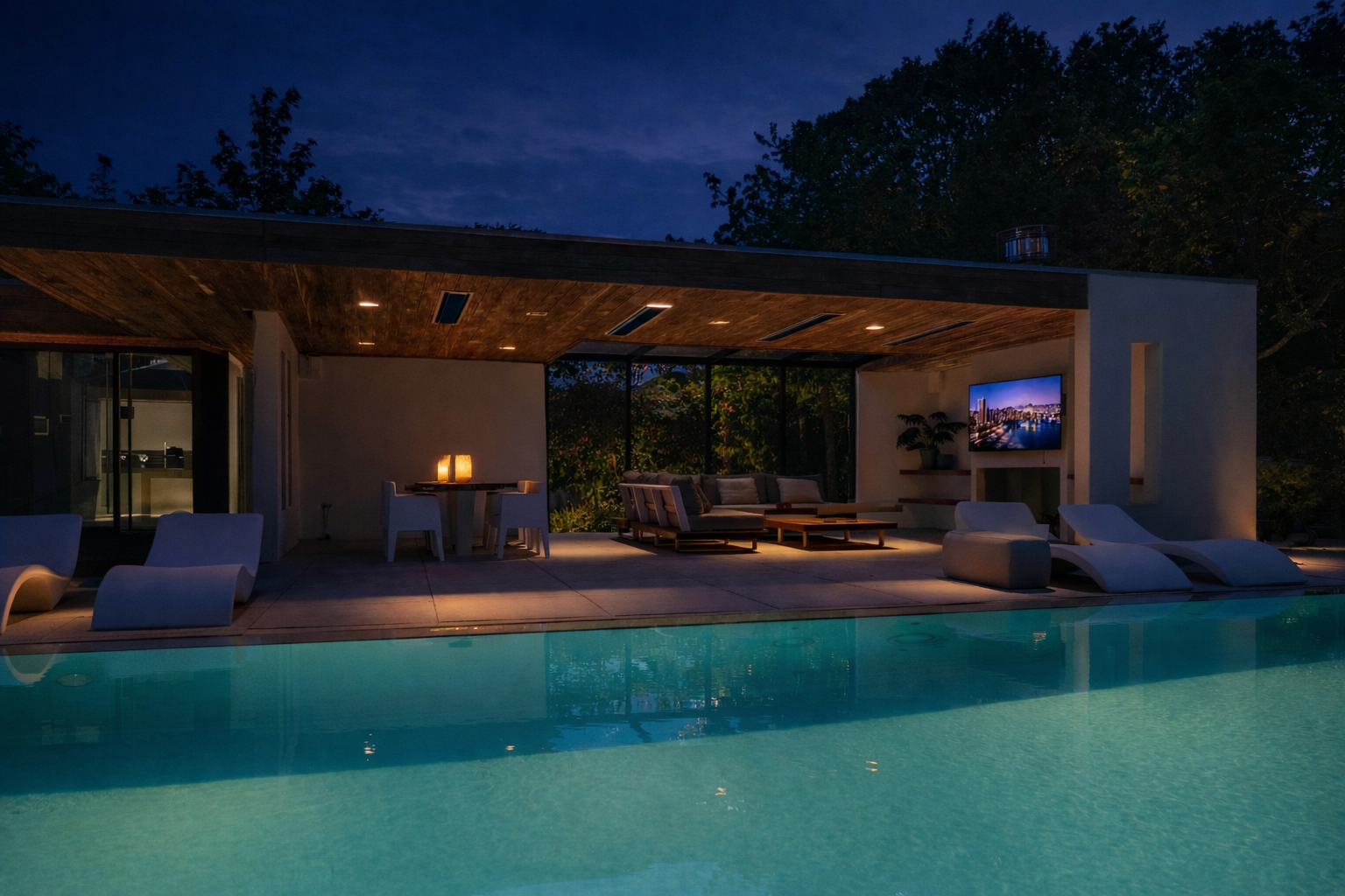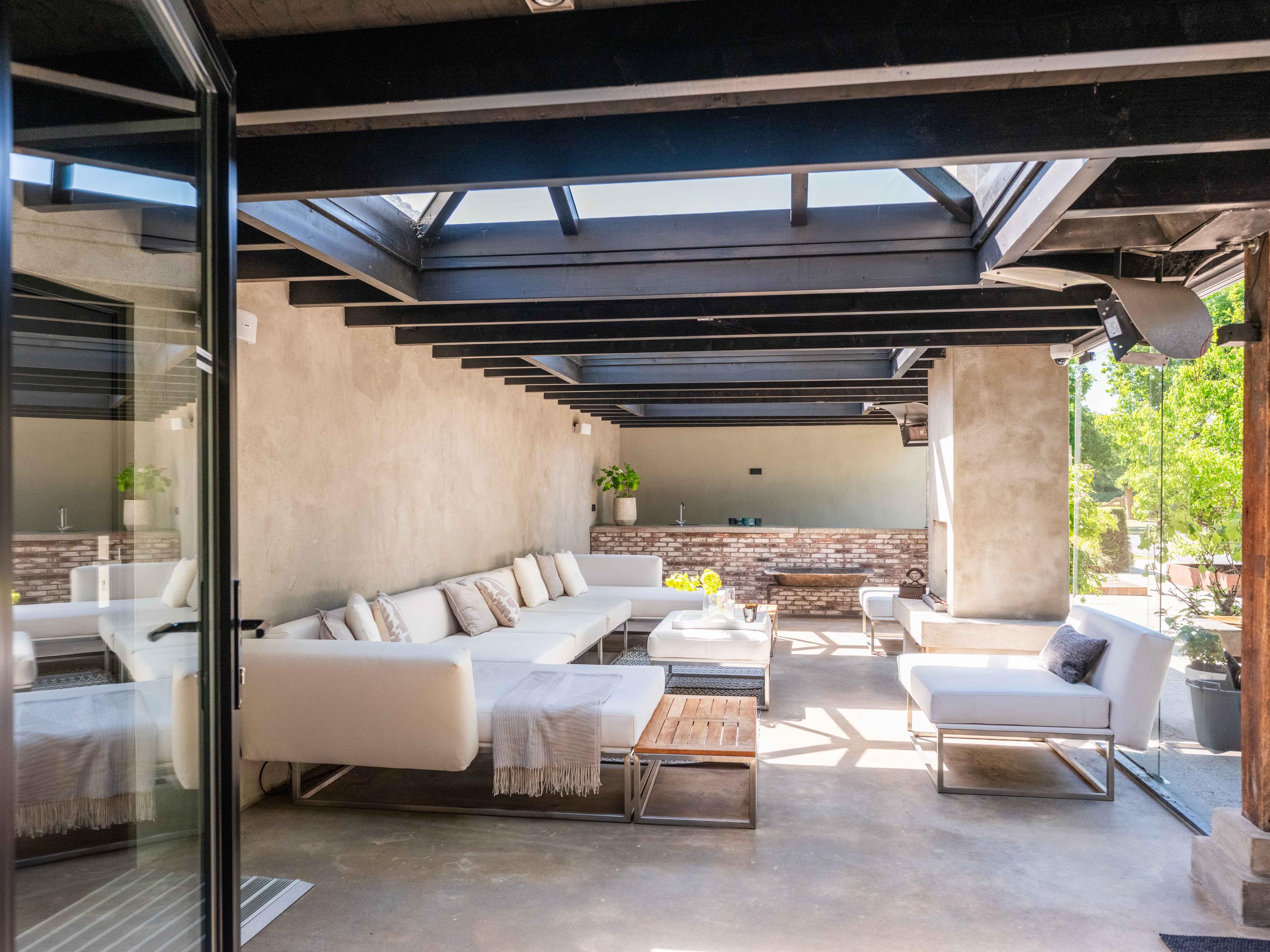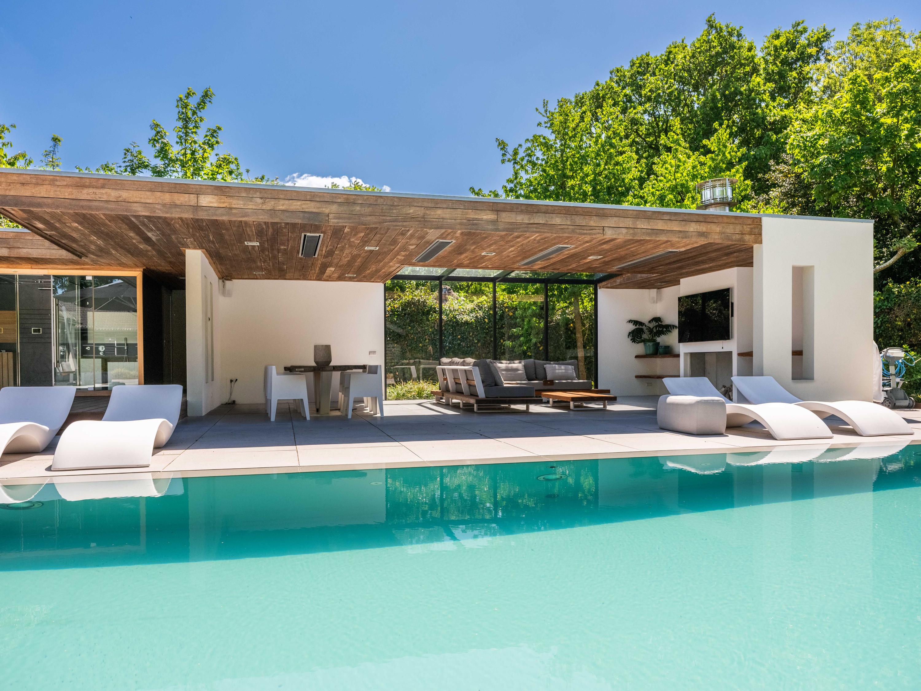 Naast de garage bevindt zich een bijgebouw dat over verschillende faciliteiten beschikt en voor diverse doeleinden gebruikt kan worden. Dit huisje biedt tevens een prachtig uitzicht over de kavel en het zwembad.