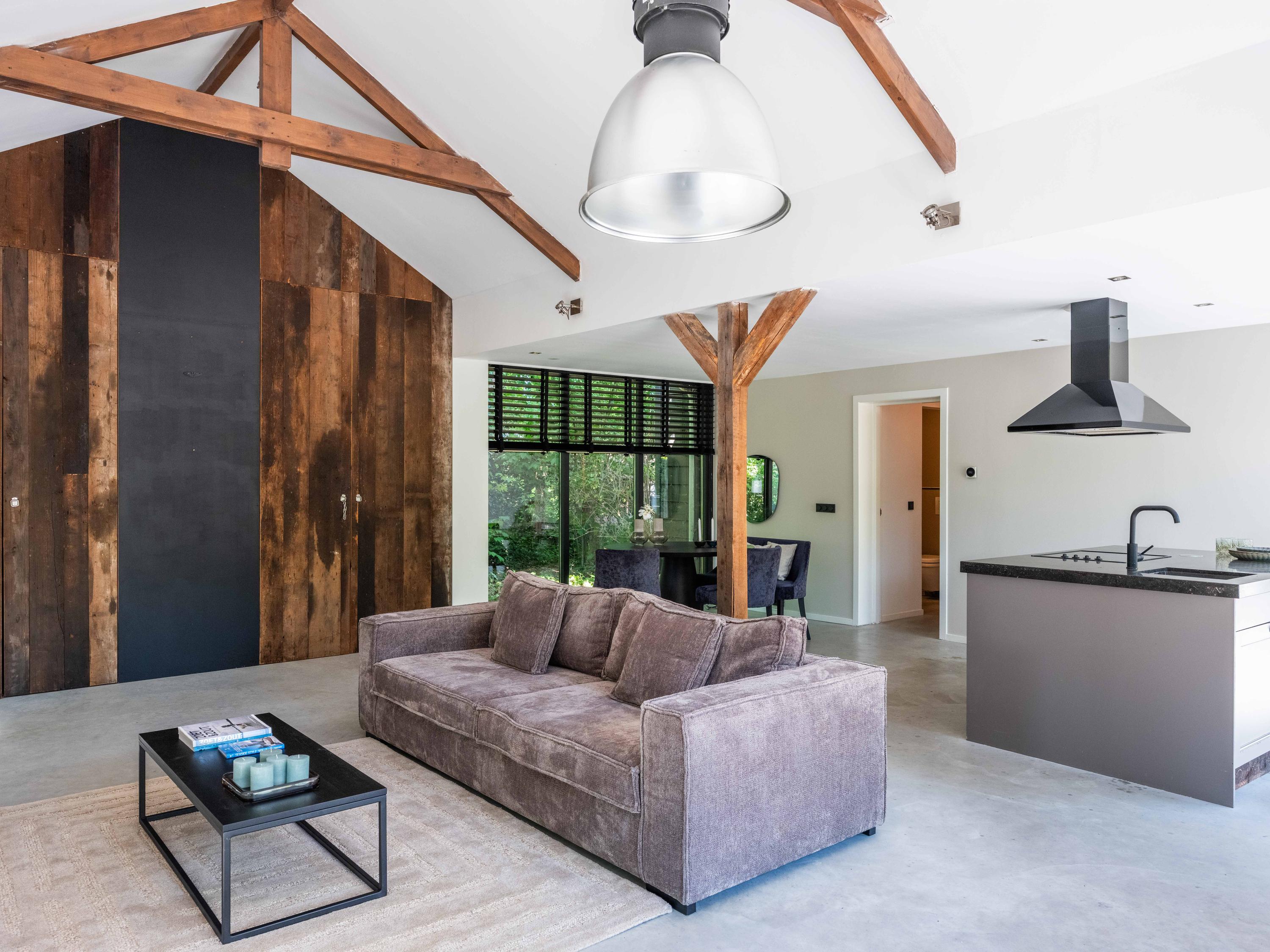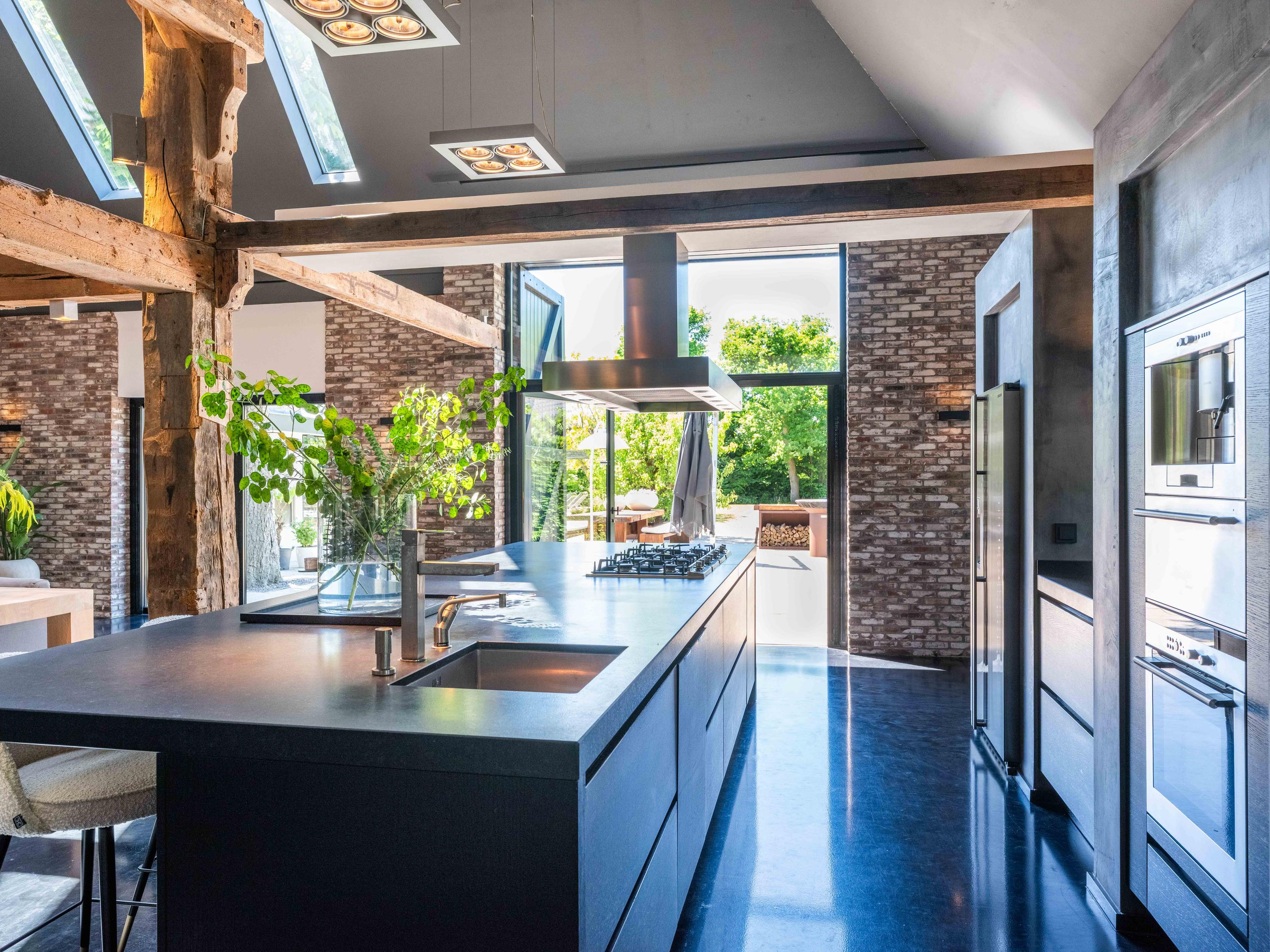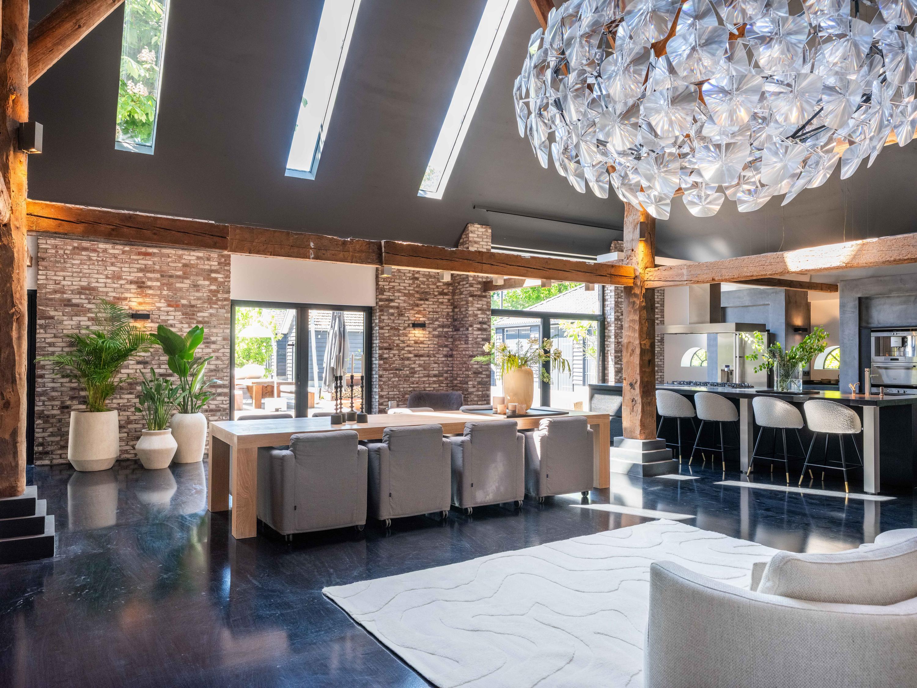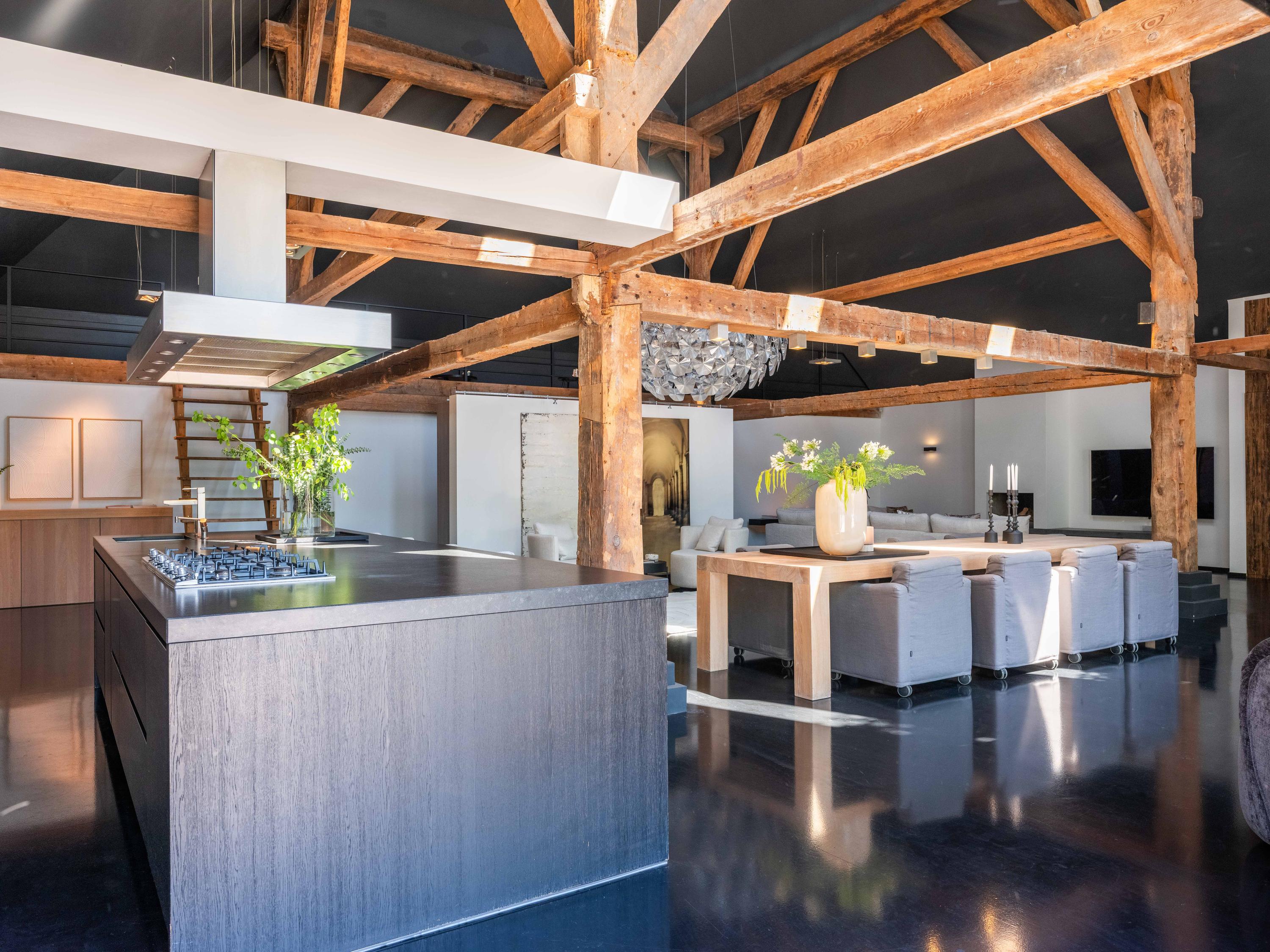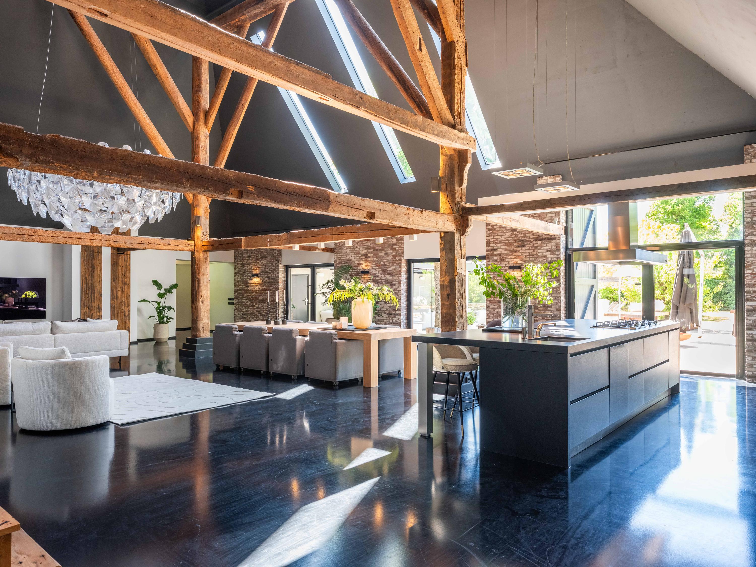 In de woonkamer valt de ruimte gelijk op. Het contrast van de kleuren in de woning versterken het stoere karakter van de woning. Deze zeer ruime living heeft een open haard en openslaande deuren naar de tuin. De moderne open keuken is uitgerust met diverse inbouwapparatuur, waaronder een Boretti 8-pits fornuis, een Amerikaanse koelkast met koffieapparaat en bordenwarmer, oven, en een ingebouwde koel- en vaatwasapparatuur. Er is tevens een vide aanwezig.