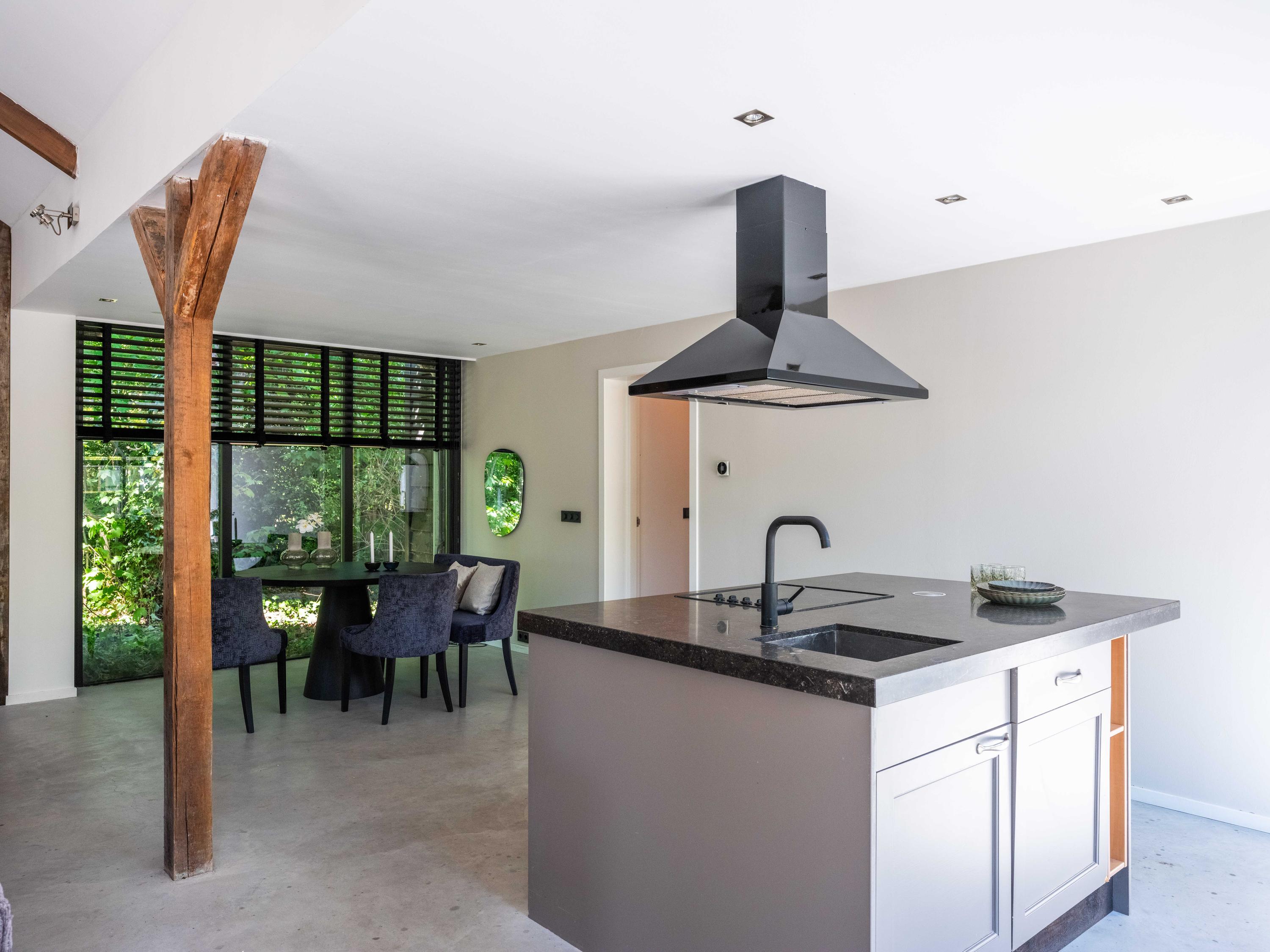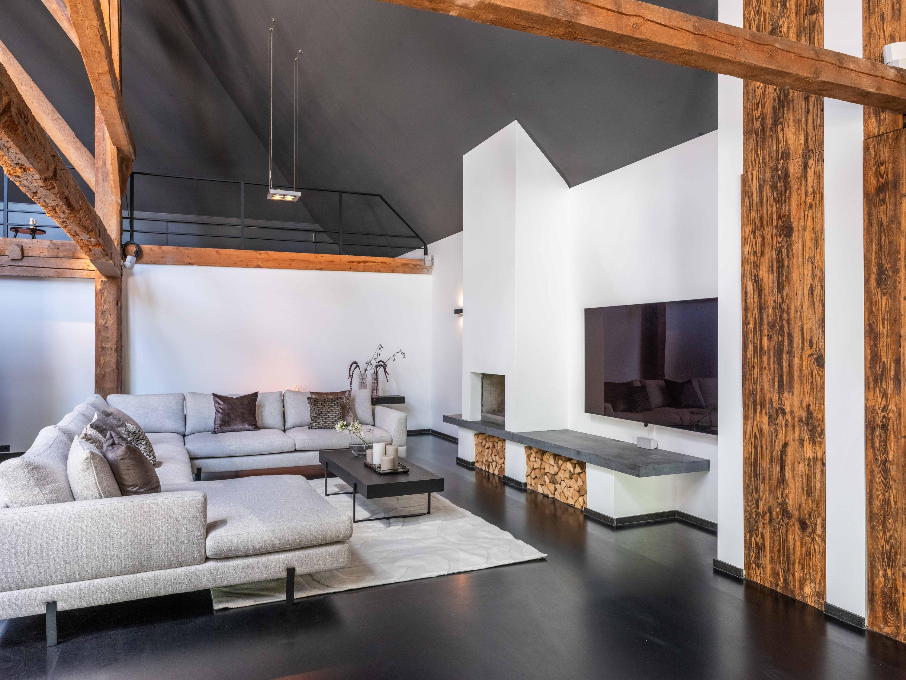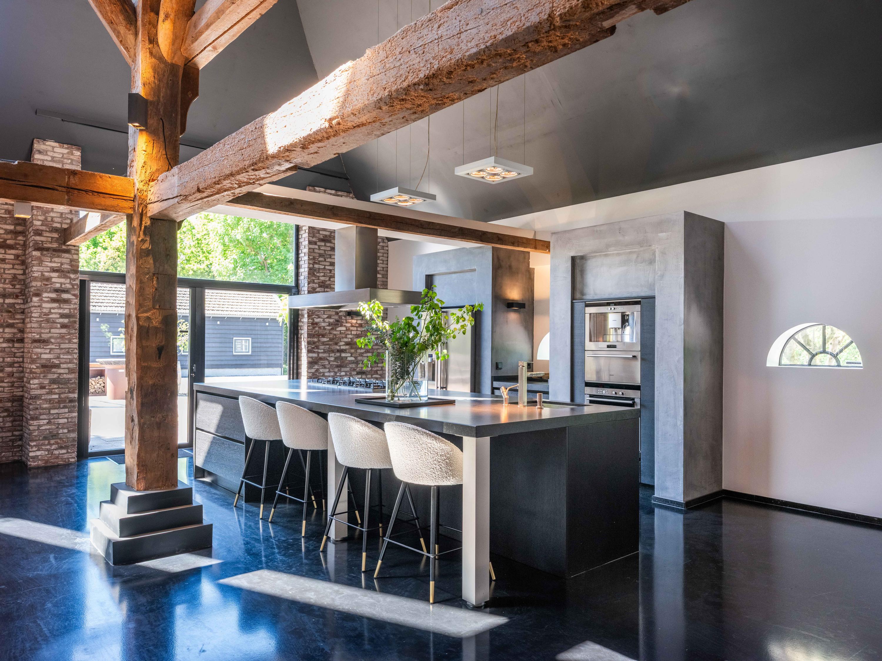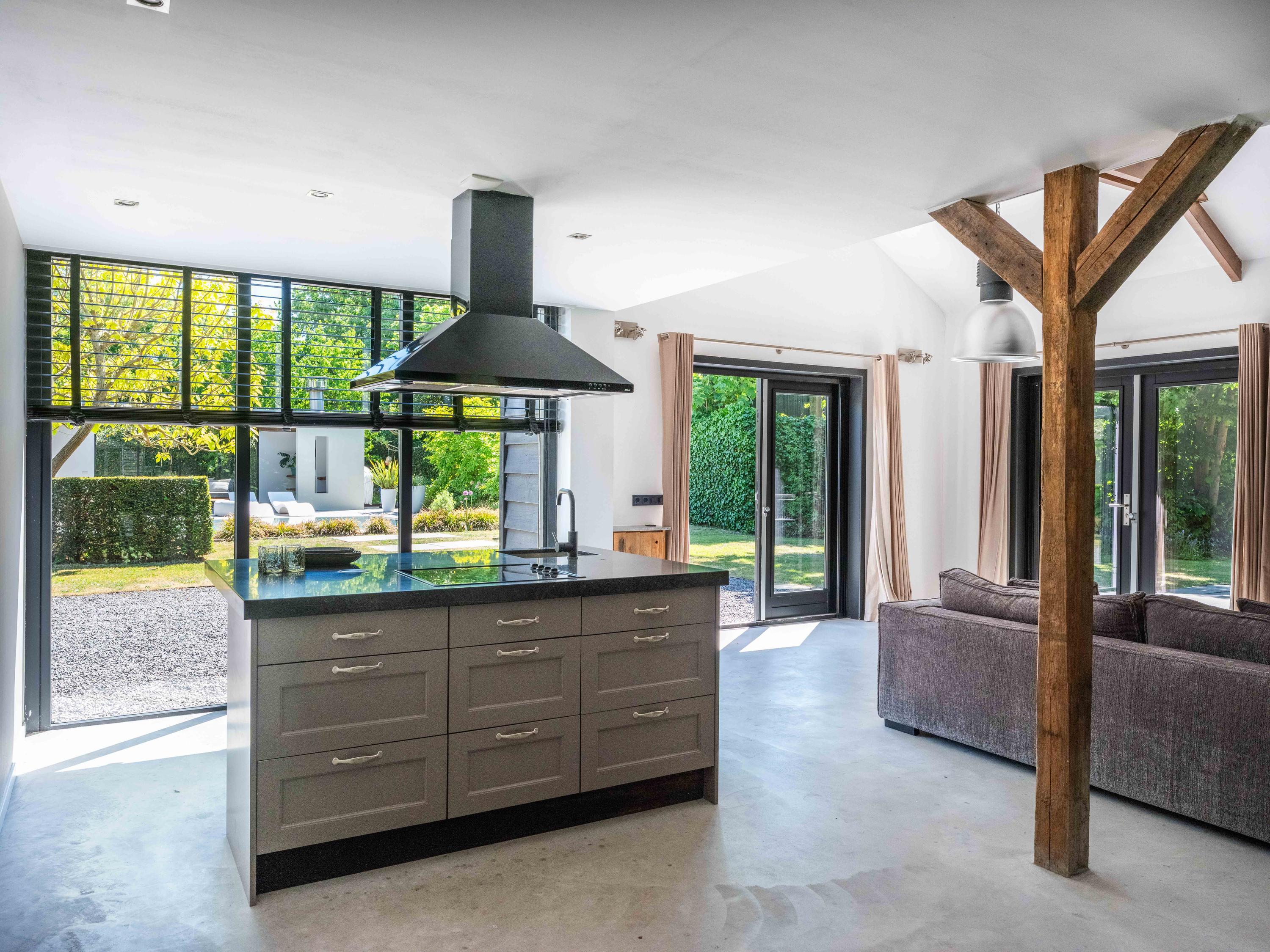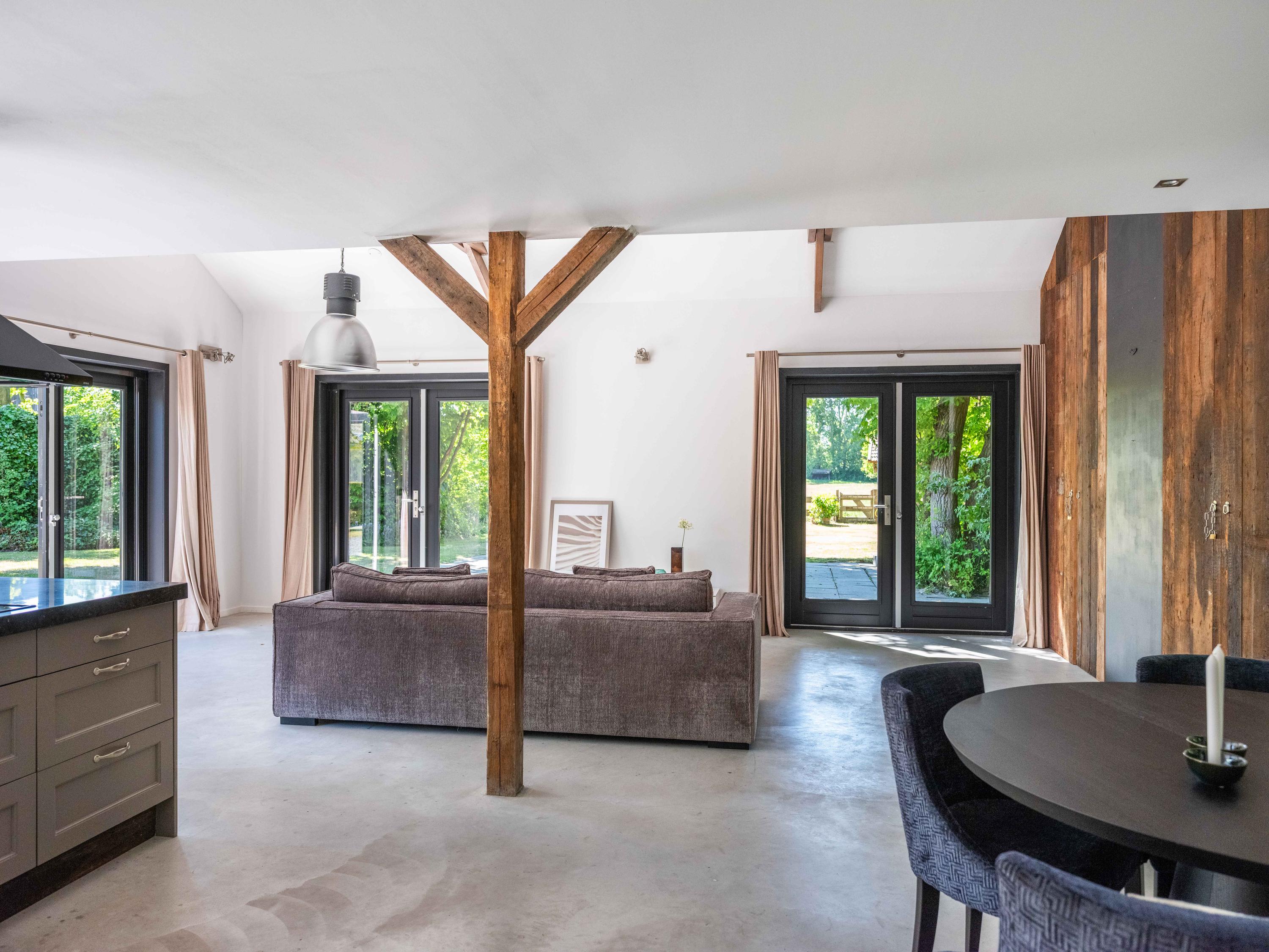 In de woonkamer valt de ruimte gelijk op. Het contrast van de kleuren in de woning versterken het stoere karakter van de woning. Deze zeer ruime living heeft een open haard en openslaande deuren naar de tuin. De moderne open keuken is uitgerust met diverse inbouwapparatuur, waaronder een Boretti 8-pits fornuis, een Amerikaanse koelkast met koffieapparaat en bordenwarmer, oven, en een ingebouwde koel- en vaatwasapparatuur. Er is tevens een vide aanwezig.