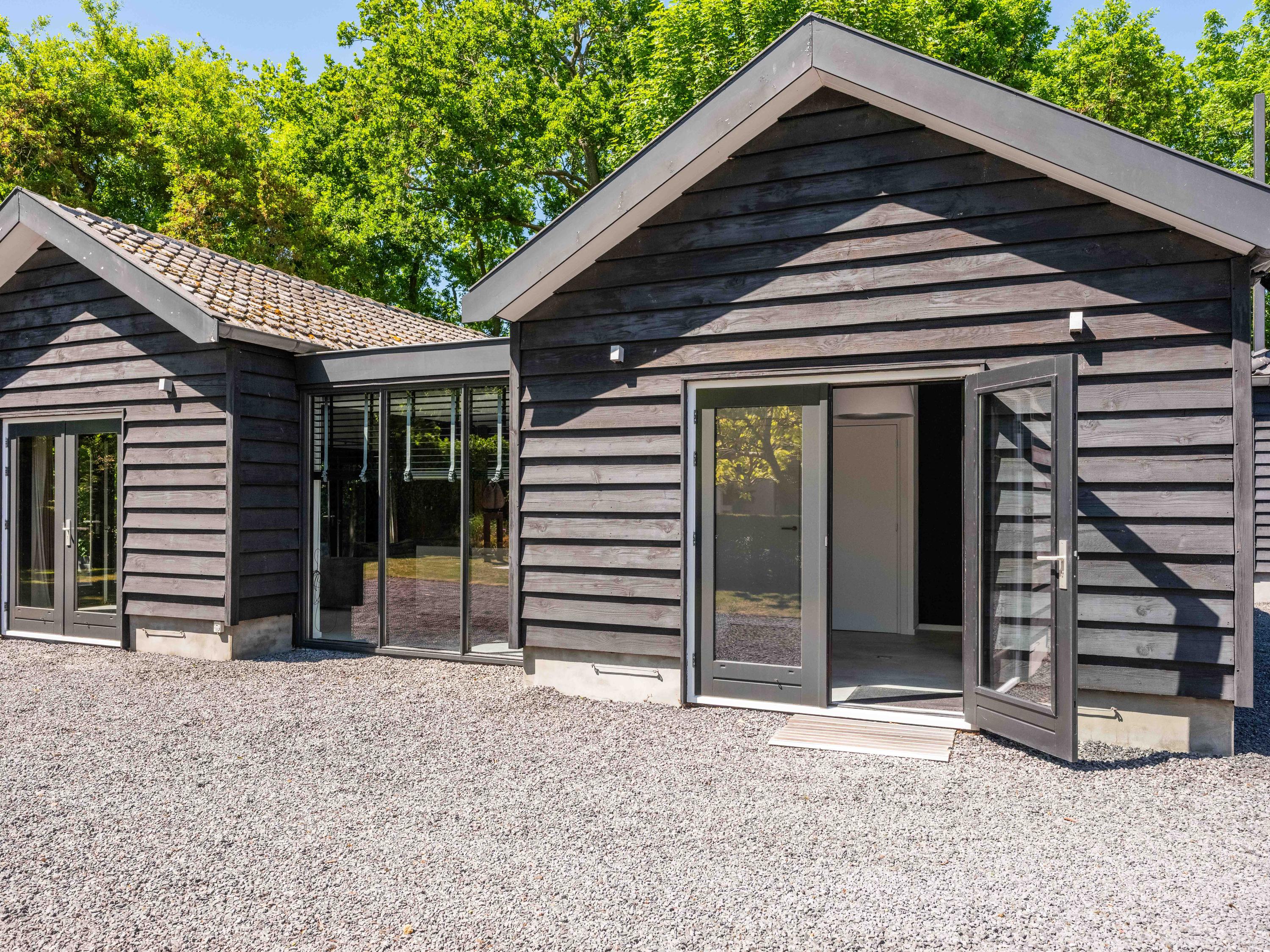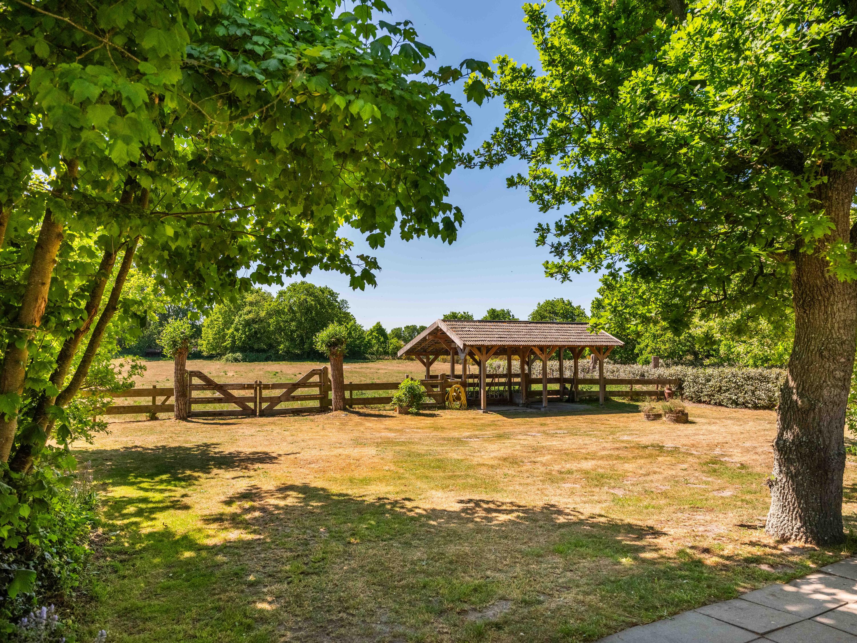 Aan de achterzijde van deze ruime kavel een eigen grote weide met schuilstal. Ideaal om bijvoorbeeld paarden vrij te kunnen laten lopen.