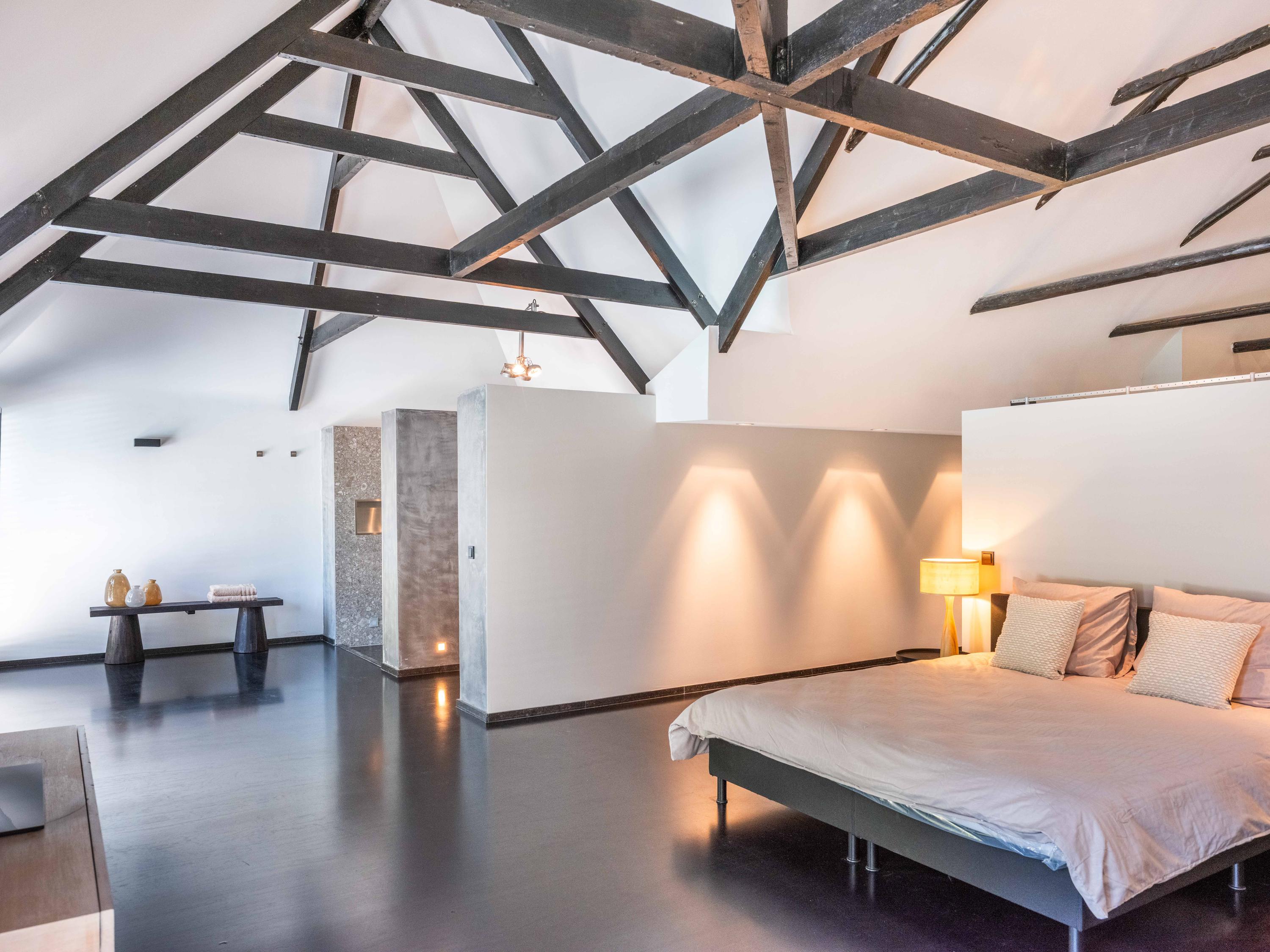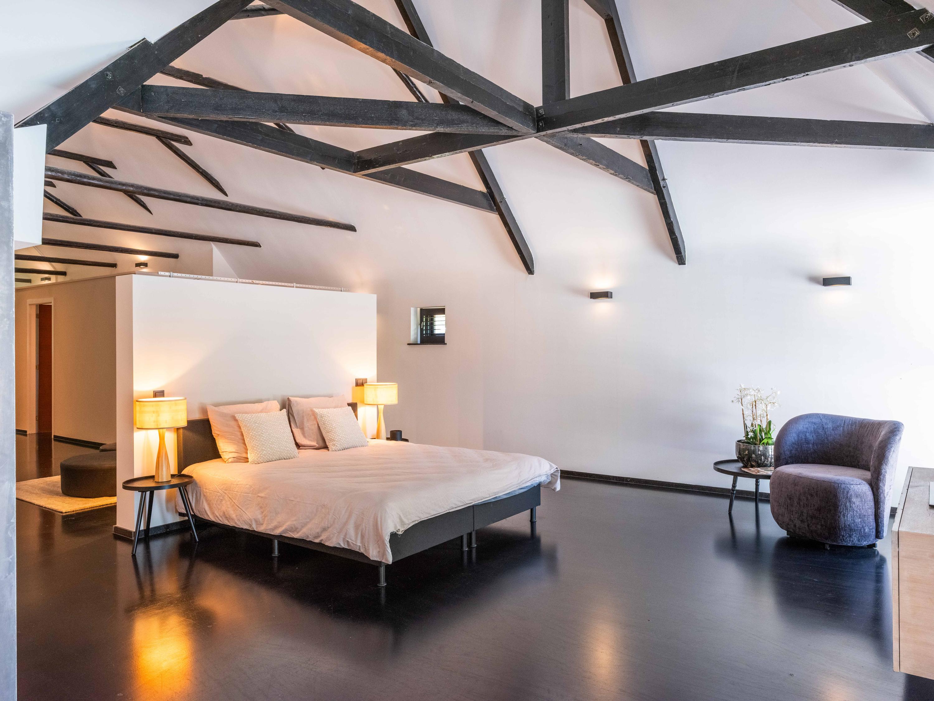 Ook vanuit de woonkamer zijn er doorgangen naar een separaat toilet, verschillende bergingen en de master bedroom in de aangrenzende vleugel. Deze slaapkamer beschikt over een ruime inloopkast en een open badkamer met dubbele wastafels. De badkamer is voorzien van een ruime douche met zitplaats en een toilet. Het uitzicht vanuit zowel de slaapkamer als de badkamer is gericht op het zwembad, wat de luxe van de woning nog eens extra benadrukt en een wellness beleving creëert.