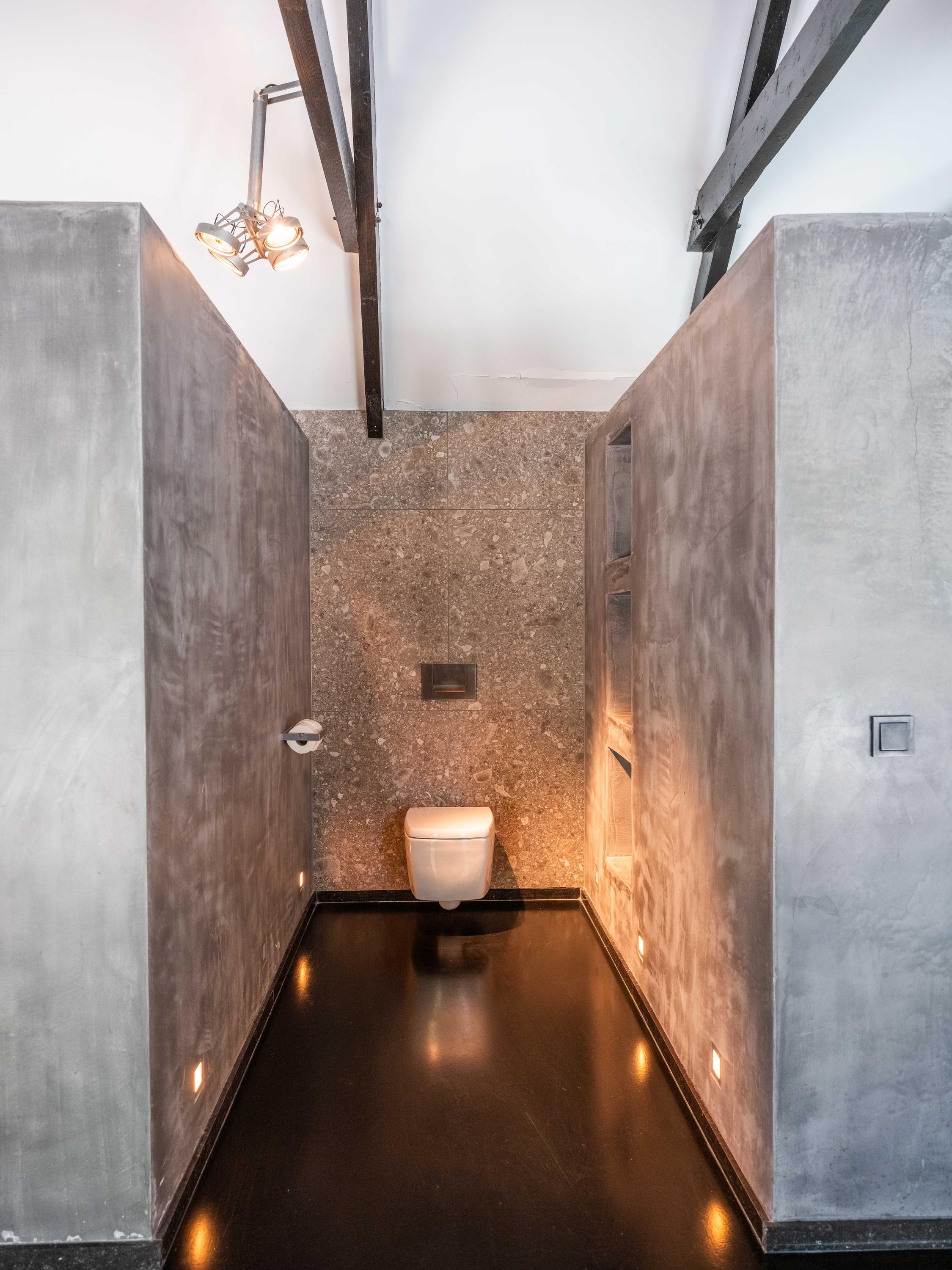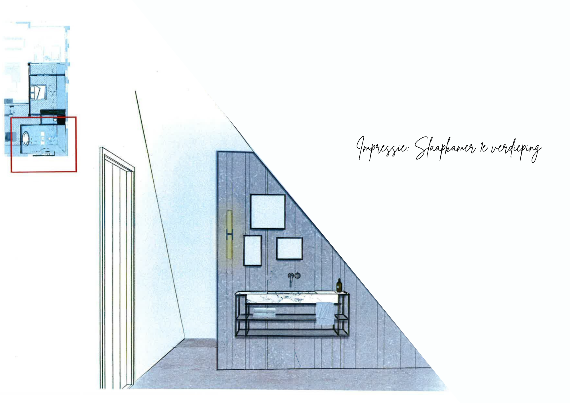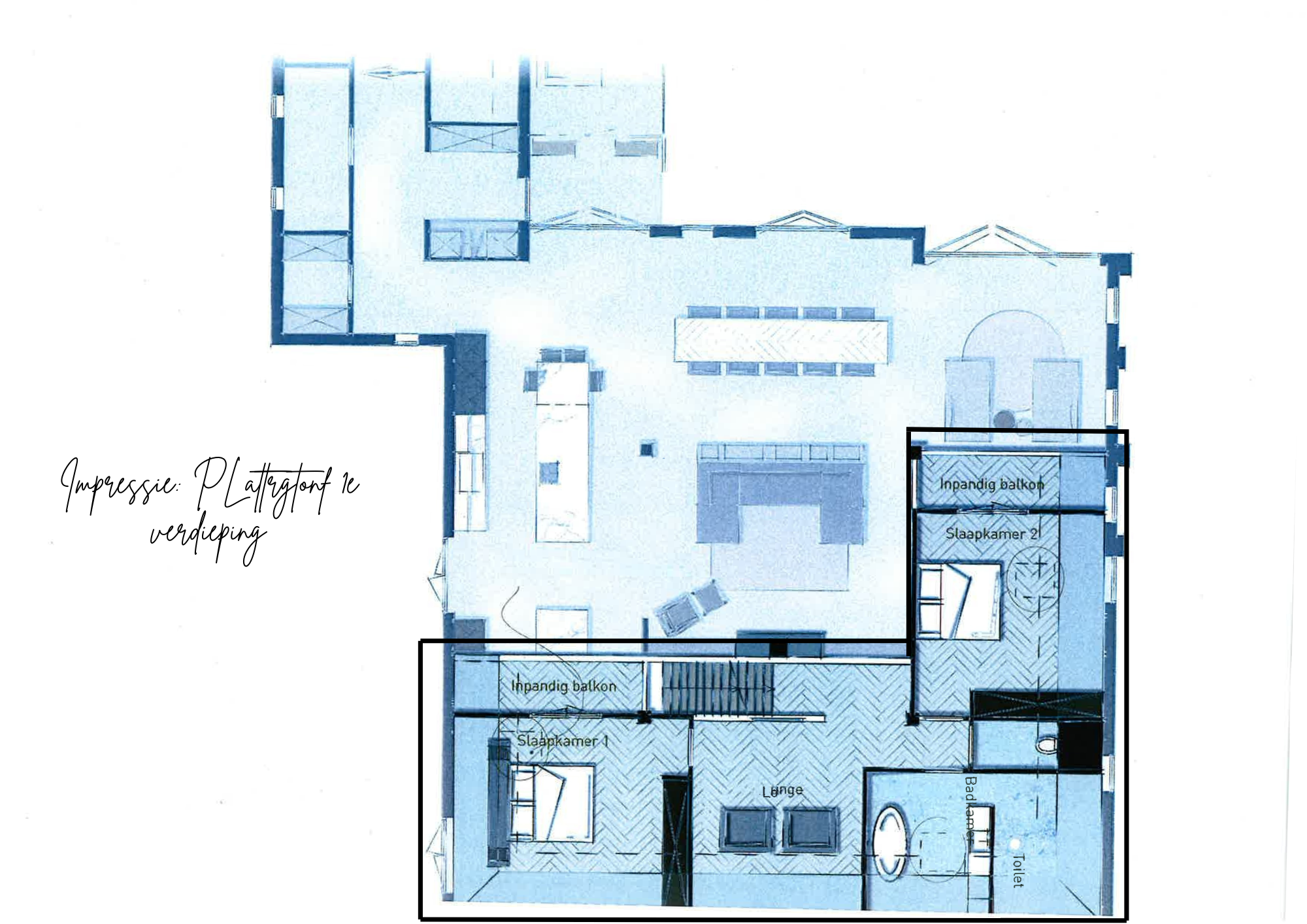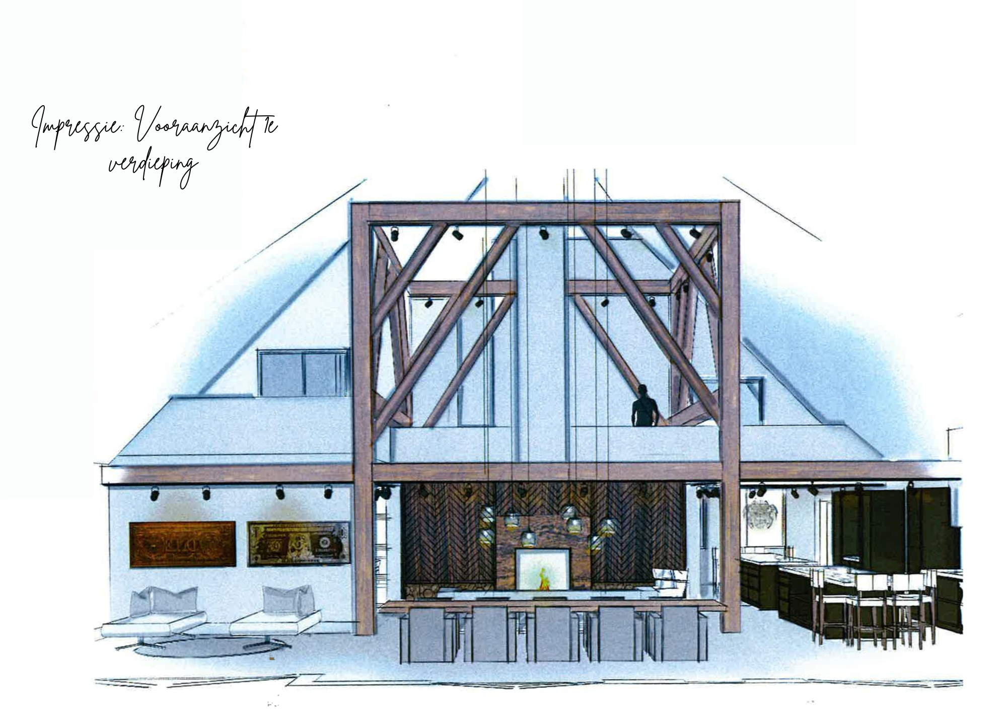 Alle faciliteiten bevinden zich op de begane grond, wat de woning extra toegankelijk maakt. De grote raampartijen zorgen voor veel lichtinval, waardoor de ruimtes ruimtelijk en uitnodigend aanvoelen. In de woonkamer is bovendien een trap naar de vide boven de kamers aan de voorzijde. Bij de foto’s zijn tekeningen toegevoegd die de mogelijkheid tonen om hier een verdieping met slaapkamers te creëren.