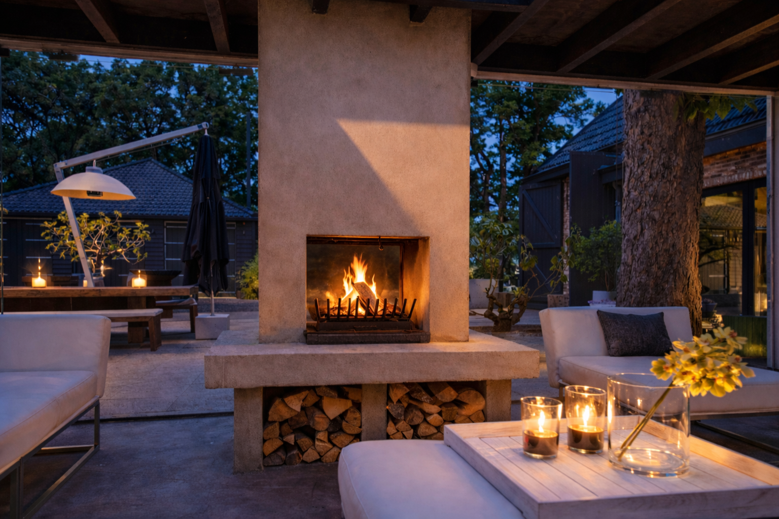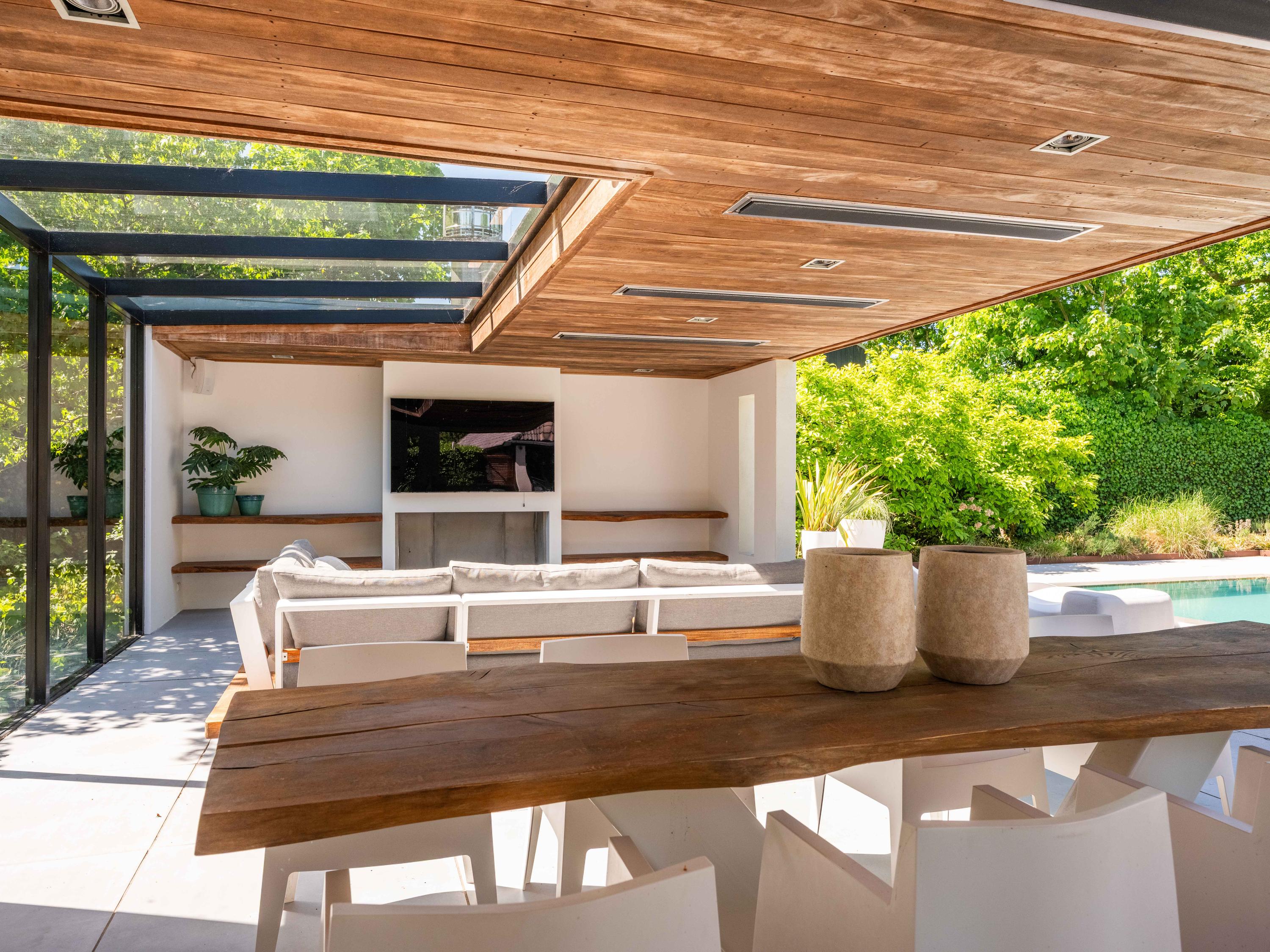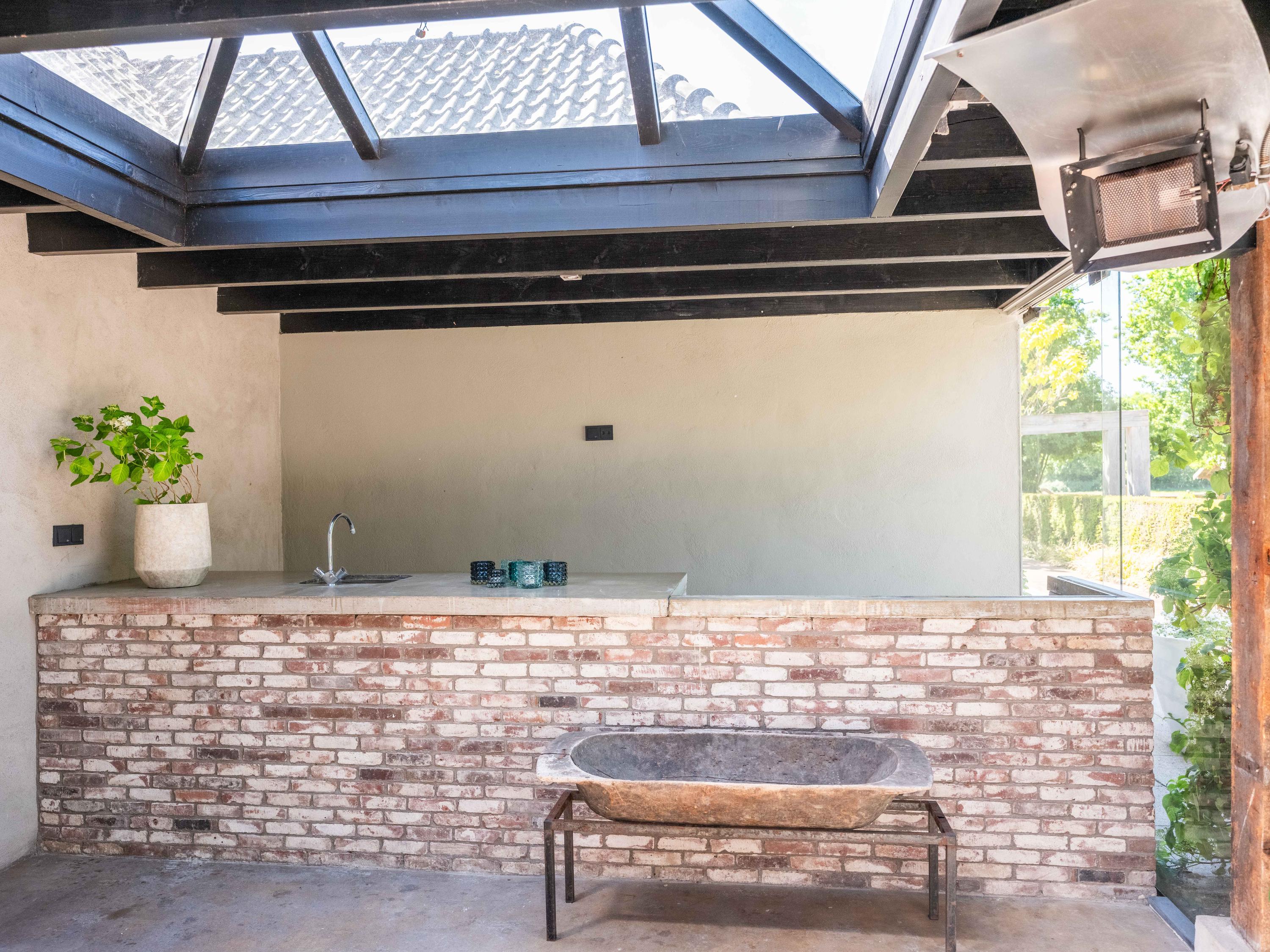 Vanuit de woonkamer heeft u toegang tot de serre, deze is uitgerust met een open haard, een pantry en een grote loungehoek. Vanuit de serre heeft u prachtig uitzicht over de ruim aangelegde tuin.