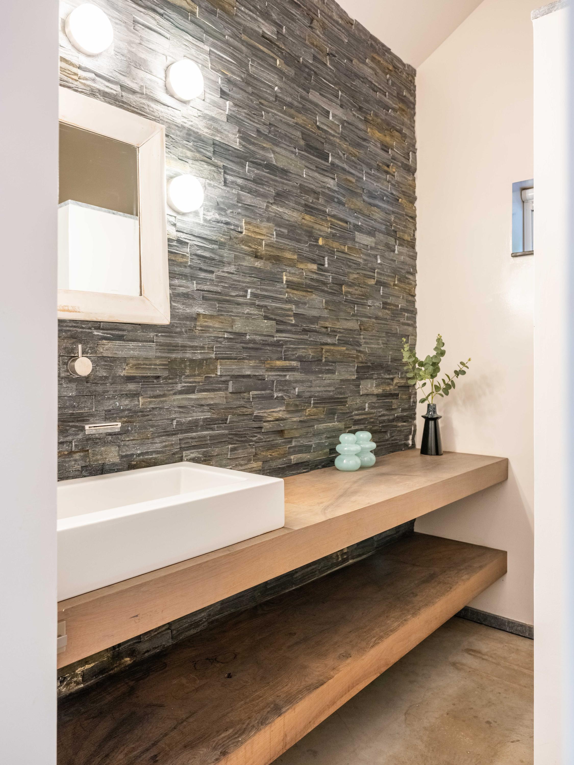 Bij het betreden van deze woonboerderij komt u aan de voorzijde in een ruime hal die toegang biedt tot de eerste slaapkamer aan de linkerzijde en aan de rechterzijde een tweede slaap- of werkkamer met een naastgelegen badkamer. De kamer naast de badkamer biedt veel flexibiliteit en kan zowel als werkruimte of als slaapkamer worden gebruikt. De badkamer is voorzien van een ligbad, toilet, wastafel en een inloopdouche. In de hal bevindt zich verder de meterkast.