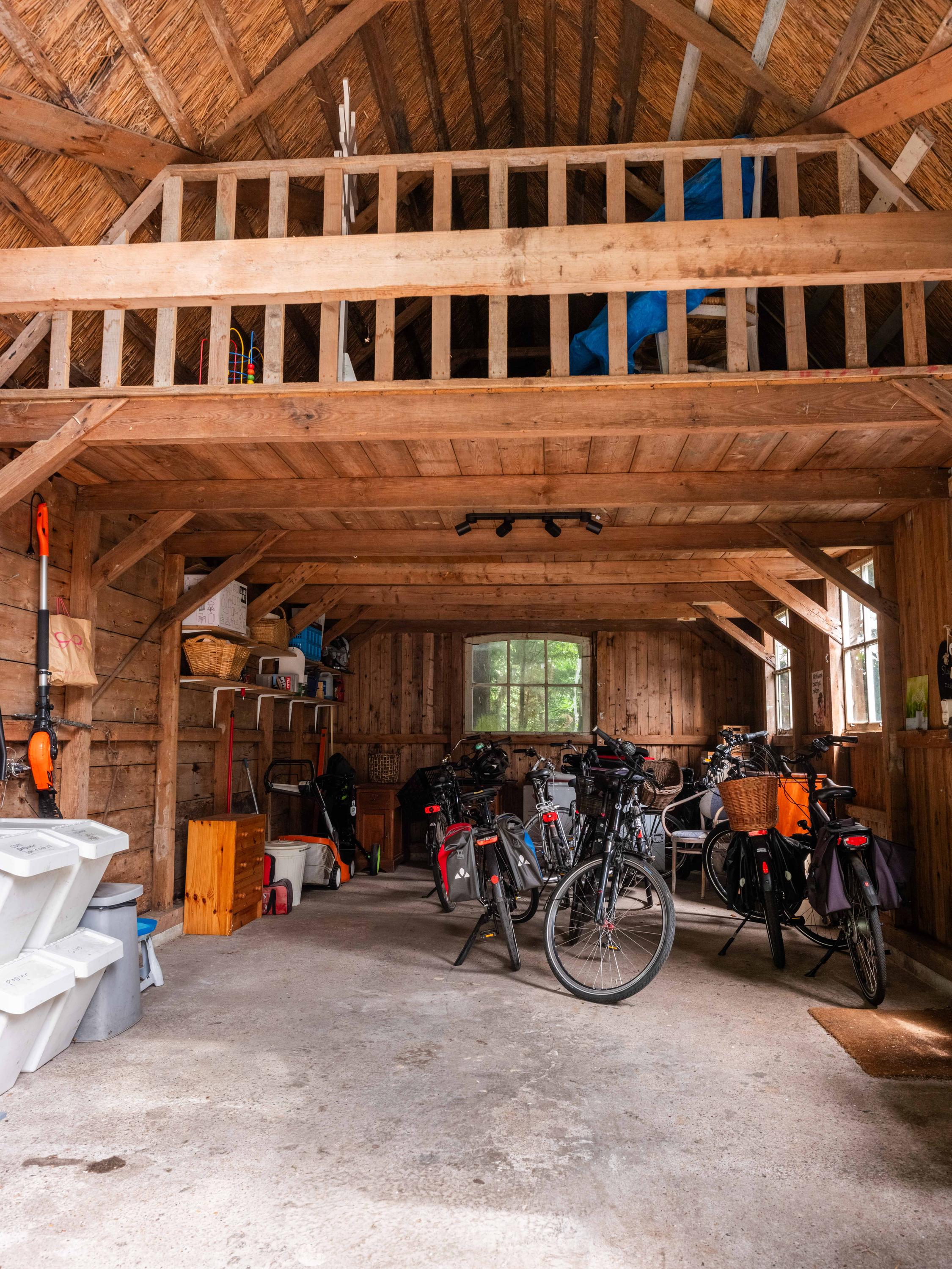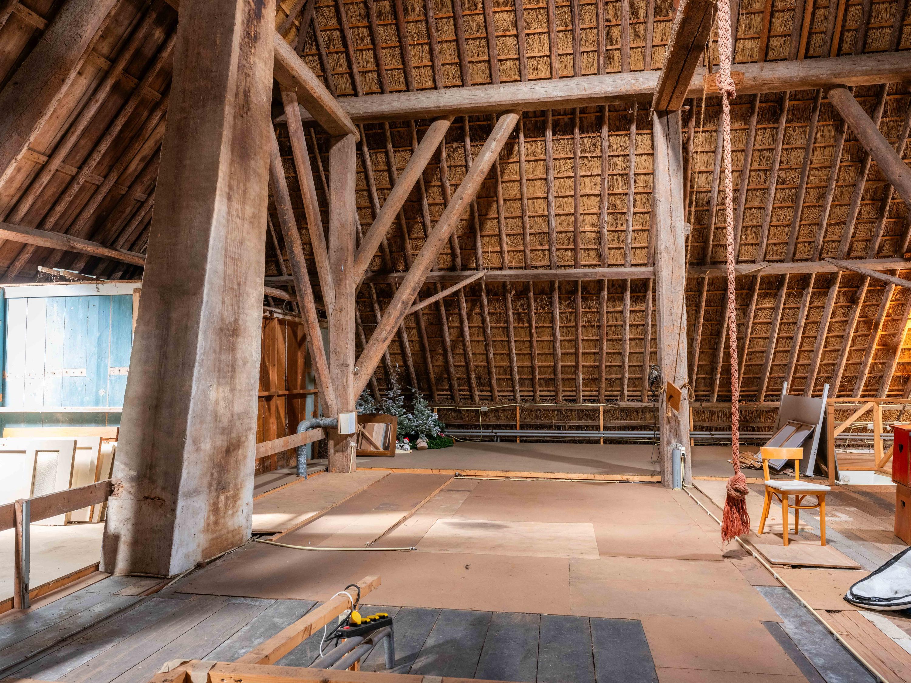 De eerste verdieping van de boerderij, nu een inpandige bergruimte, is nog helemaal naar eigen inzicht in te delen en te verbouwen naar extra woonruimte. Een gigantisch grote ruimte met direct zicht op de houten balken en de rieten kap. Wel vinden we hier nog de oude verwarmde knechtenkamer, deze dient nu als opslagruimte.