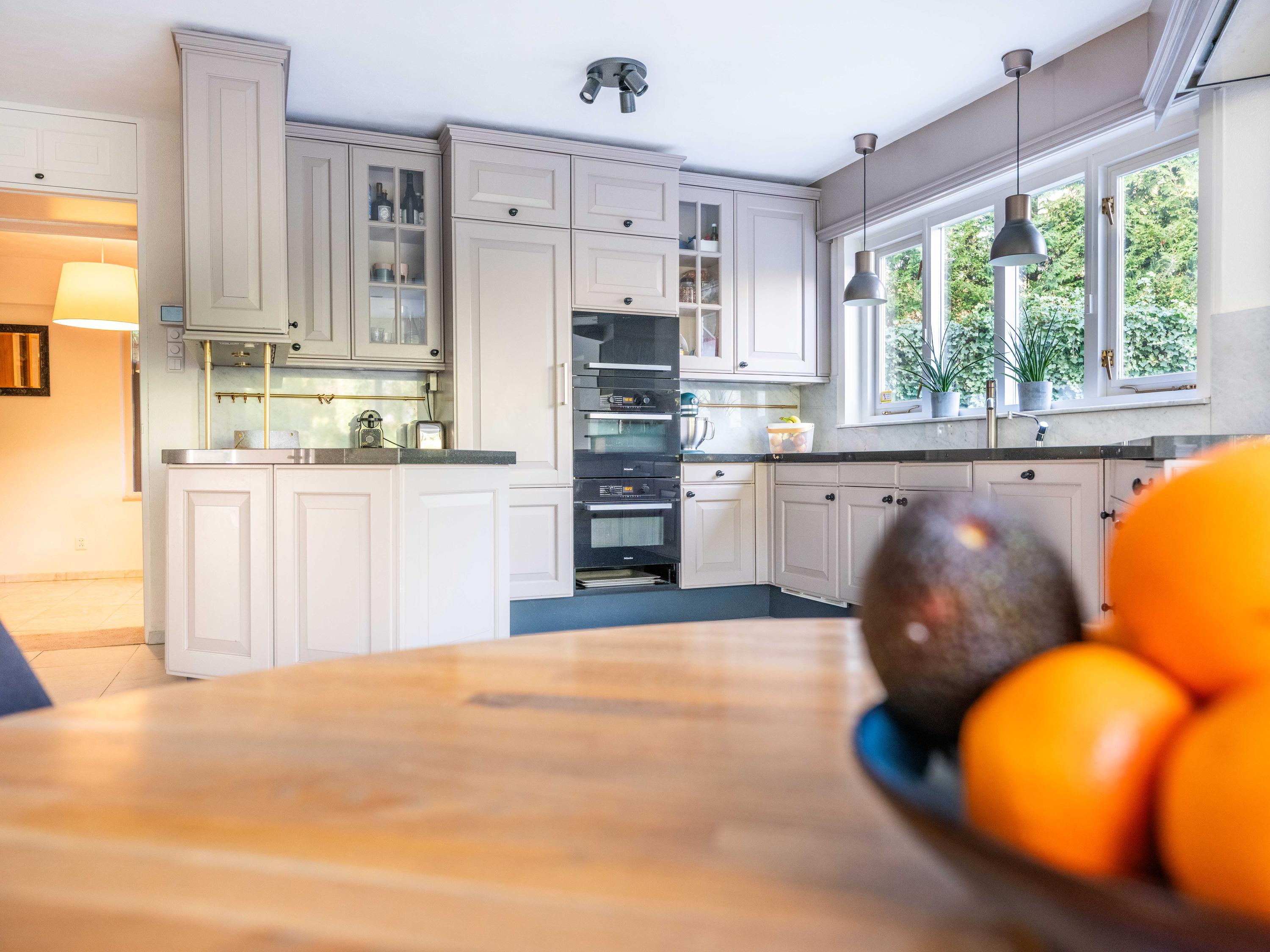 Vanuit de hal betreden we de ruime woonkeuken, deze is voorzien van allerhande inbouwapparatuur, zoals een vijfpits inductiekookplaat, quooker, steamer, twee combi ovens enz. De kookliefhebber kan hier heerlijk zijn gang gaan.