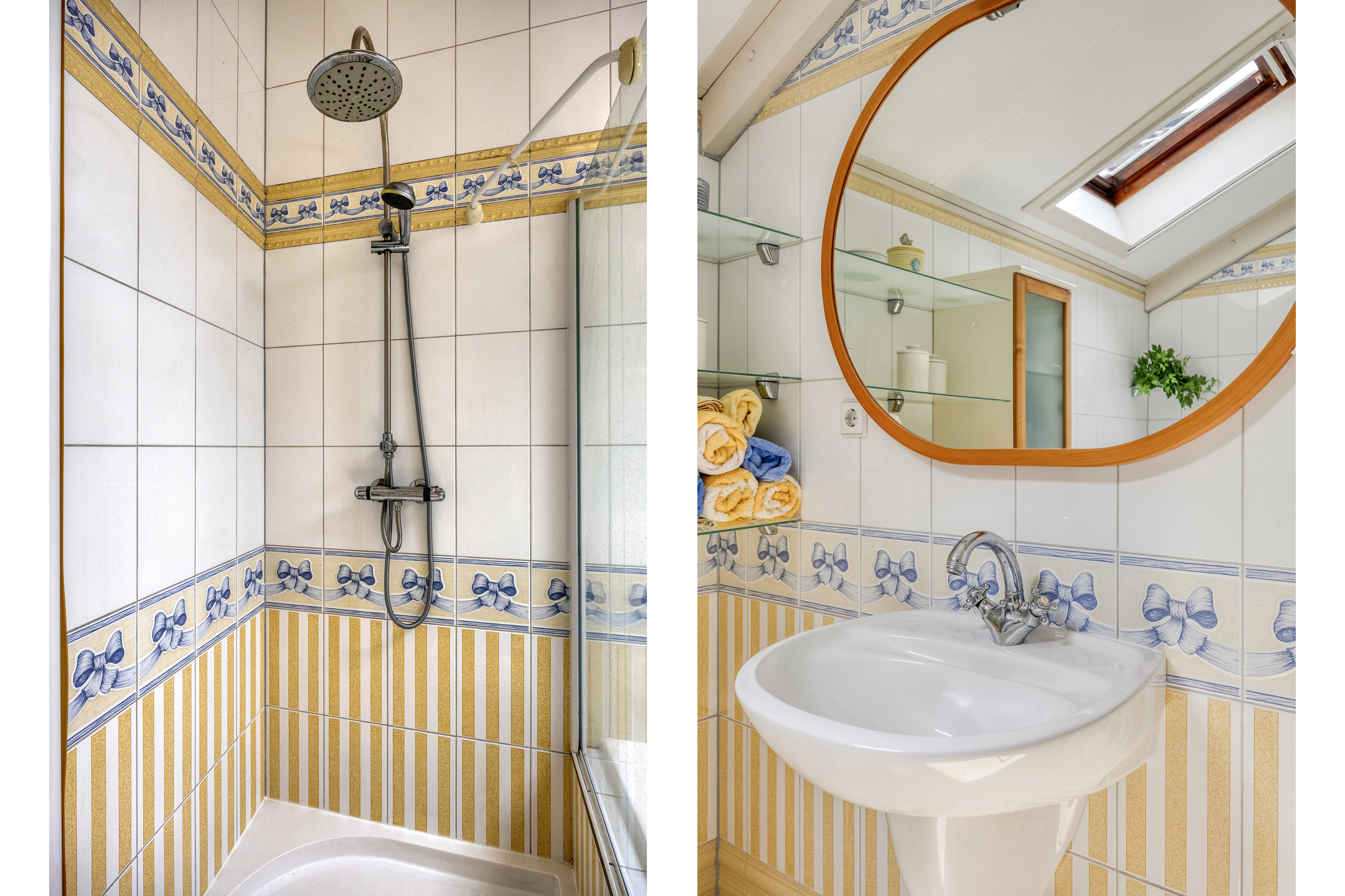 De badkamer is voorzien van een ligbad, douche, handdoekradiator