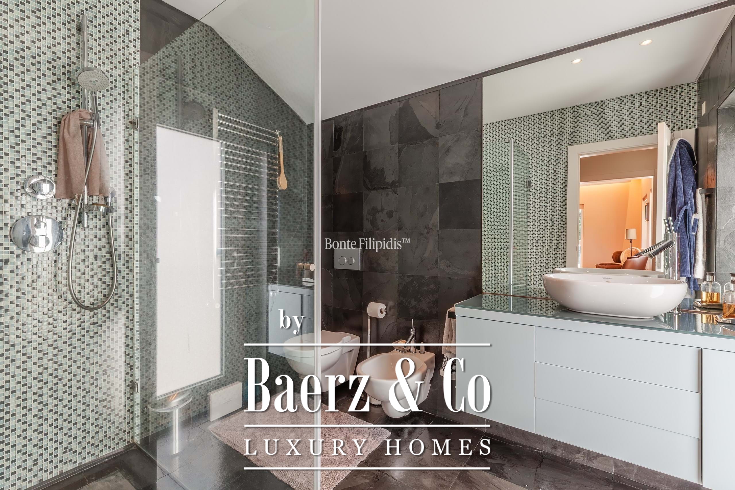 Het interieur van 448 m² is verdeeld over vier niveaus, telkens bereikbaar met de lift. Vijf slaapkamers, waaronder een master suite, en zes badkamers bieden een royaal verblijf. De lichte leefzones staan direct in verbinding met de terrassen onder een bioklimatische pergola die zich aanpast aan licht en luchtstroming. De keuken, uitgerust met geavanceerde technologie, ondersteunt stille routines en gastvrijheid.