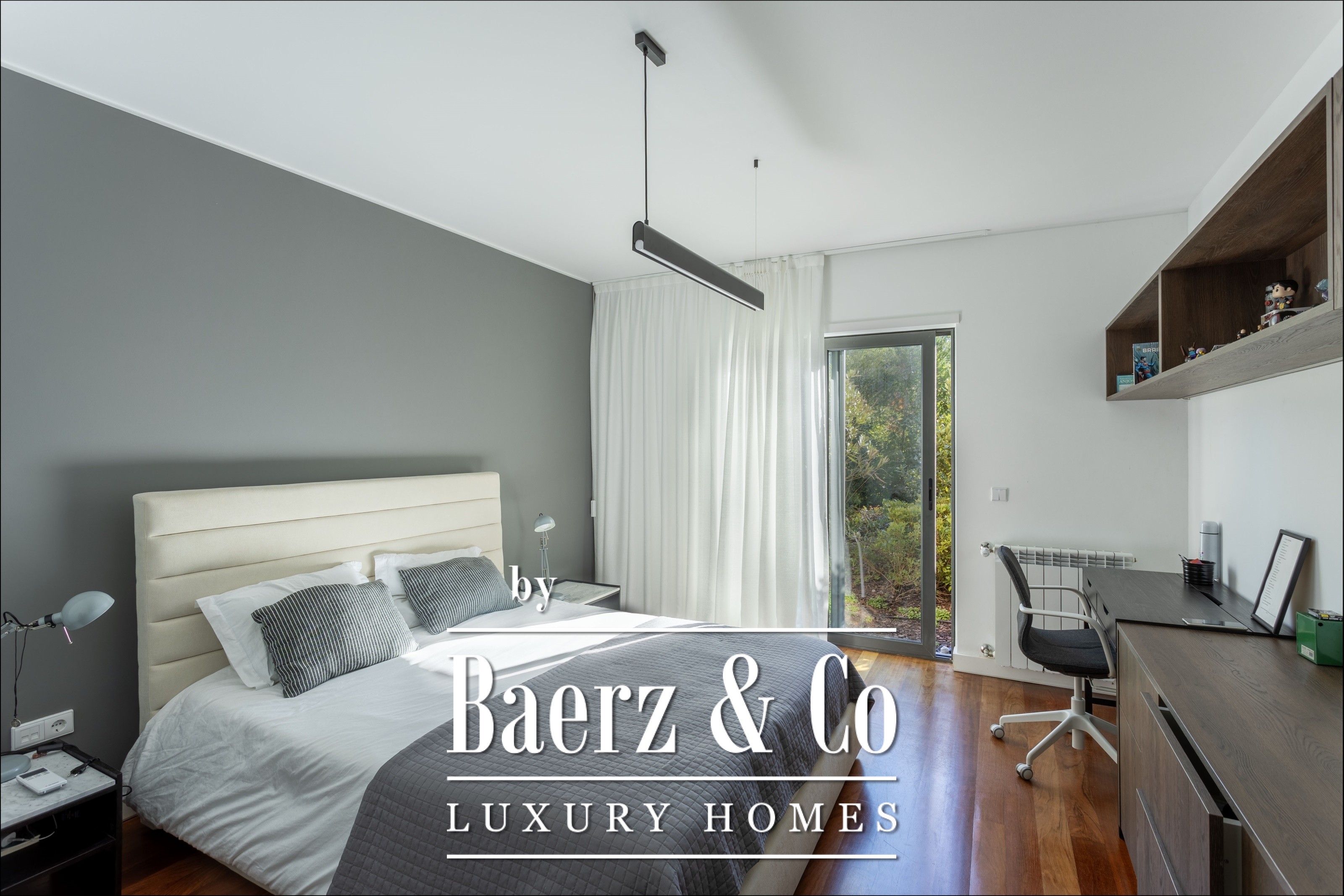 De slaapkamers zijn ingedeeld voor optimale privacy en ritme, alle voorzien van royale inbouwkasten. In het souterrain bevindt zich een afgesloten garage van 74 m² voor drie auto's, een wasruimte en extra bergruimte. Airconditioning en centrale verwarming garanderen het hele jaar door comfort. Het aangelegde domein zorgt voor privacy, terwijl de gezamenlijke buitenruimtes met een omheind zwembad en solarium uitnodigen tot ontspannen genieten.