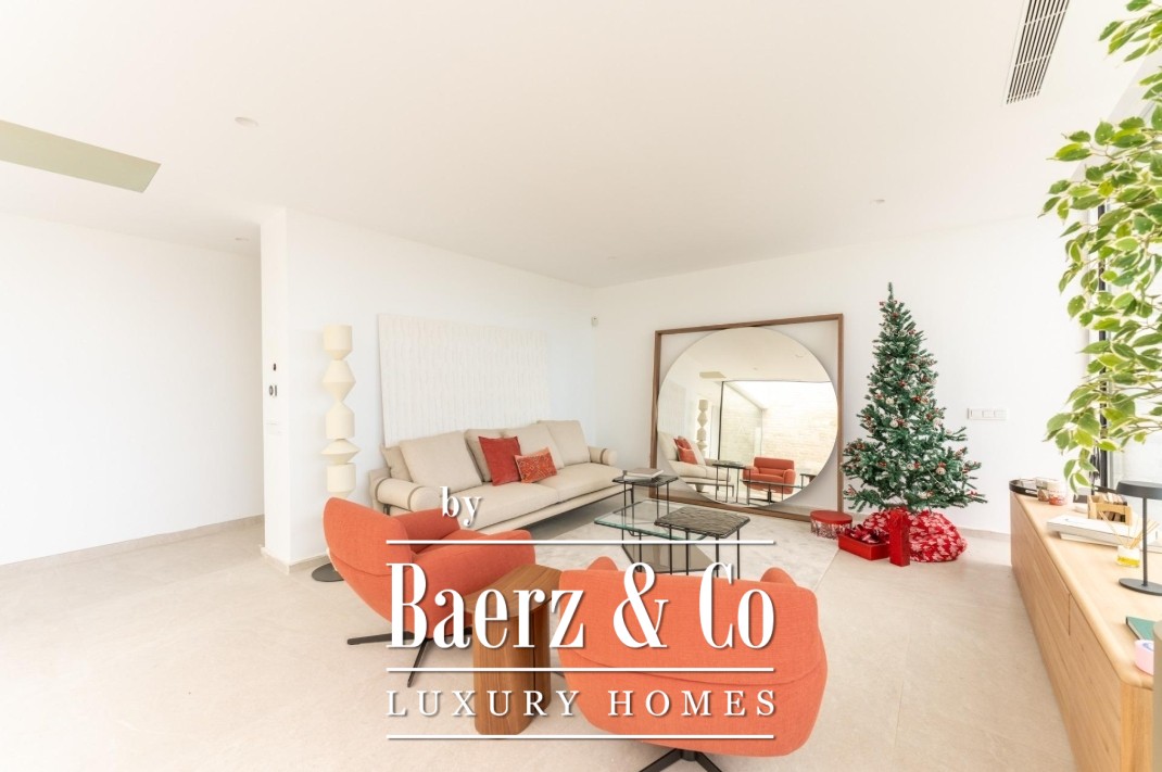 De entree leidt naar de bovenverdieping, waar u de woonkamer, de open keuken met kookeiland, 2 van de slaapkamers en een gastentoilet vindt. De kamerhoge glazen schuifdeuren zorgen voor veel natuurlijk licht in de villa. Een patio dient als een handige eetruimte in de open lucht, hoewel er ook voldoende ruimte is op het terras. Direct buiten de woonkamer ligt het terras met privézwembad en buitendouche.
