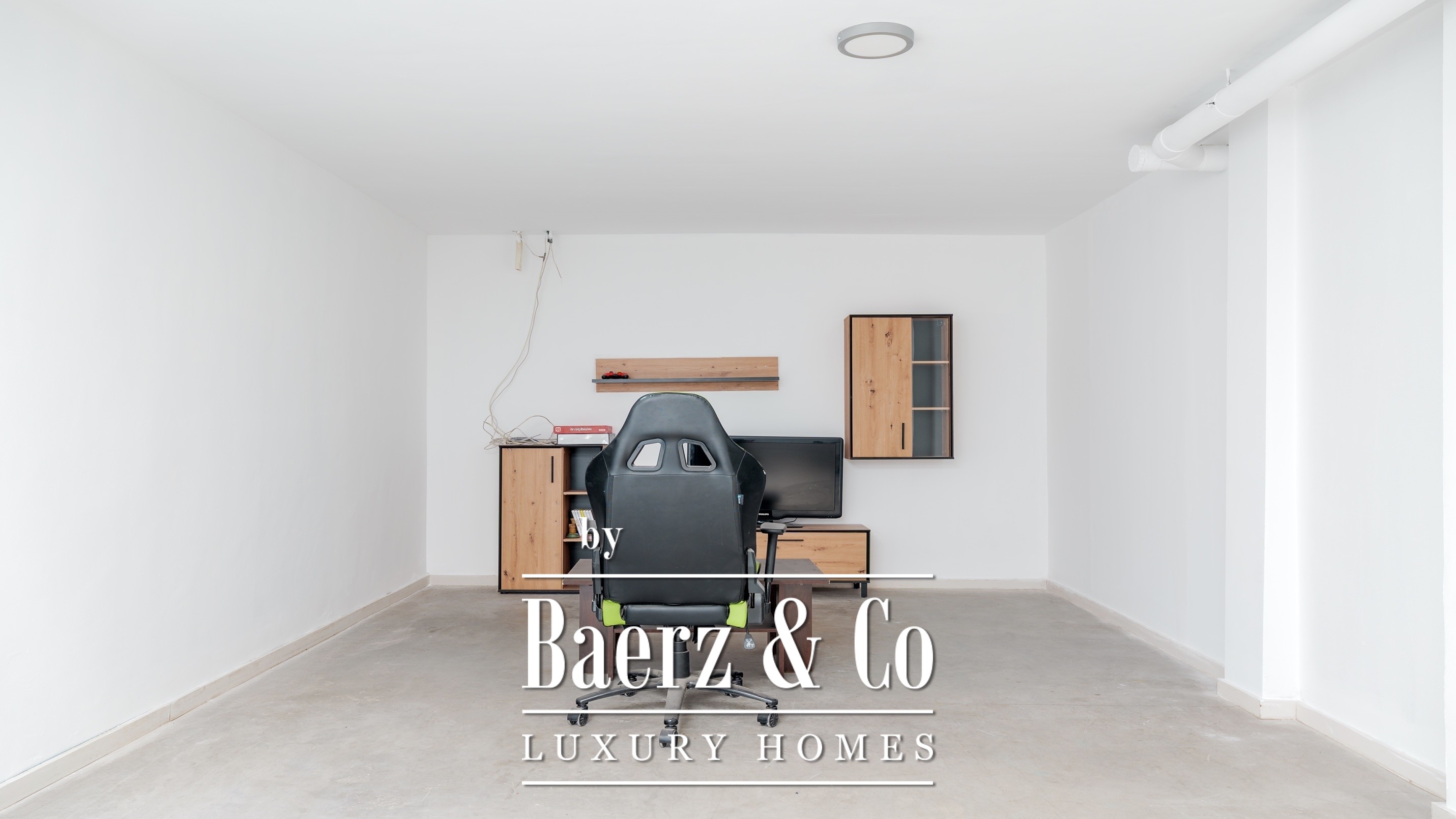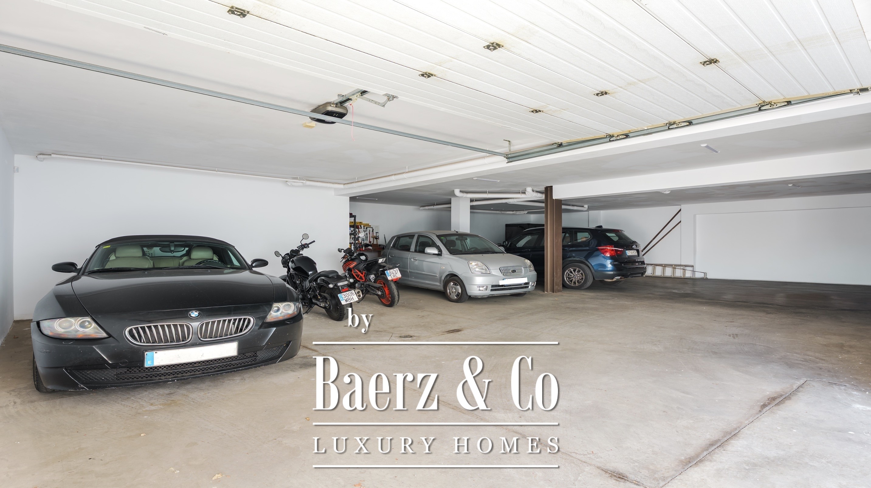 Een afgesloten garage voor meerdere auto's, naast een ruime multifunctionele woonkamer, perfect als fitnessruimte, speelkamer of privébioscoop. Er is ook een berging en een wasruimte.